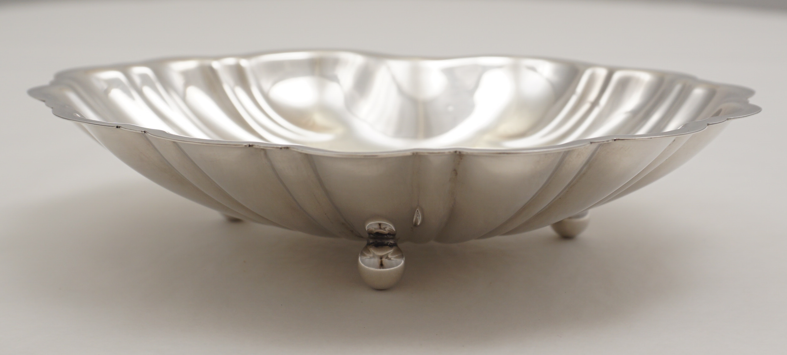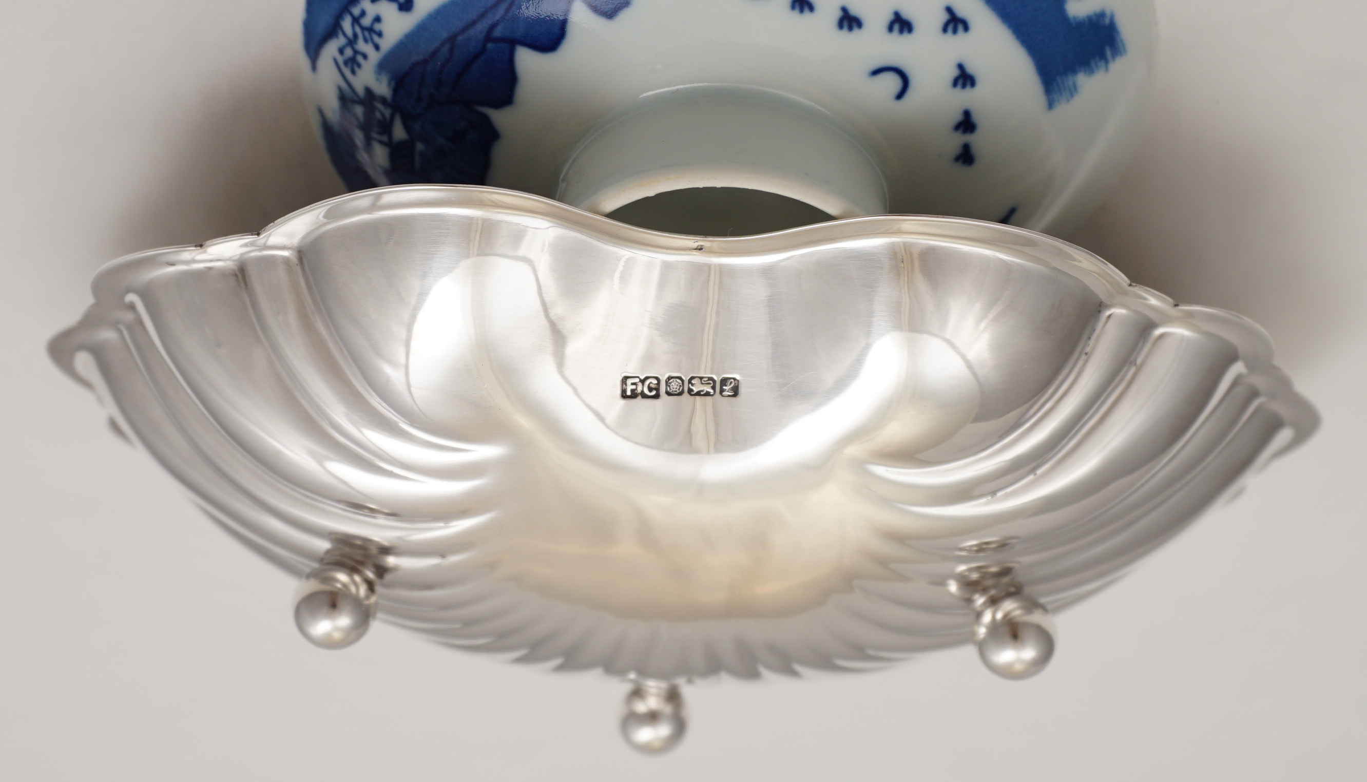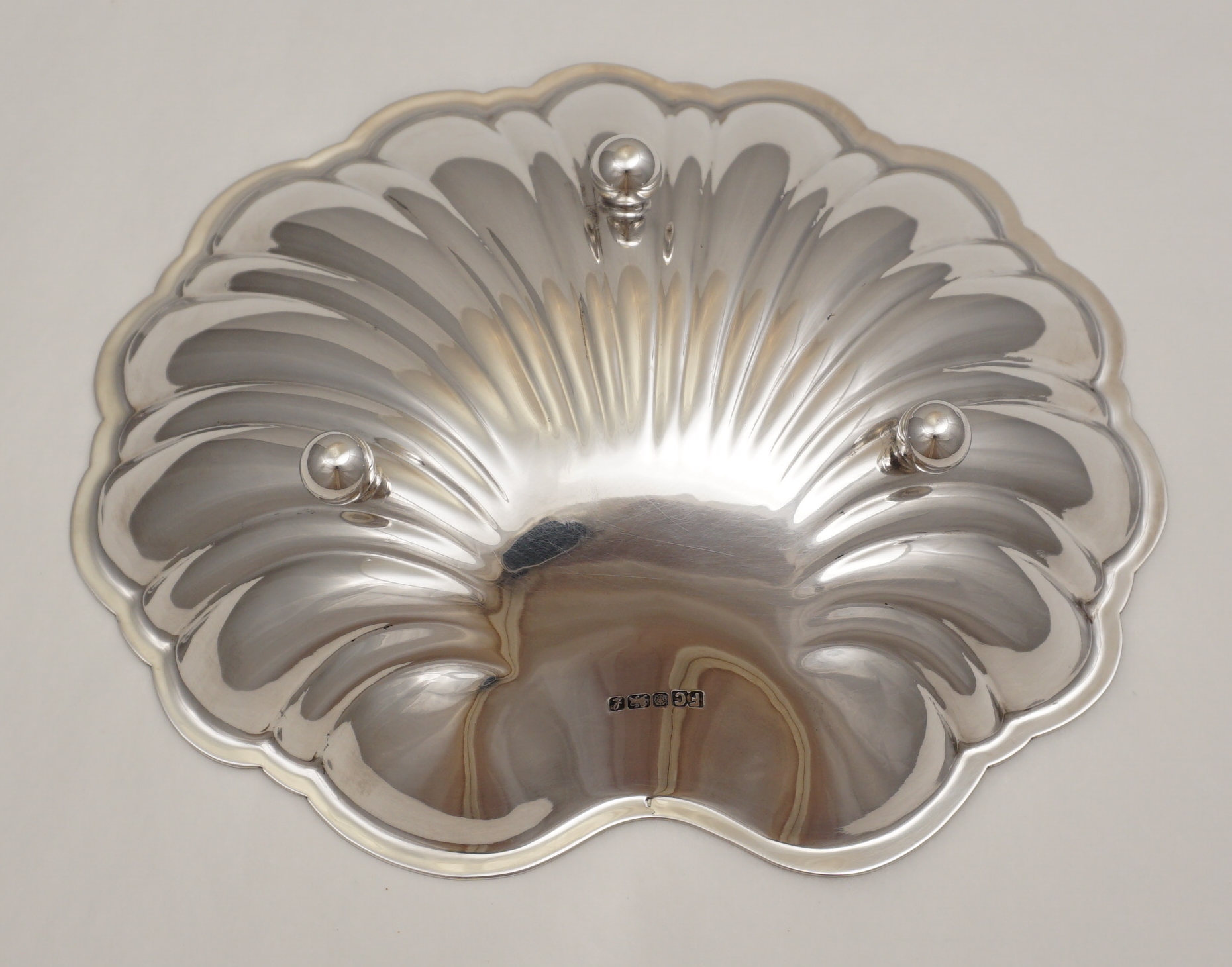 | DESCRIPTION | Useful vintage English solid sterling silver shell form nut dish on three ball feet. Discreet presentation inscription. |