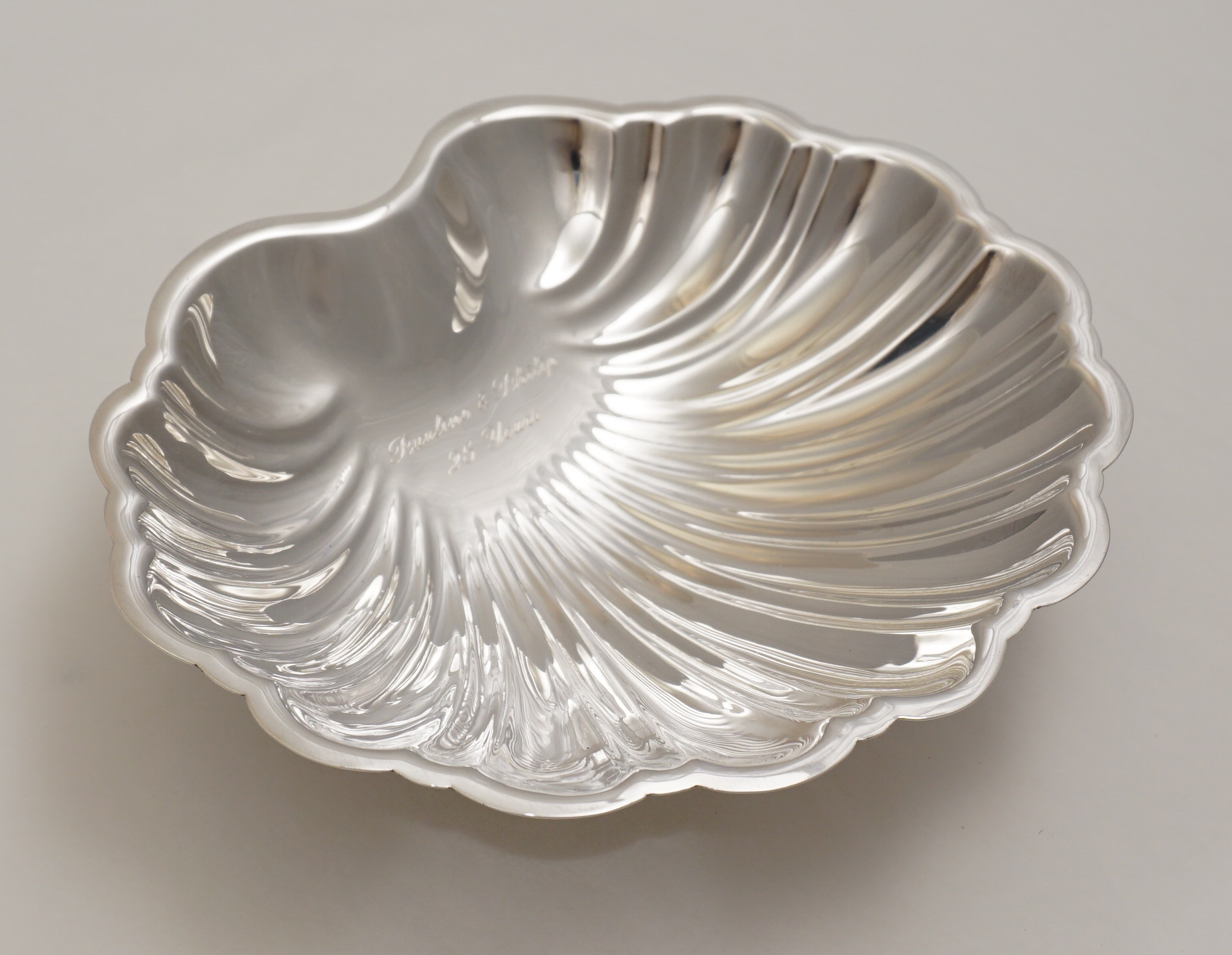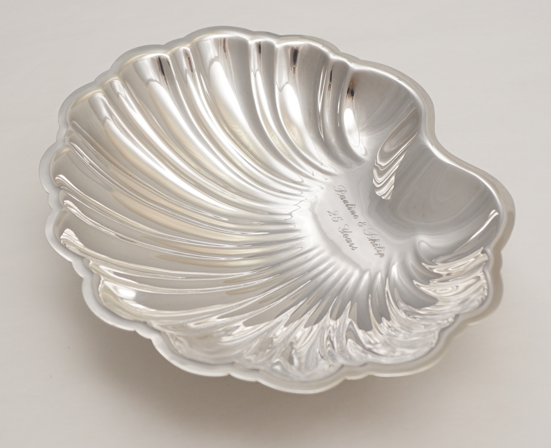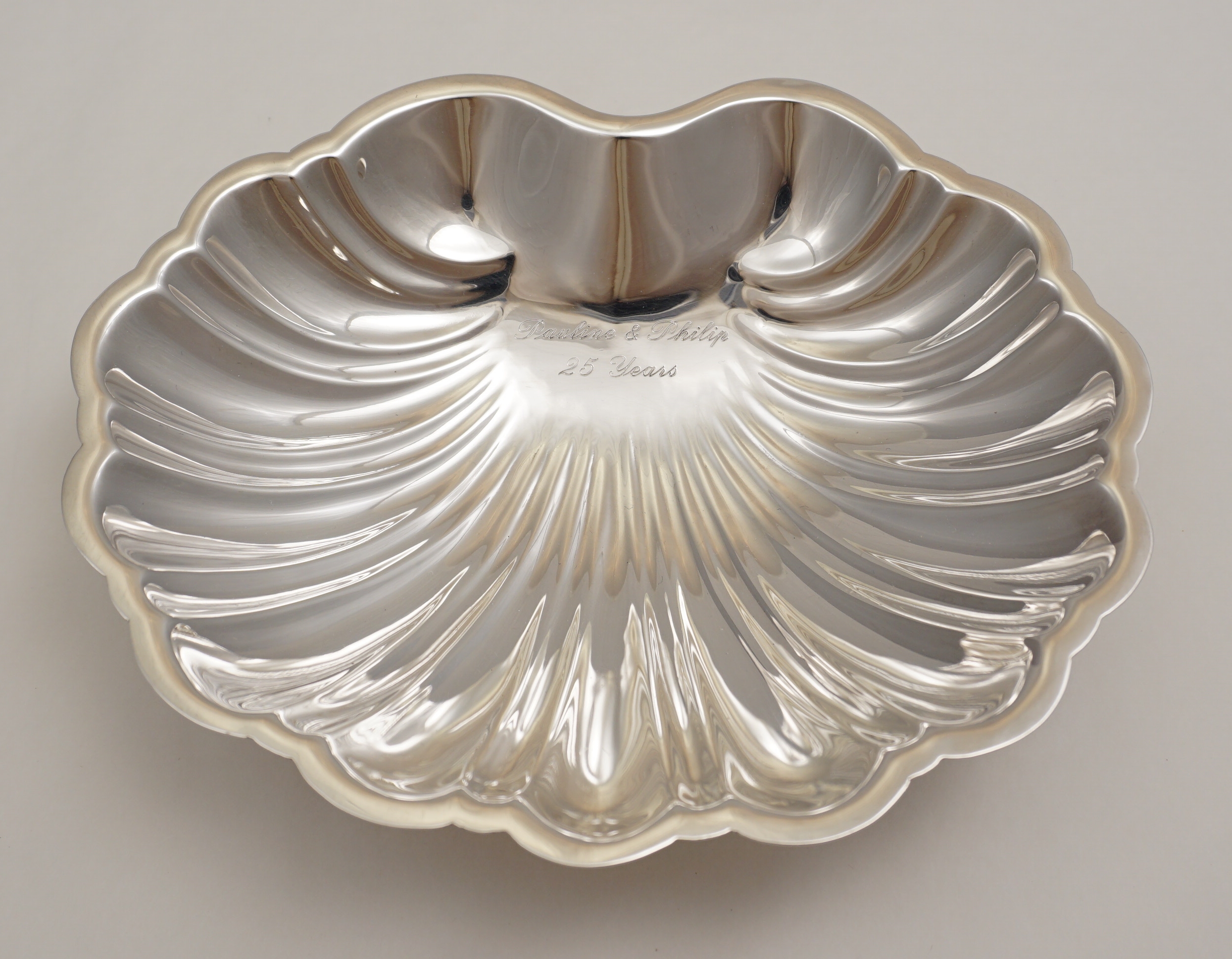 | DESCRIPTION | Useful vintage English solid sterling silver shell form nut dish on three ball feet. Discreet presentation inscription. |