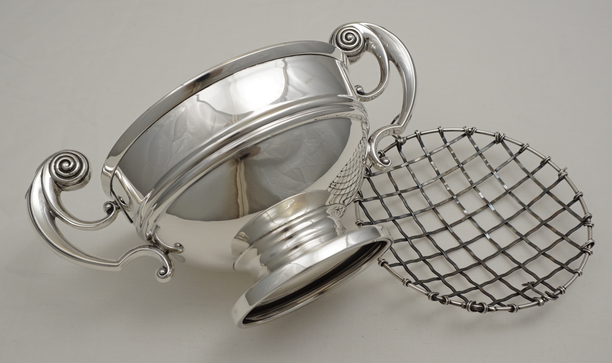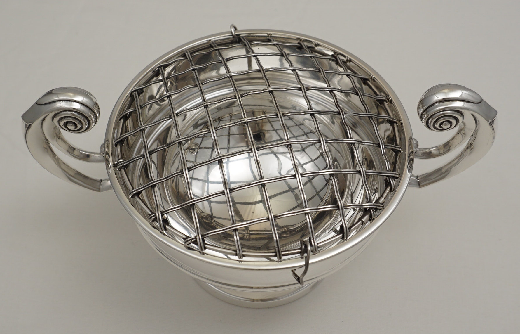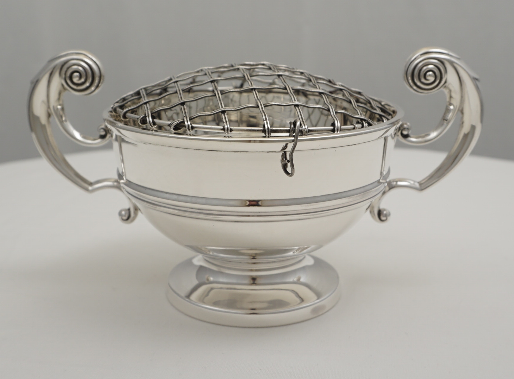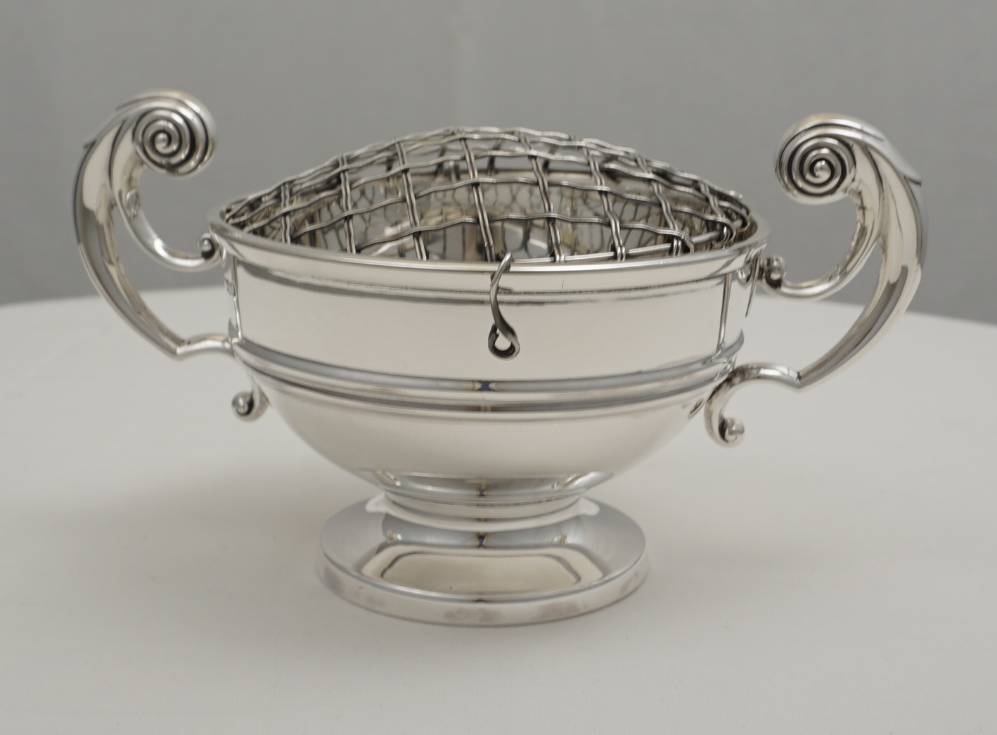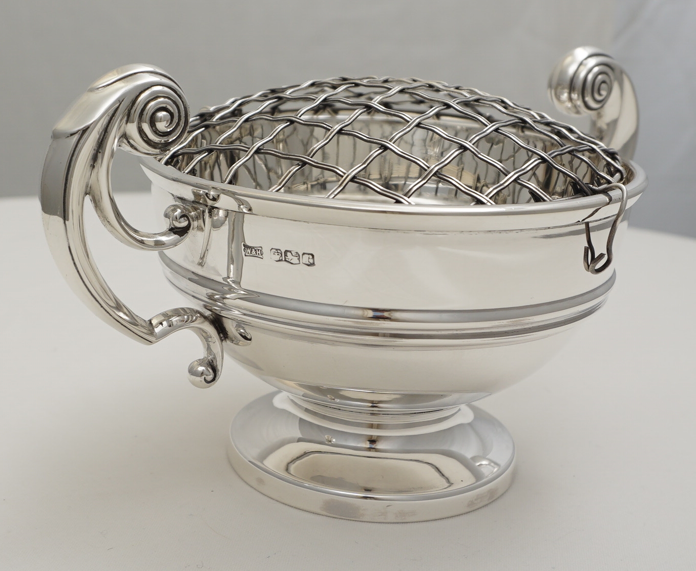 DESCRIPTION | High quality vintage English solid sterling silver rose bowl with the original wire grid that is likely to be silver plated. The bowl is made of thick, heavy gauge silver throughout. Would also work well as a trophy/presentation piece with the thick silver easily able to accommodate engraving. |