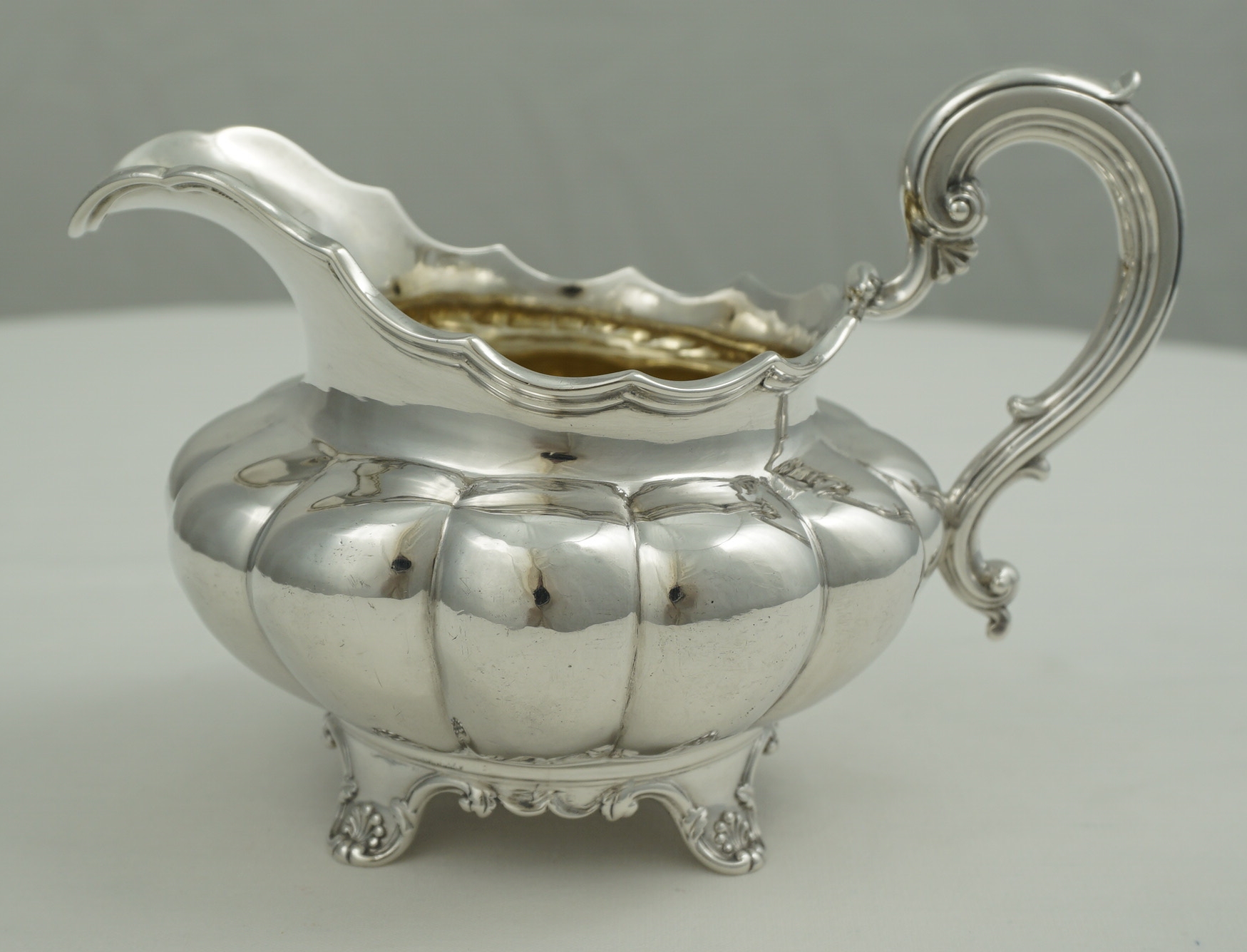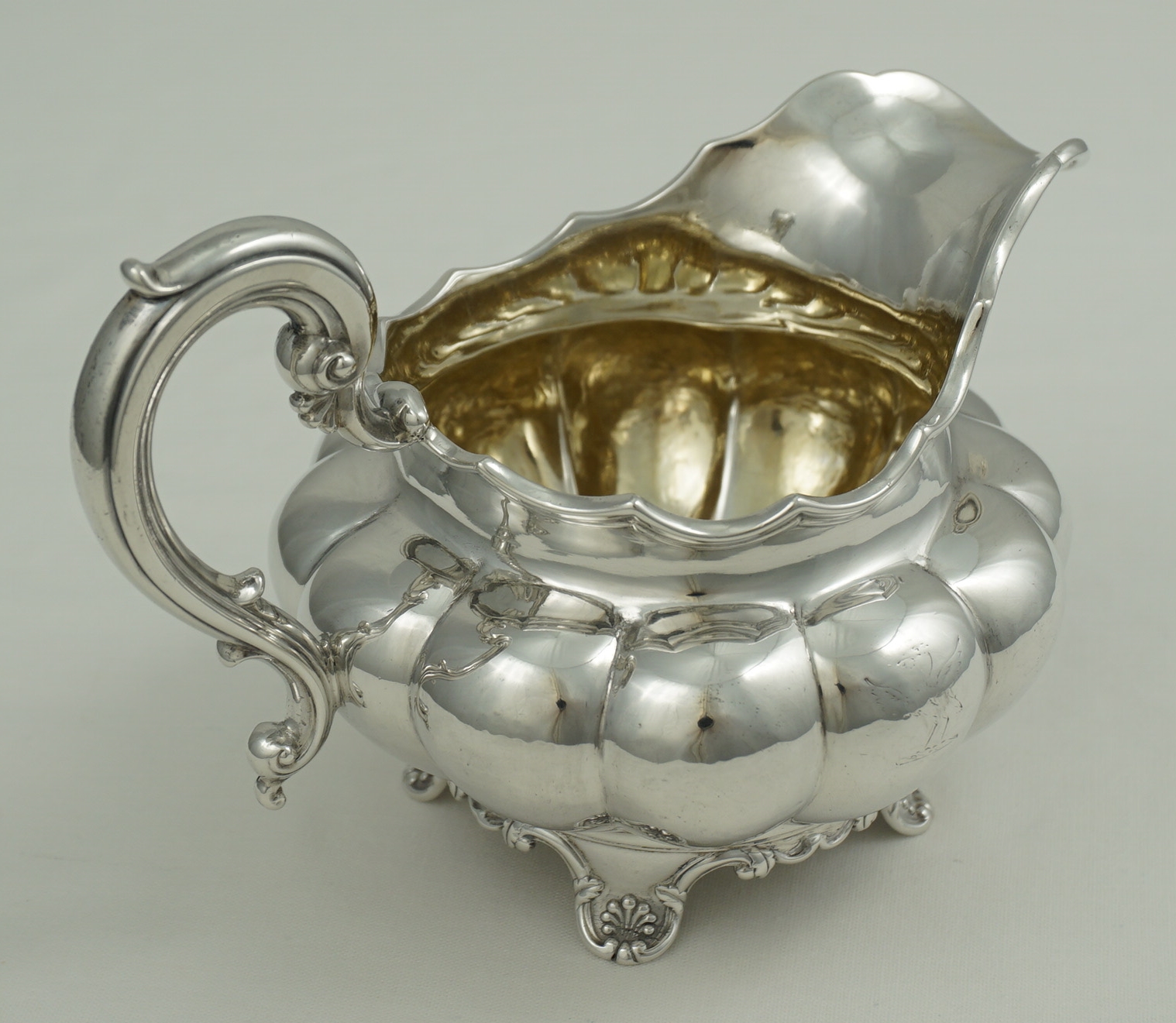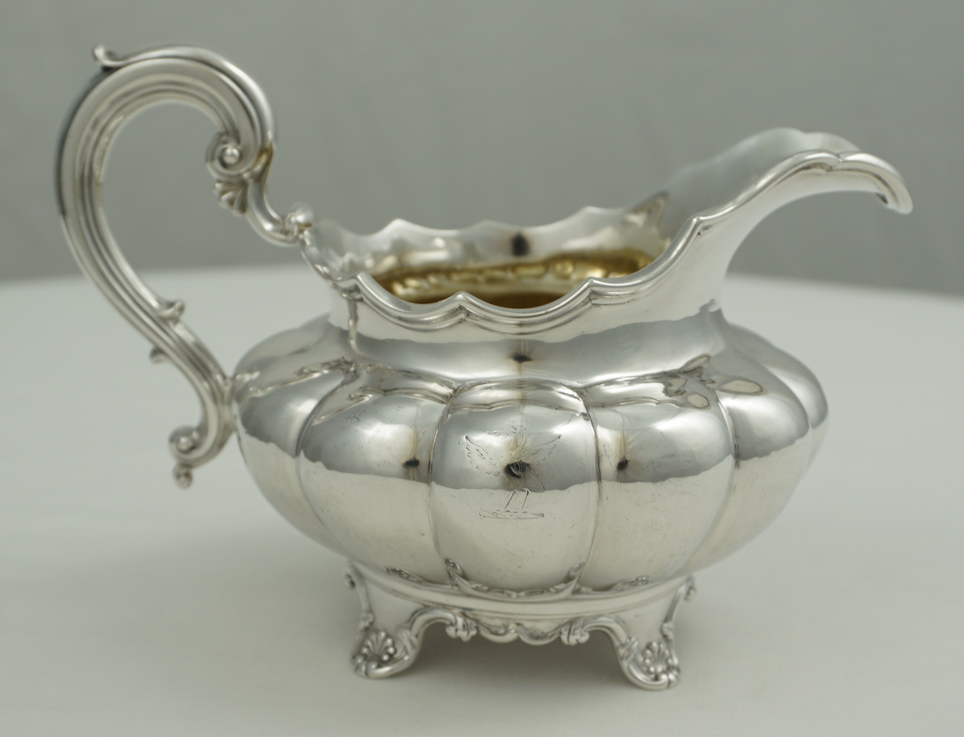 | DESCRIPTION | Good antique English William IV solid sterling silver milk or cream jug with a lightly gilded interior and discreet crest. At a time when England was enjoying three Kings in a single decade it is possibly no surprise that King's pattern flatware was at the peak of it's popularity. With lobed, bulbous body and all its scroll and shell decoration, if there was ever a King's pattern milk jug then this would be it. Or, more suitably, a King's pattern sauce boat. |