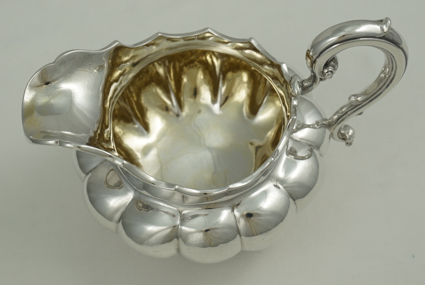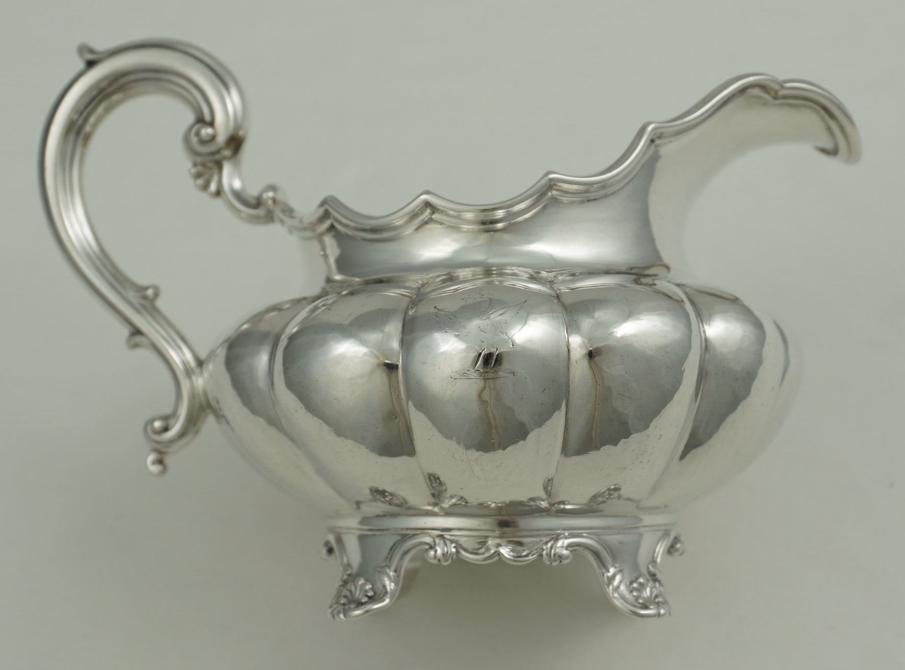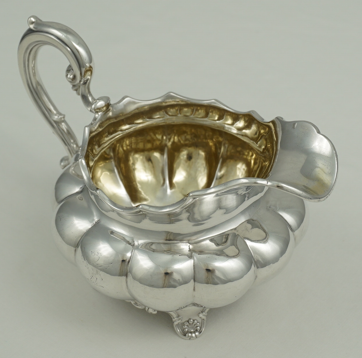 | DESCRIPTION | Good antique English William IV solid sterling silver milk or cream jug with a lightly gilded interior and discreet crest. At a time when England was enjoying three Kings in a single decade it is possibly no surprise that King's pattern flatware was at the peak of it's popularity. With lobed, bulbous body and all its scroll and shell decoration, if there was ever a King's pattern milk jug then this would be it. Or, more suitably, a King's pattern sauce boat. |