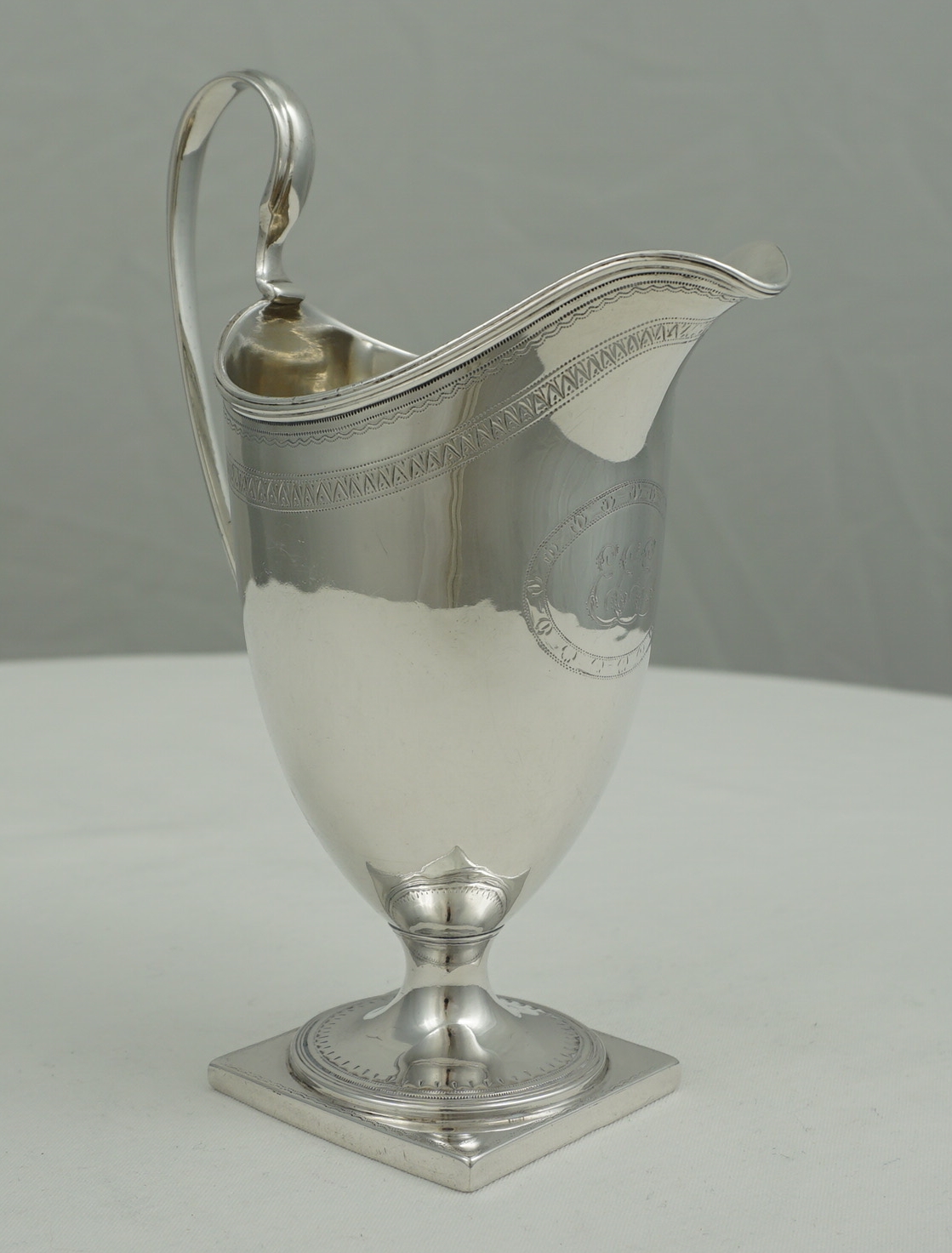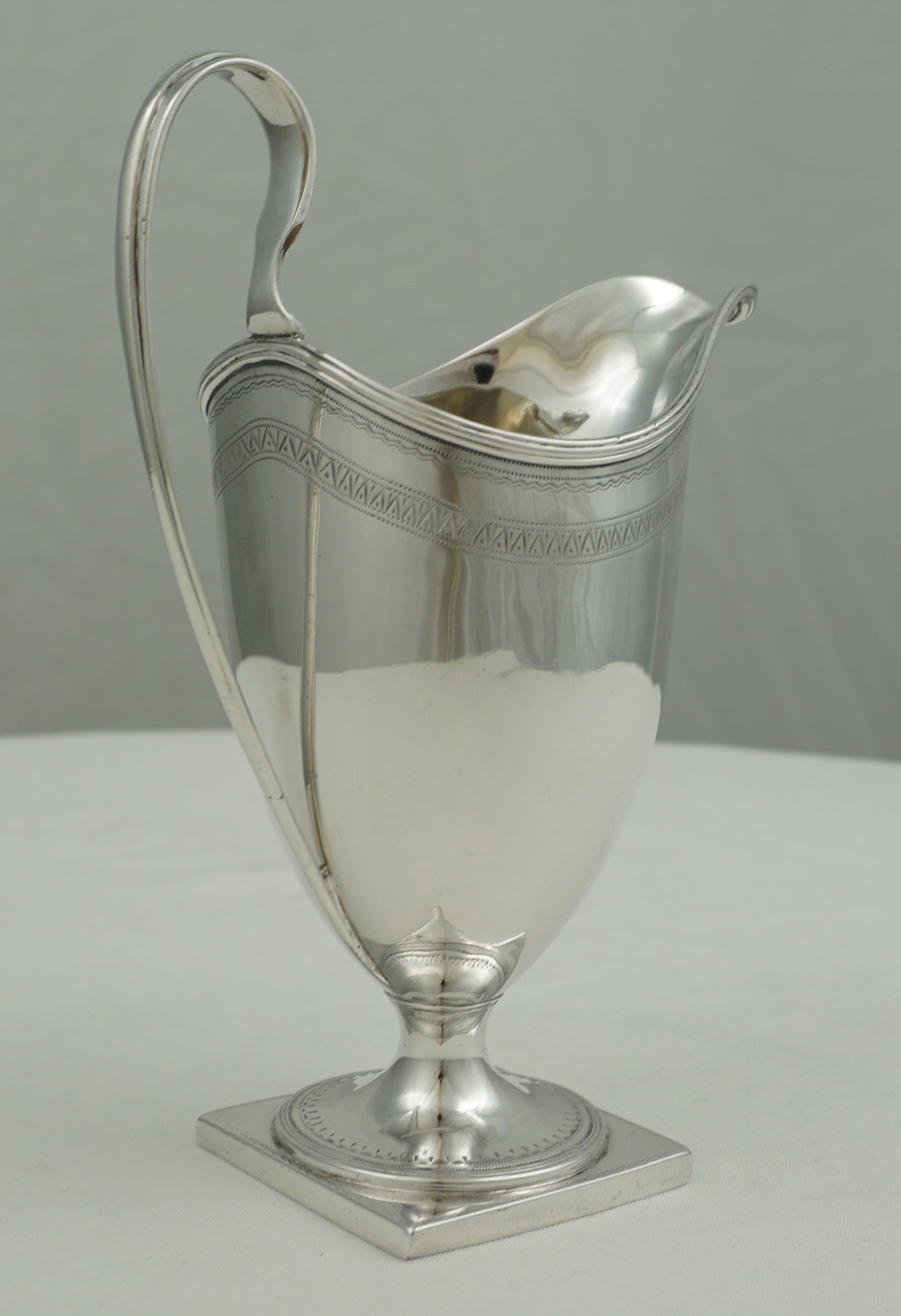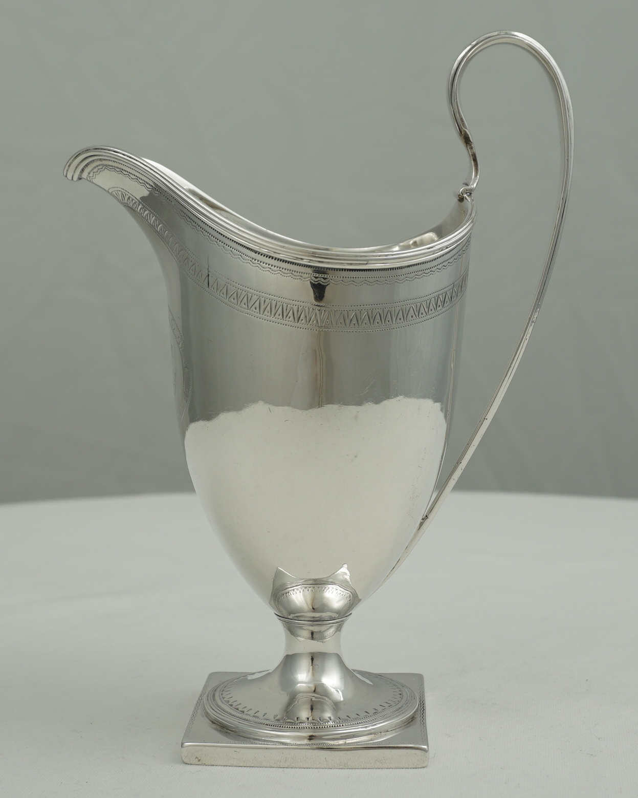 | DESCRIPTION | Very good antique English Georgian solid sterling silver neo-classical helmet form cream jug with bright cut engraved decoration and a square pedestal base. The central cartouche has the original monogram engraving. |