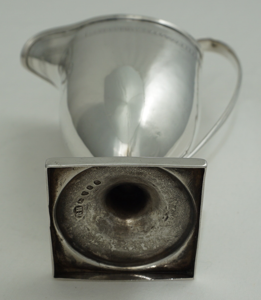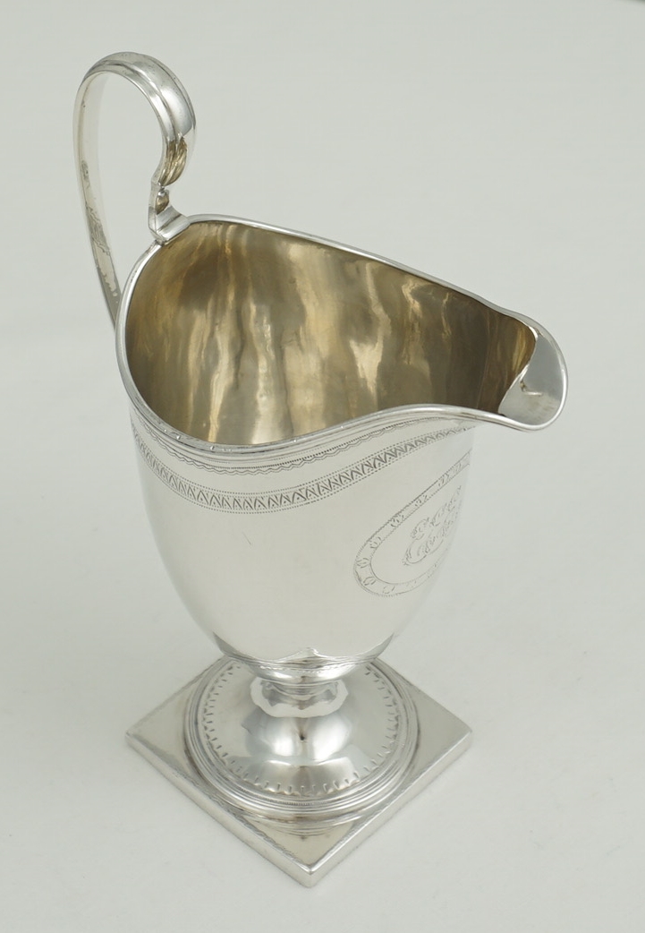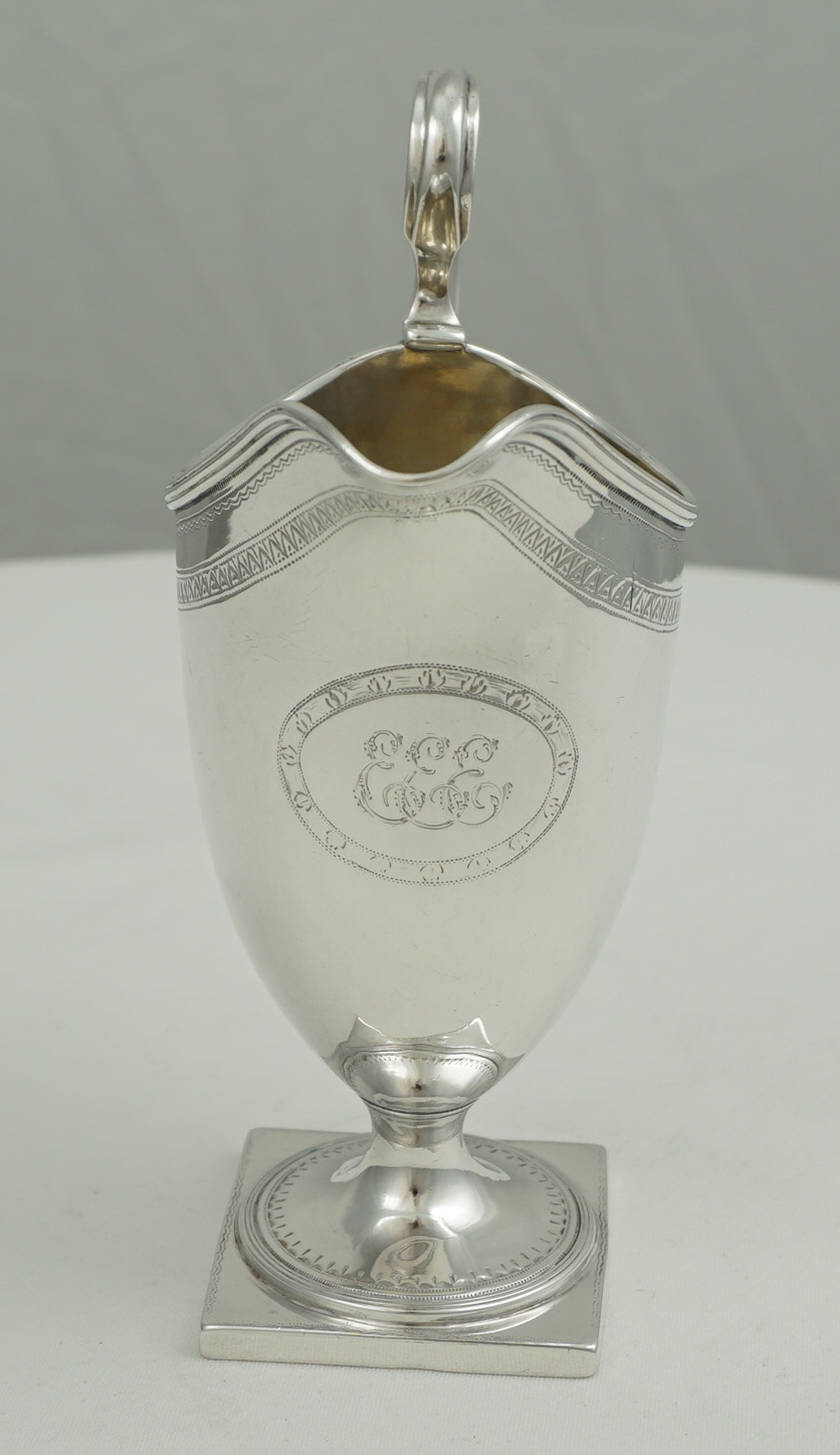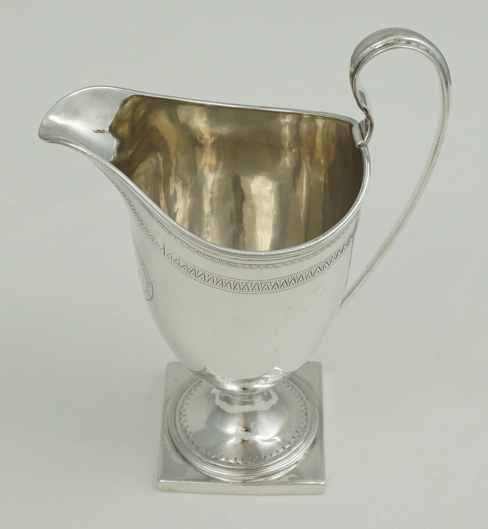 | DESCRIPTION | Very good antique English Georgian solid sterling silver neo-classical helmet form cream jug with bright cut engraved decoration and a square pedestal base. The central cartouche has the original monogram engraving. |