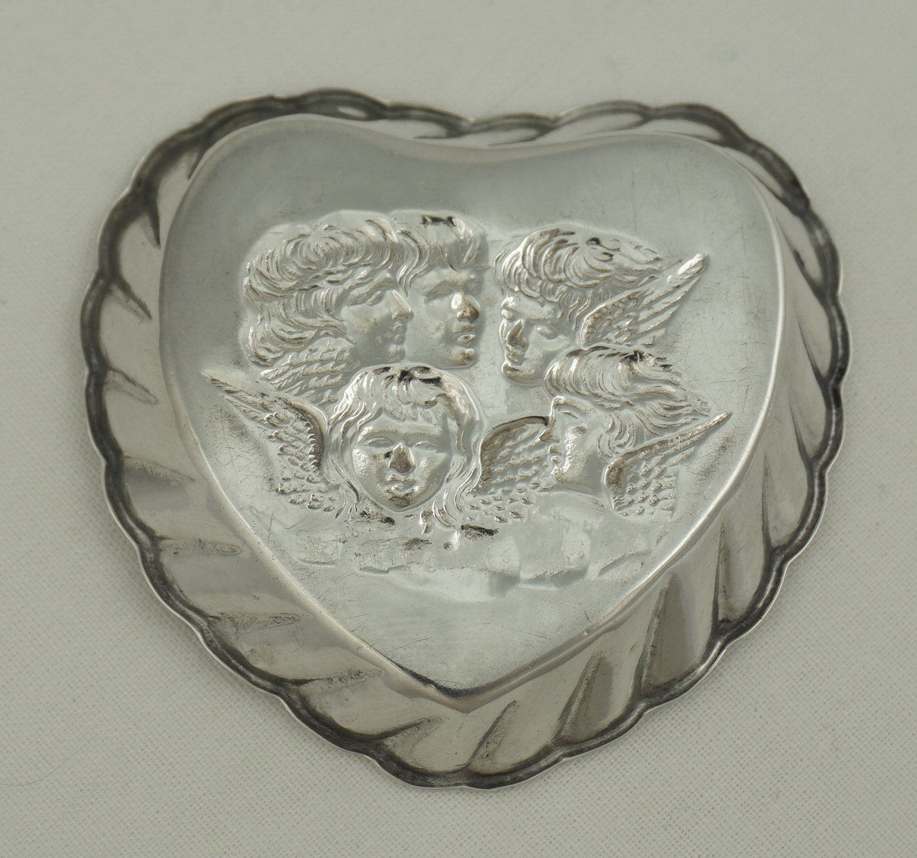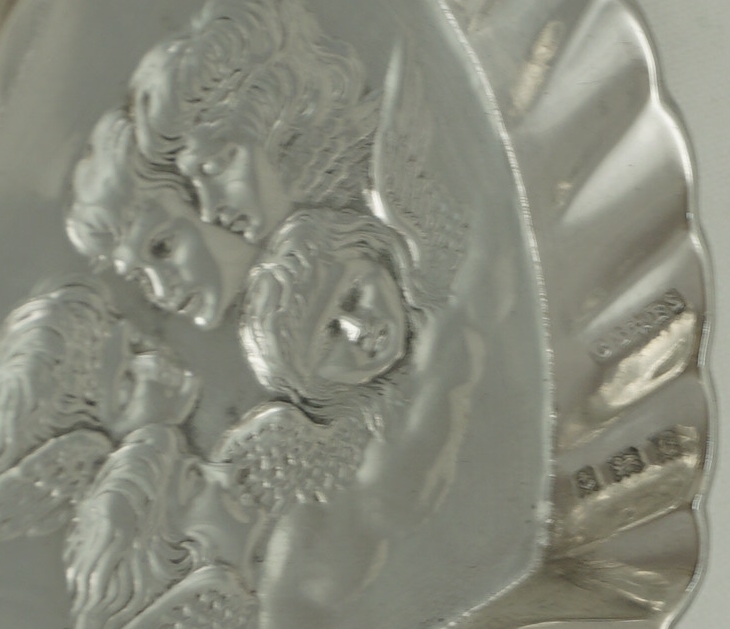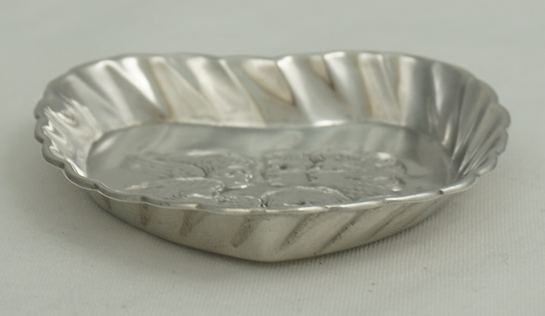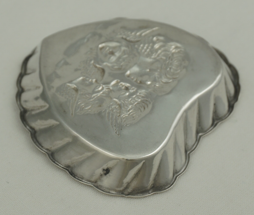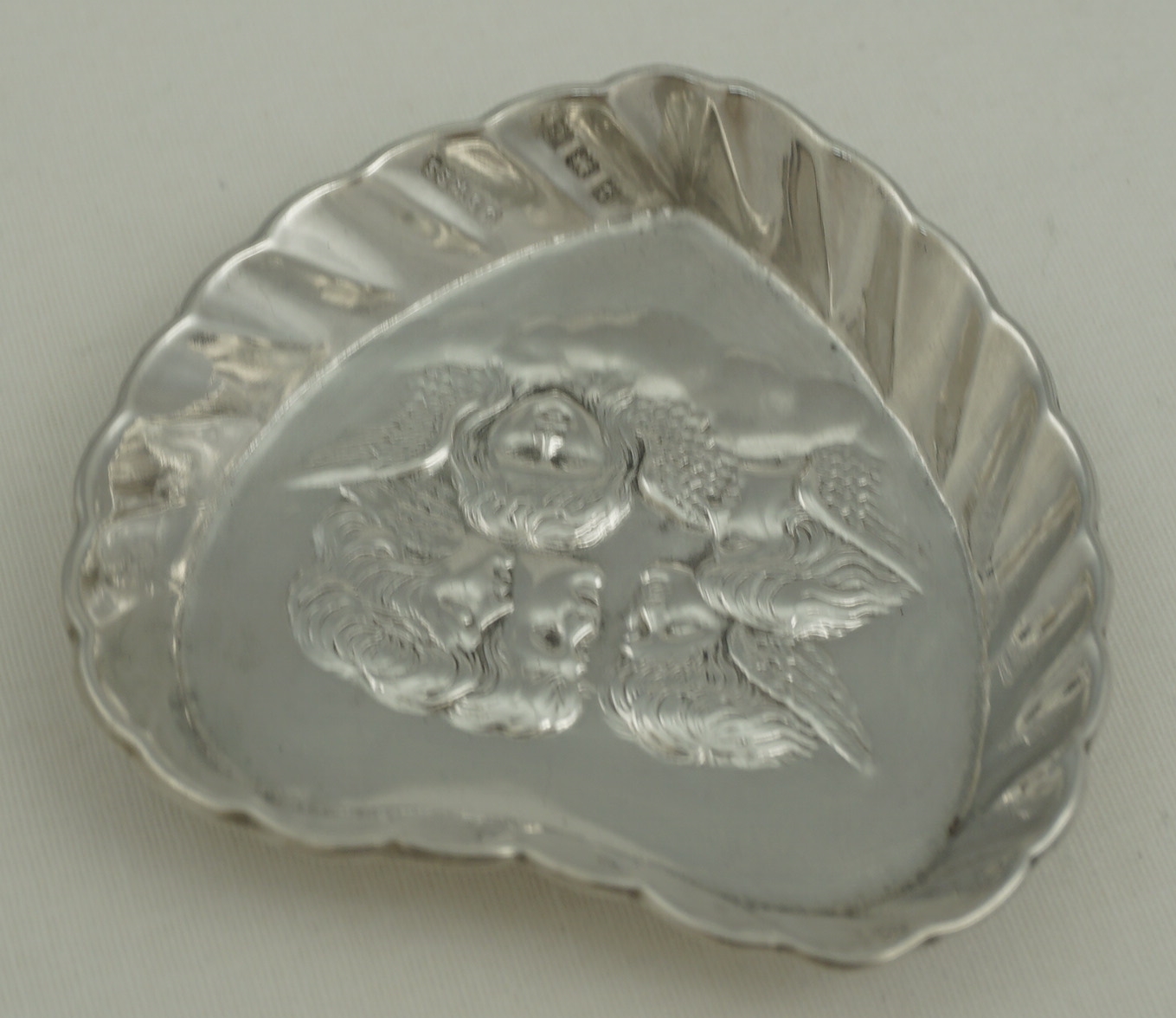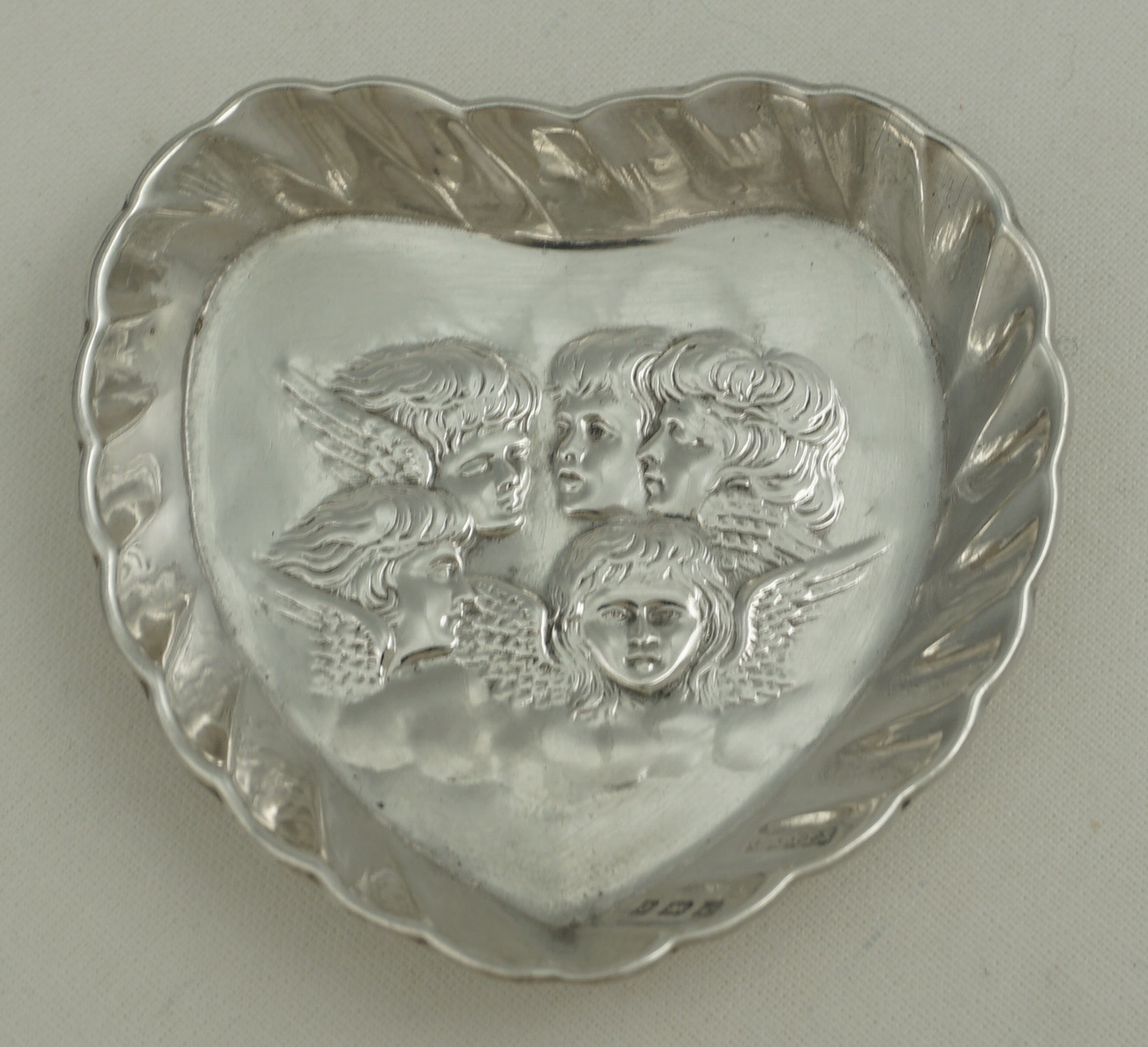 | DESCRIPTION | Very good antique English Edwardian solid sterling silver heart form dish decorated with an embossed and engraved image of the Heads of Angels by Sir Joshua Reynolds in 1787. |