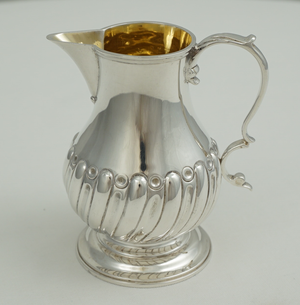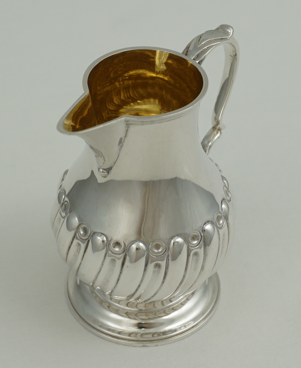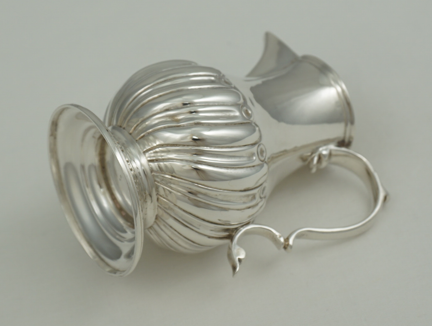 | DESCRIPTION | Good little antique English Victorian reproduction of a 1760s Georgian solid sterling silver sparrow beak cream jug with a flying leaf capped scrolling handle with thumb rest, lower body embossed with swirling, tapering convex flutes, ring turned foot and a gilded interior. |