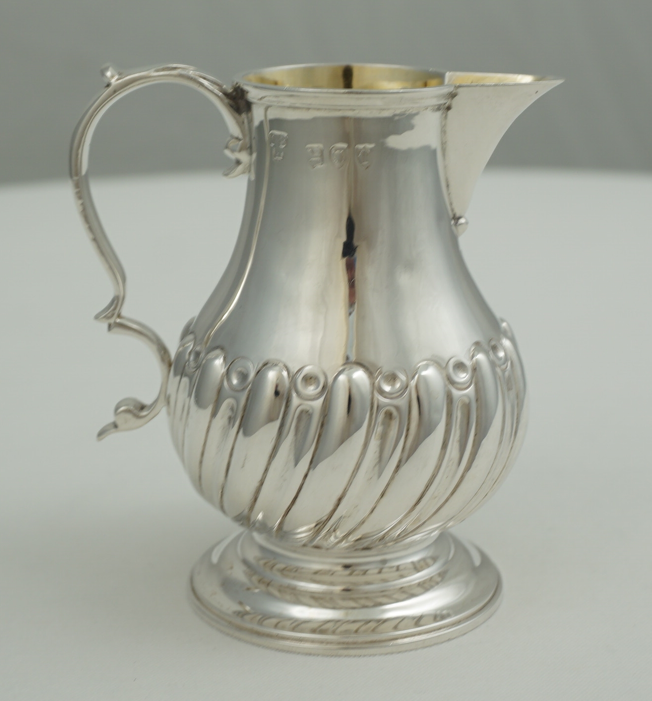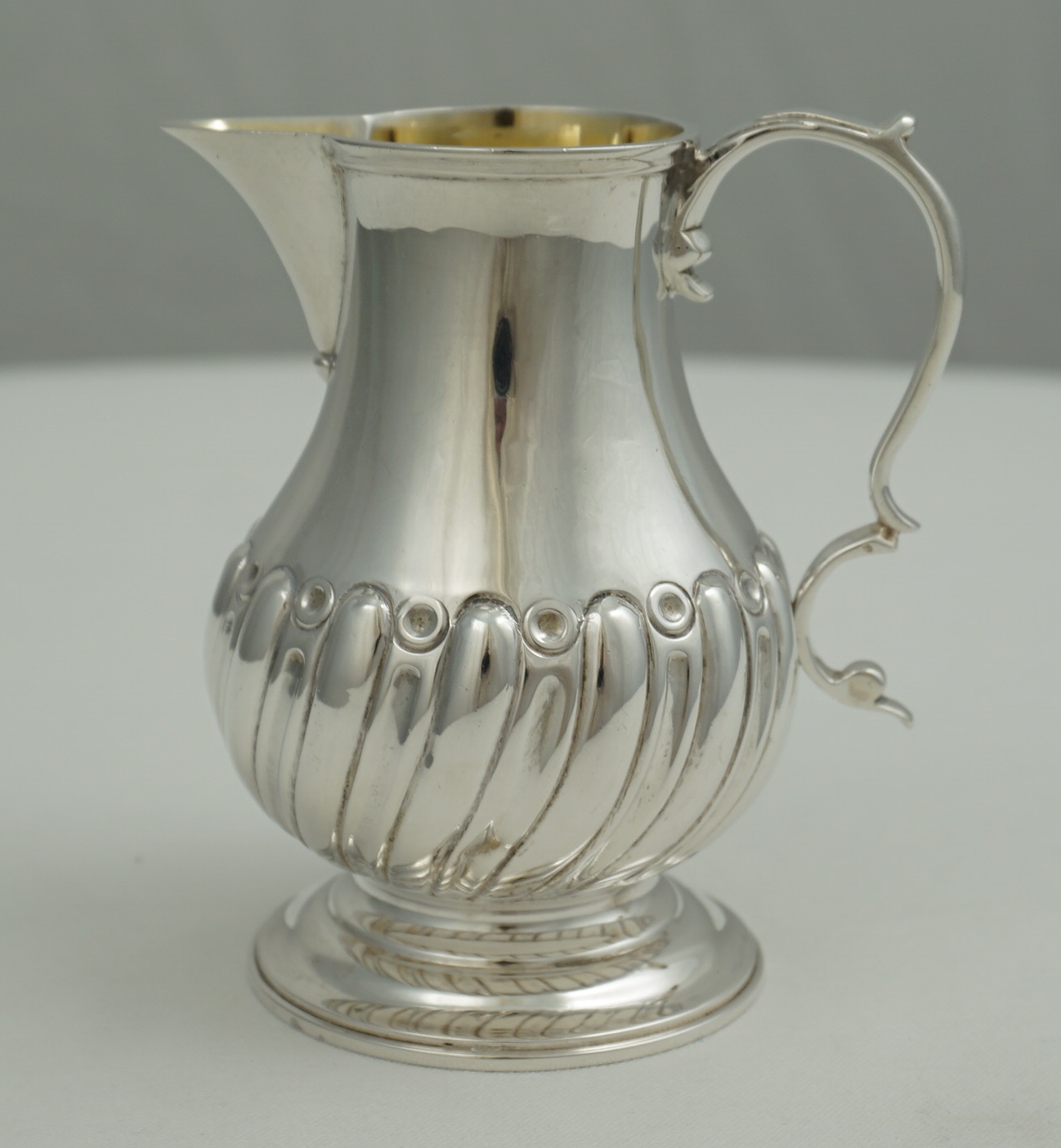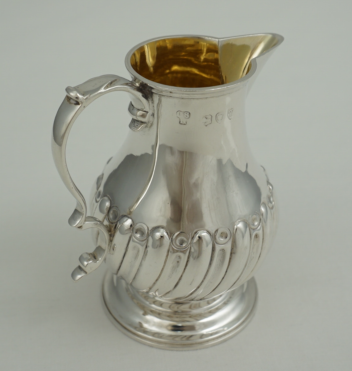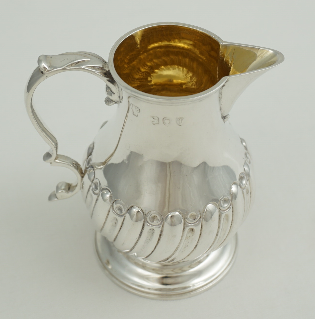 | DESCRIPTION | Good little antique English Victorian reproduction of a 1760s Georgian solid sterling silver sparrow beak cream jug with a flying leaf capped scrolling handle with thumb rest, lower body embossed with swirling, tapering convex flutes, ring turned foot and a gilded interior. |
