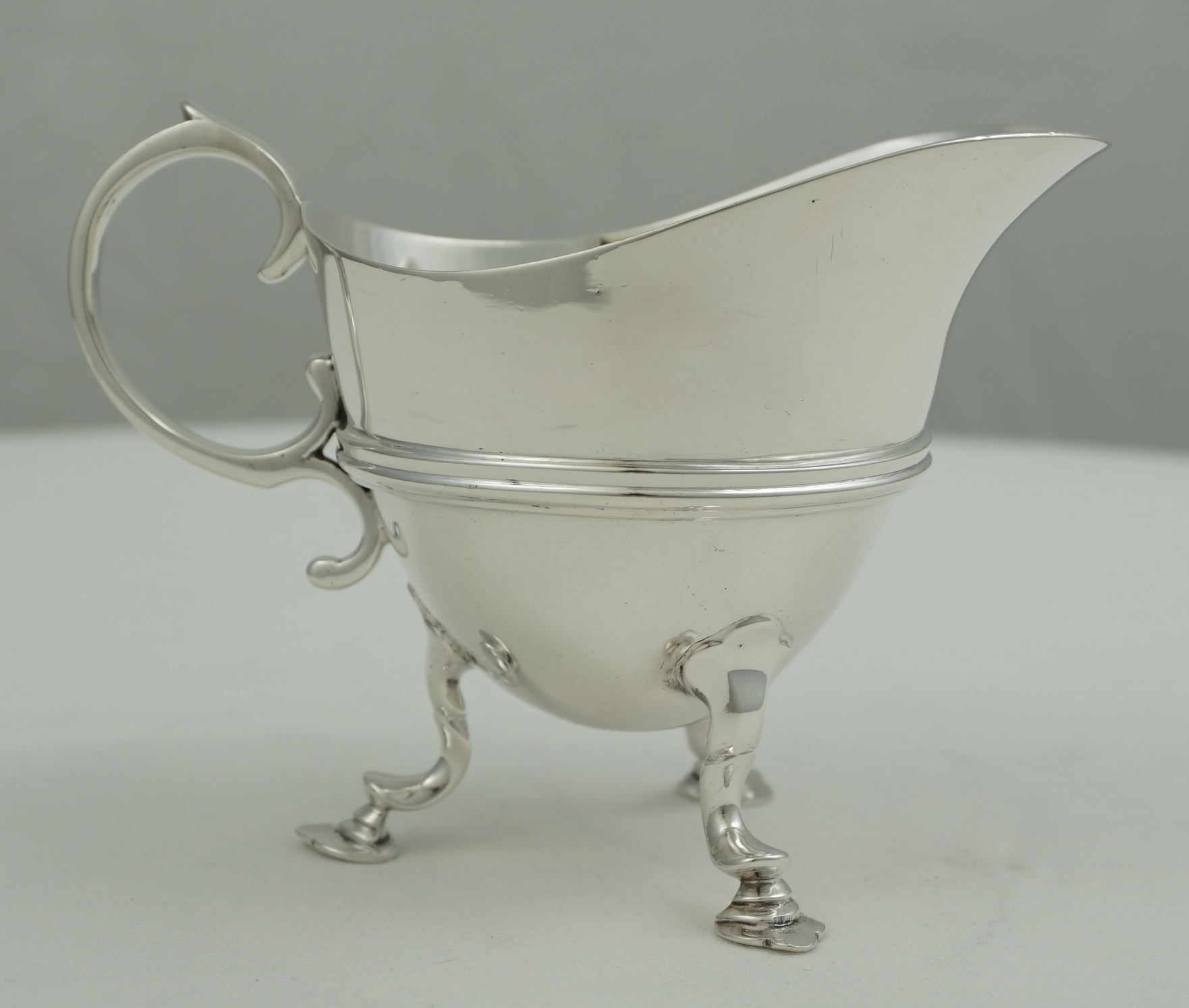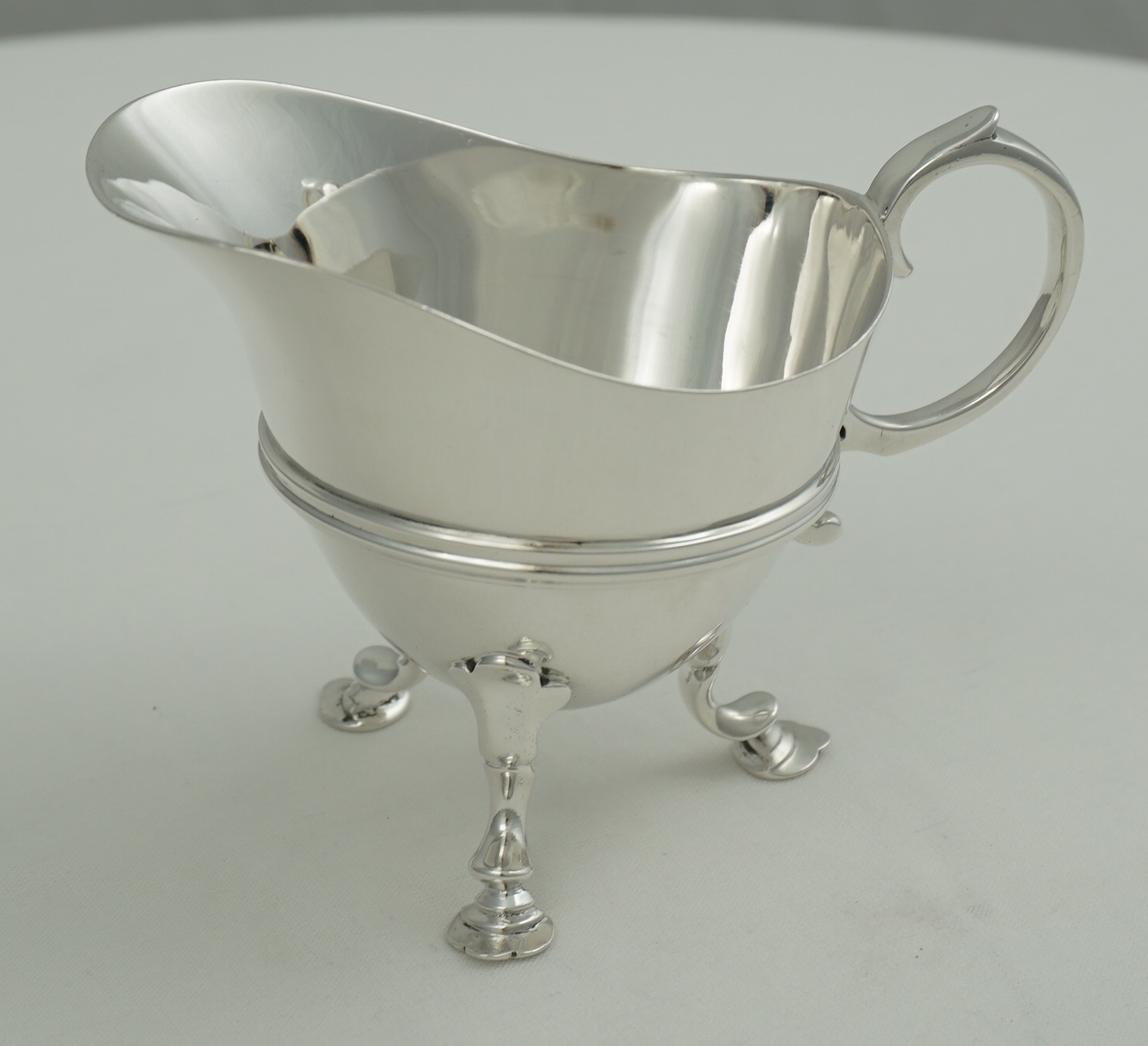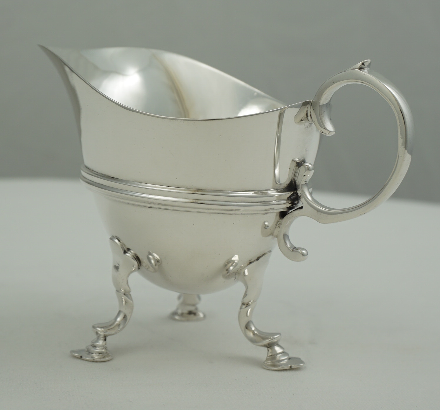 | DESCRIPTION | Very good quality antique Edwardian English solid sterling silver faithful reproduction of a 1730's cream jug with generous pouring lip, central girdle, scrolling handle with thumb rest and three pad feet. |