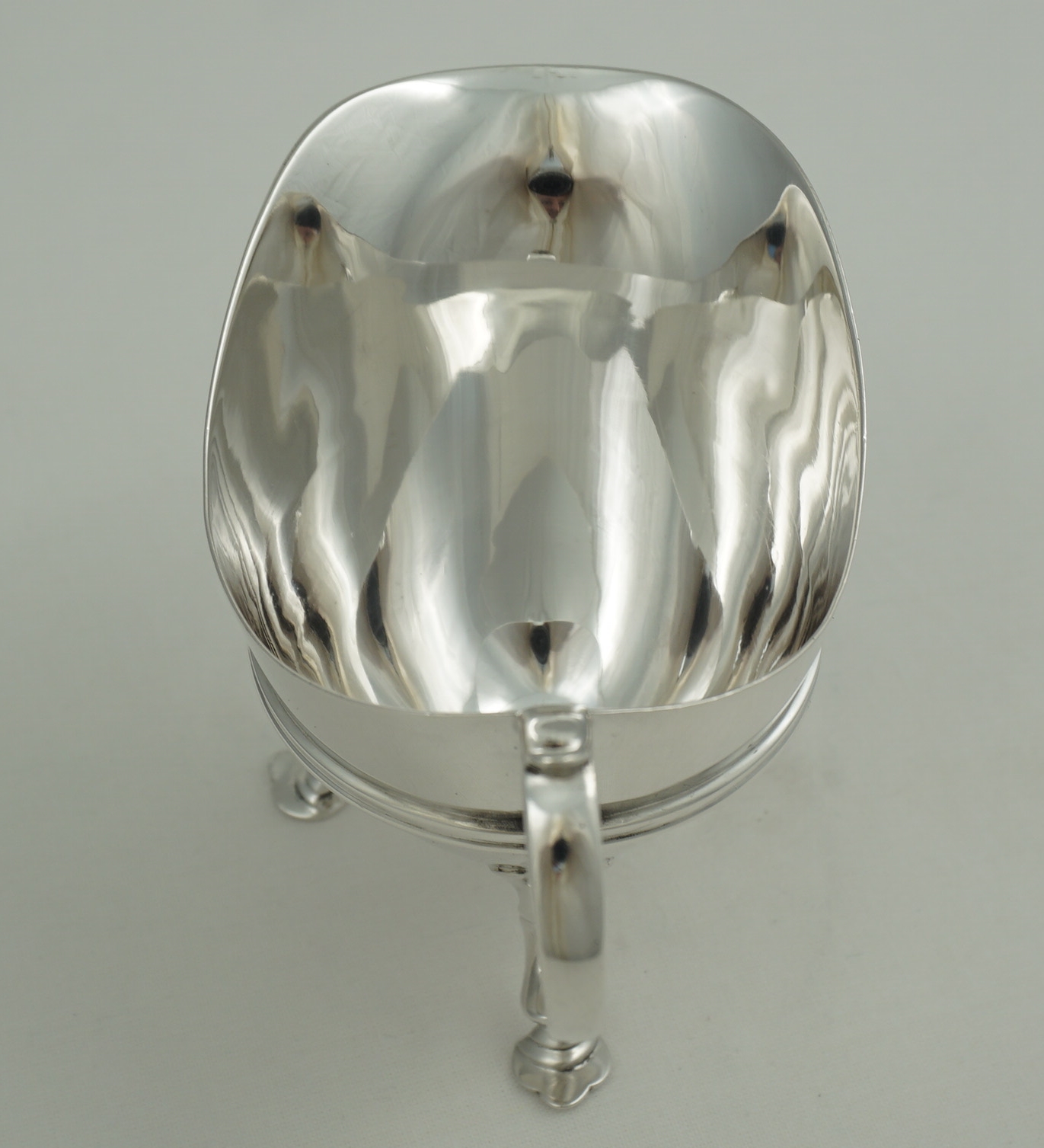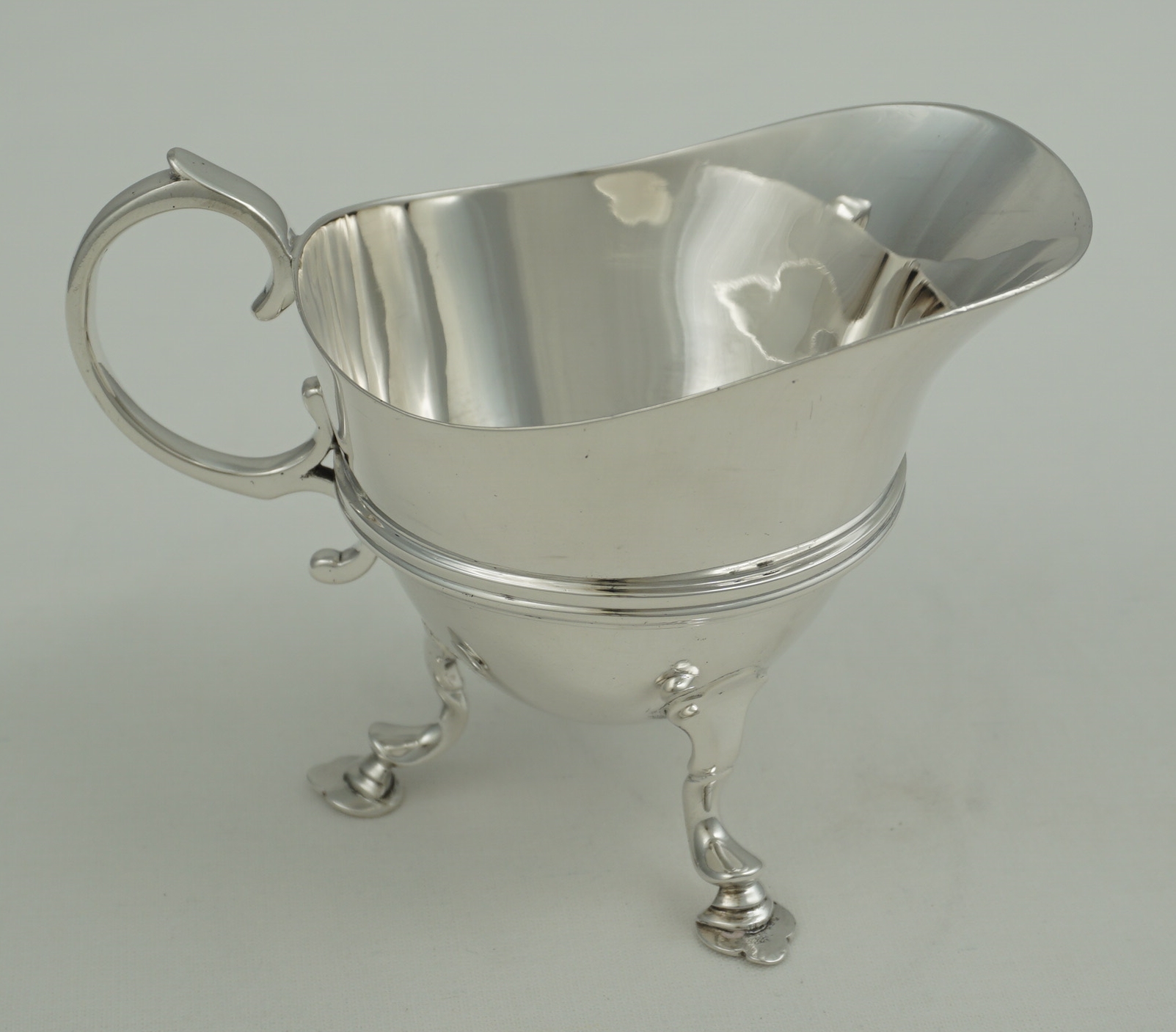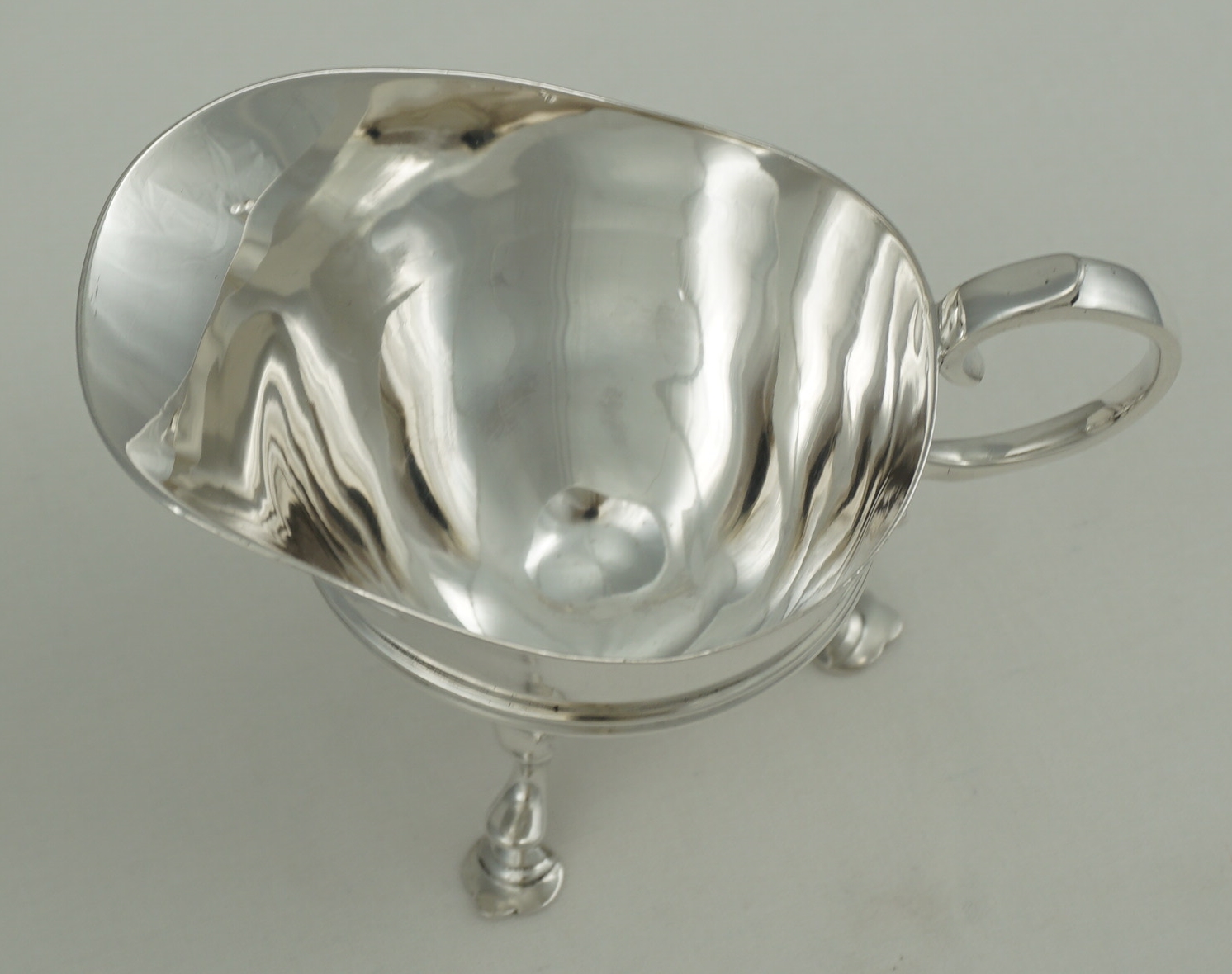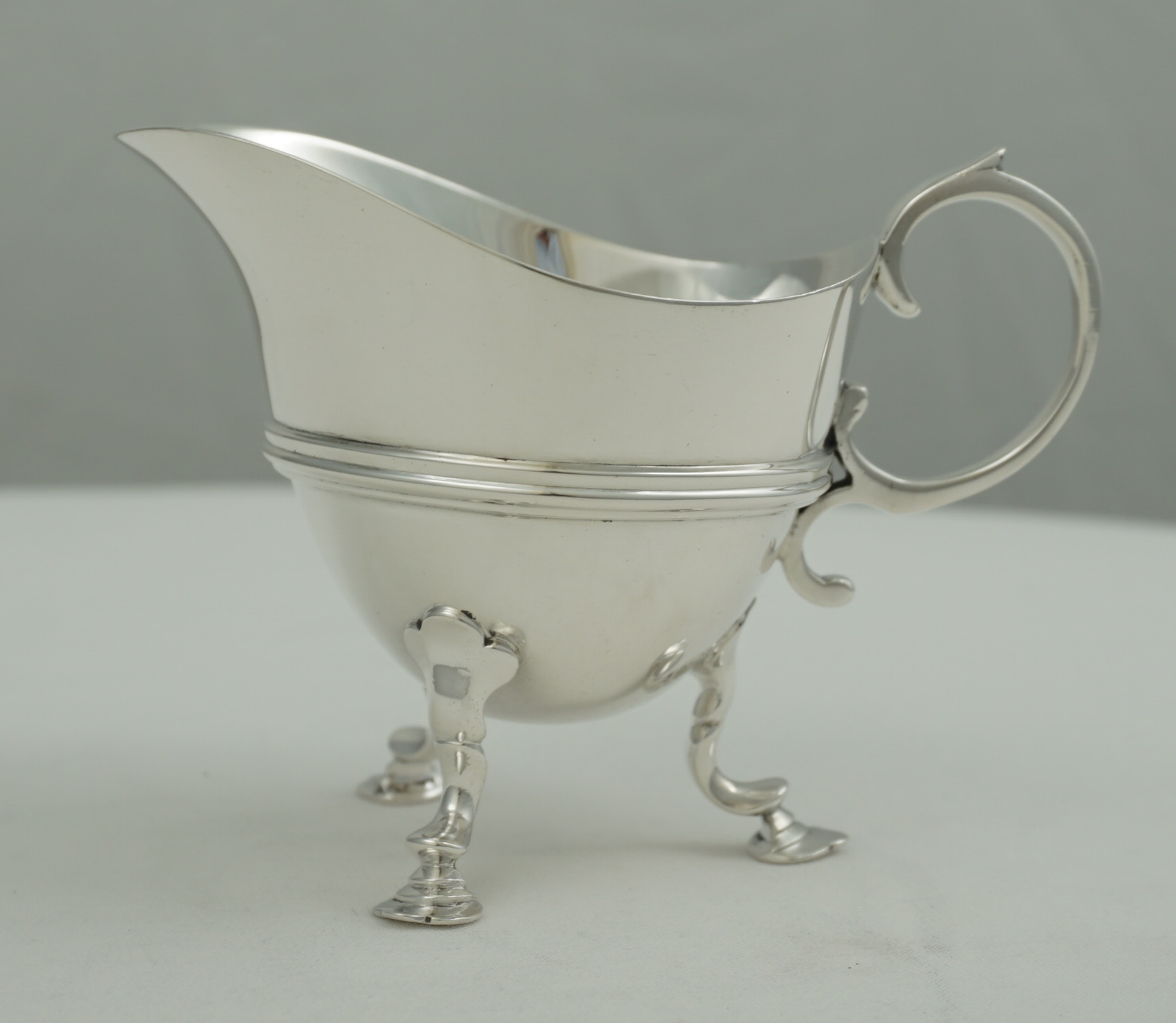 | DESCRIPTION | Very good quality antique Edwardian English solid sterling silver faithful reproduction of a 1730's cream jug with generous pouring lip, central girdle, scrolling handle with thumb rest and three pad feet. |