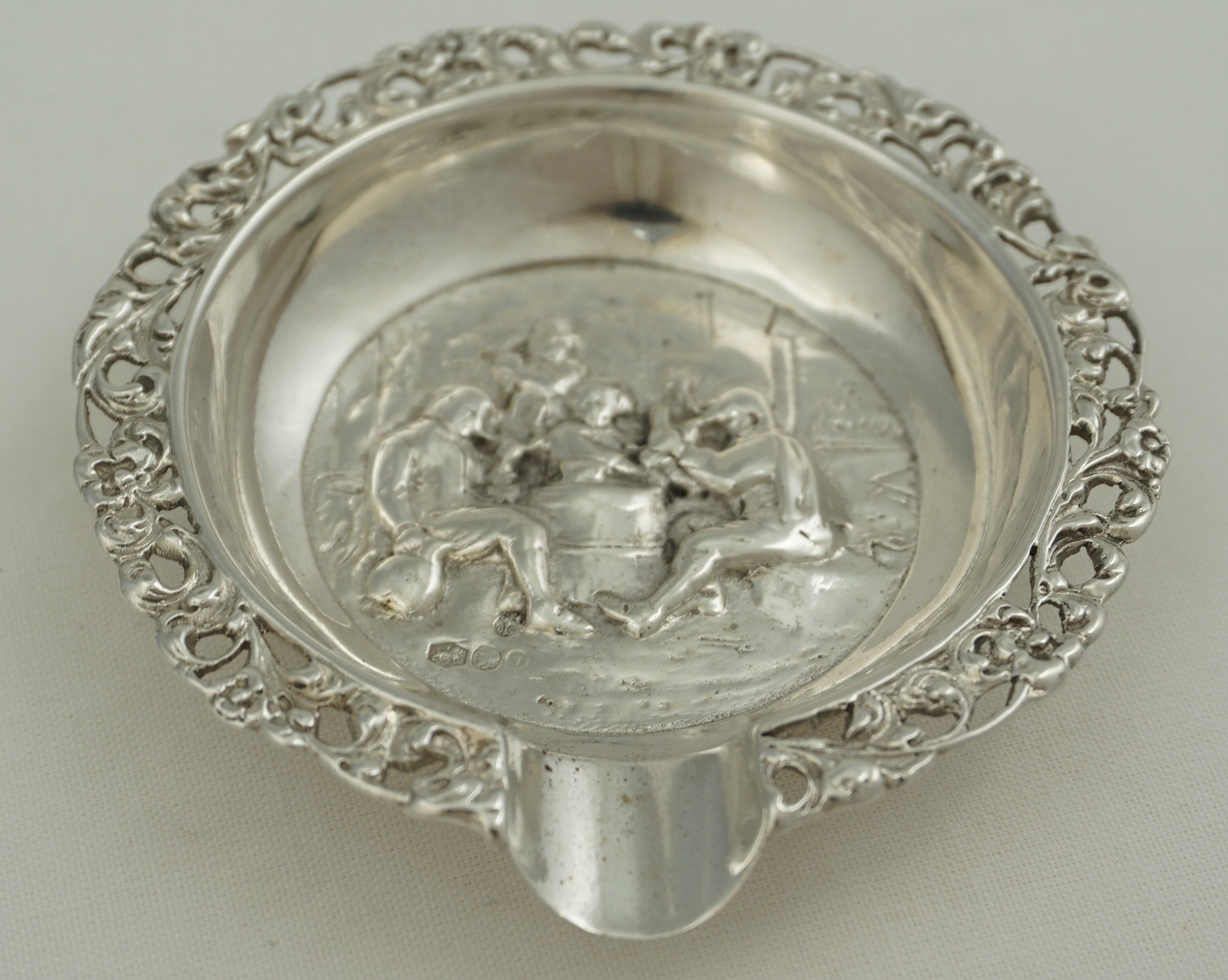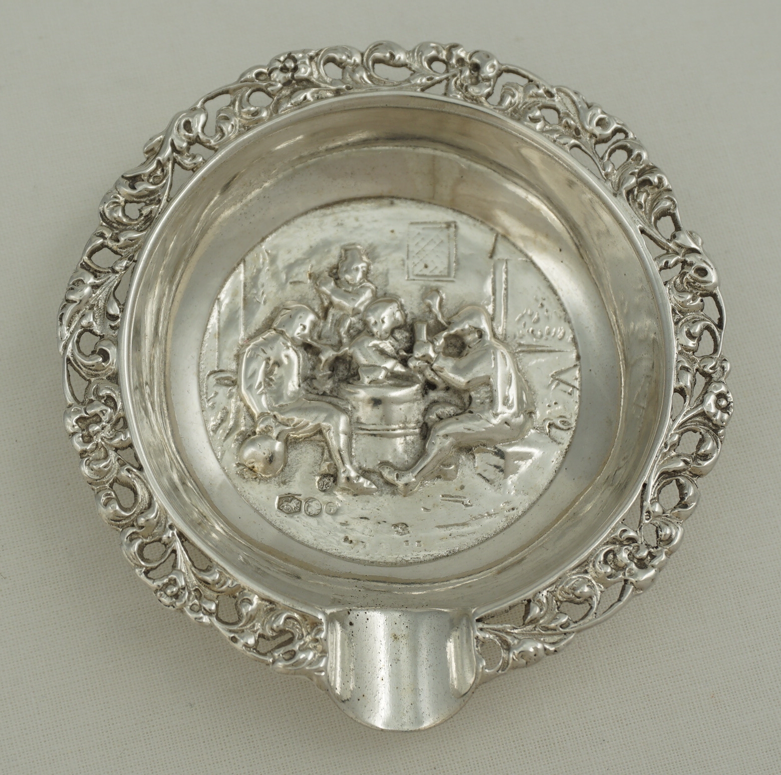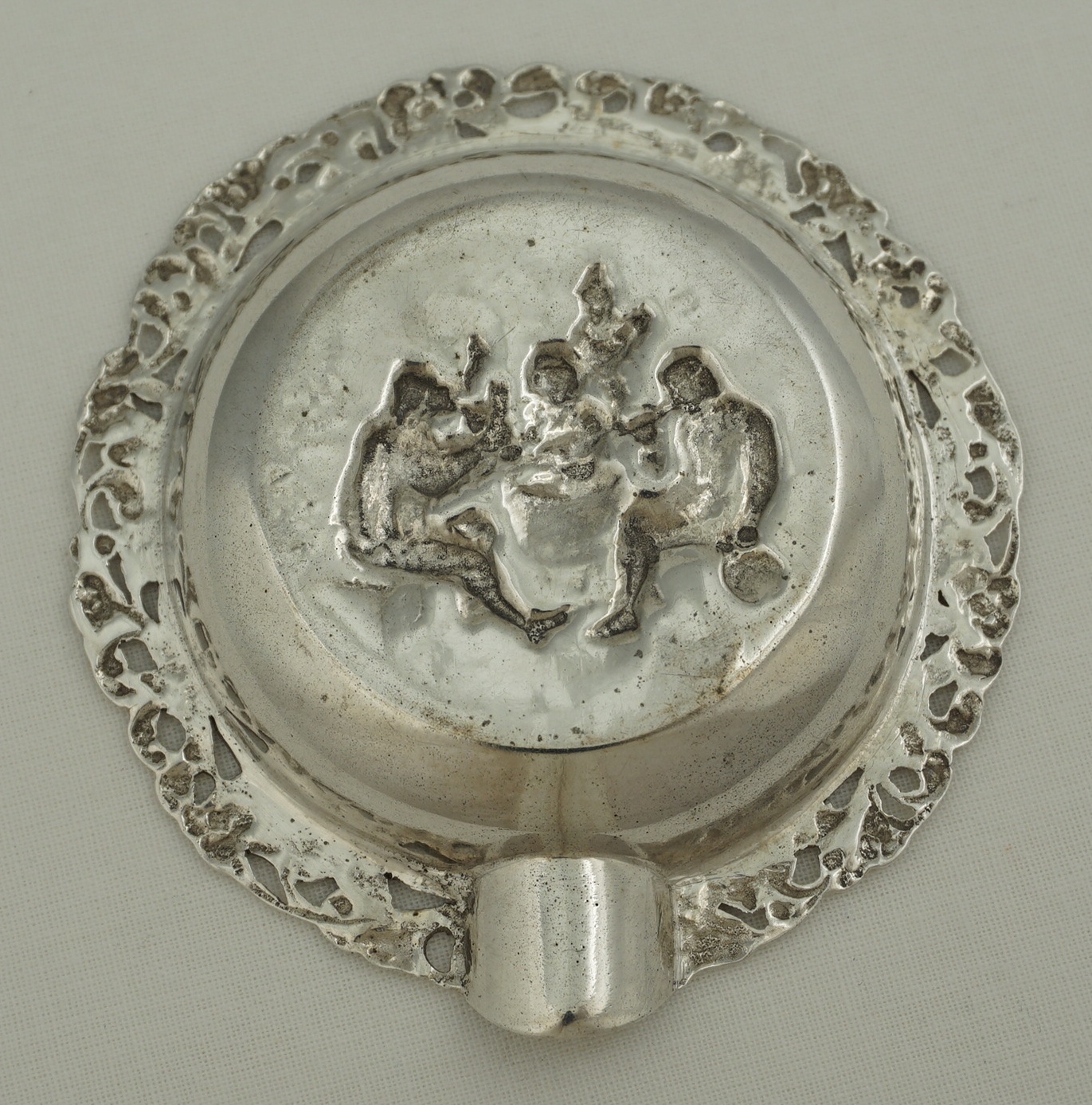 | DESCRIPTION | Good quality vintage Netherlands cast solid silver round ashtray with pierced floral and foliate border. The central scene depicts drinking and pipe smoking. |