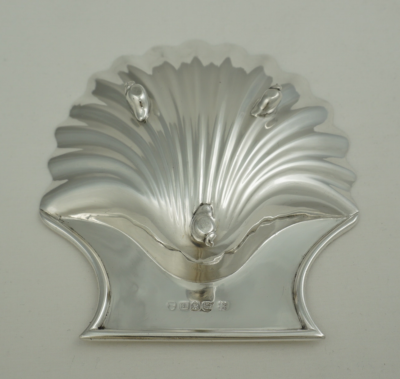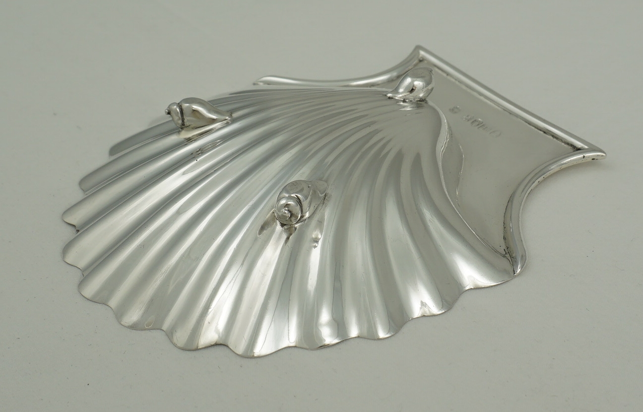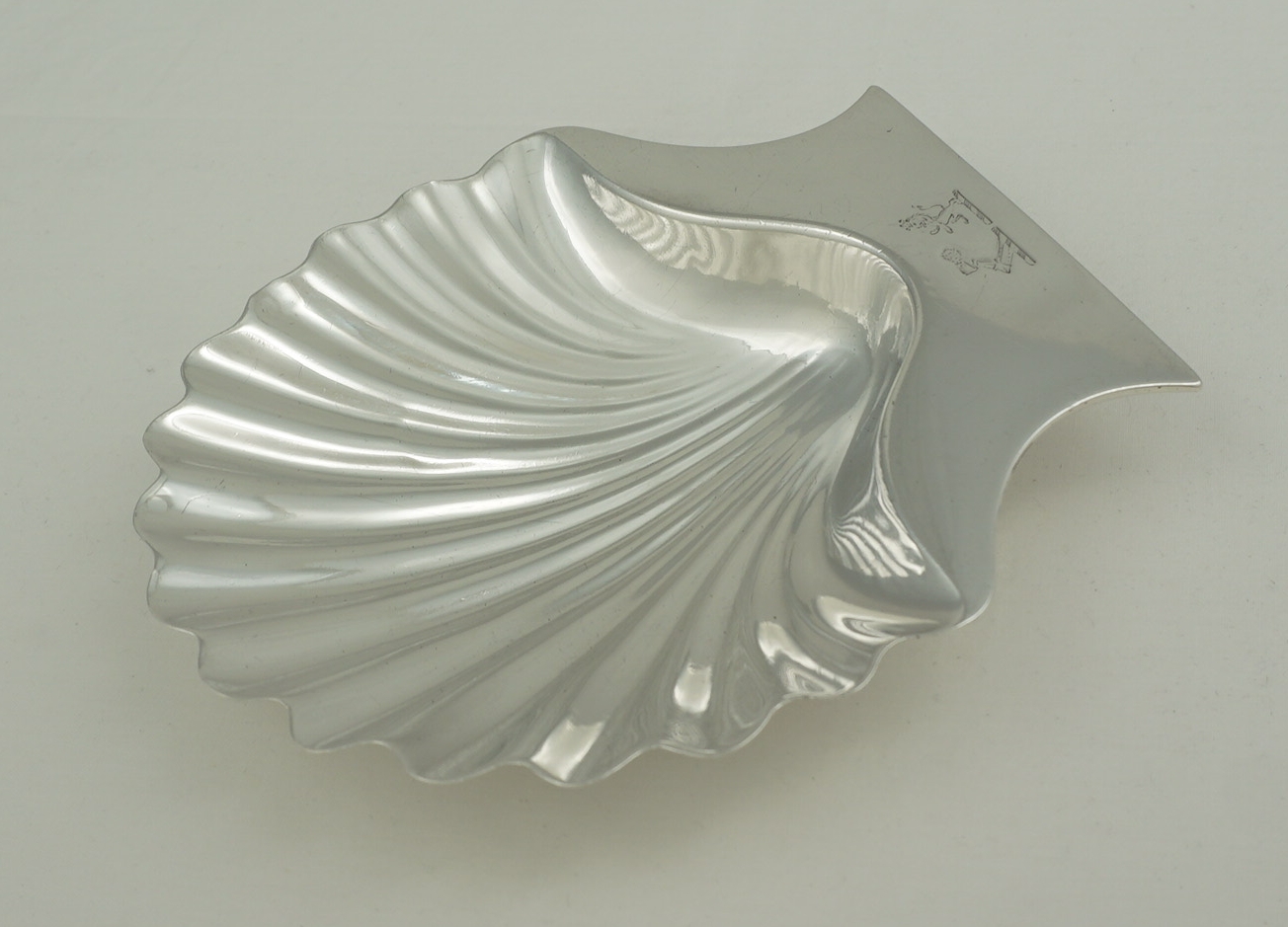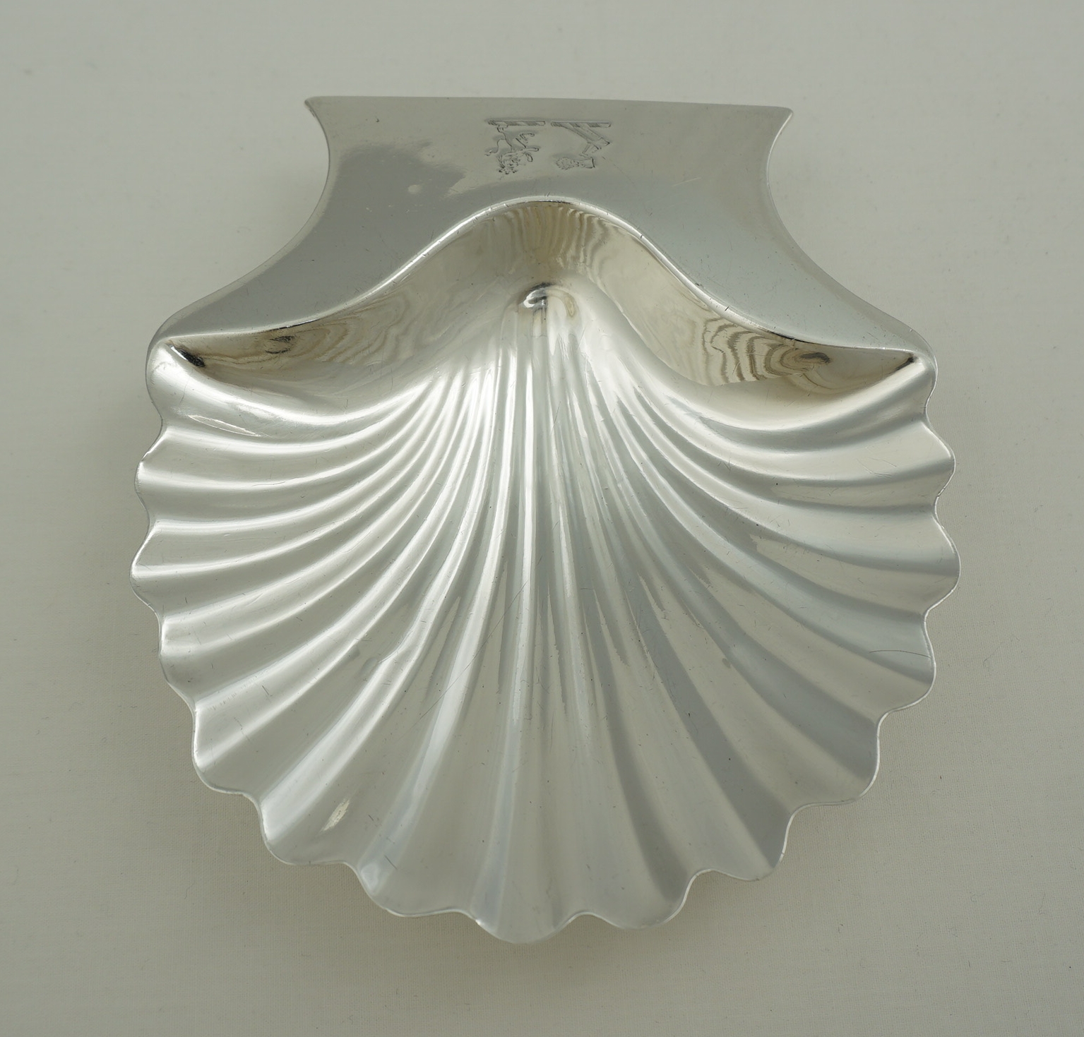 | DESCRIPTION | Good quality and hefty English Georgian solid sterling silver butter shell on three shell feet and with a double crest engraving. |