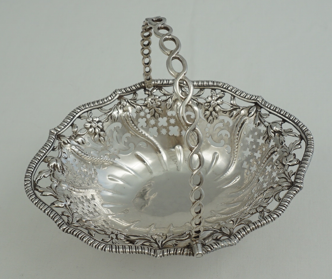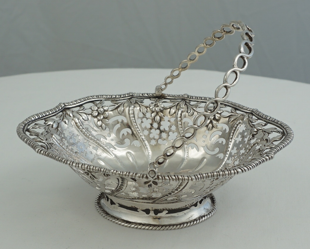 DESCRIPTION | Superb, high quality antique English Georgian pierced solid sterling silver swing handled basket. Possibly once part of an impressive Georgian table centrepiece epergne but works equally well as a fully formed standalone basket. Although styled as the very much larger fruit and bread baskets of the period, this piece was intended for sweetmeats. |
