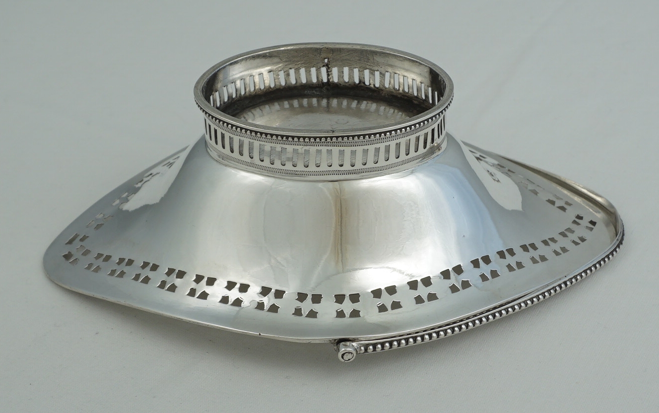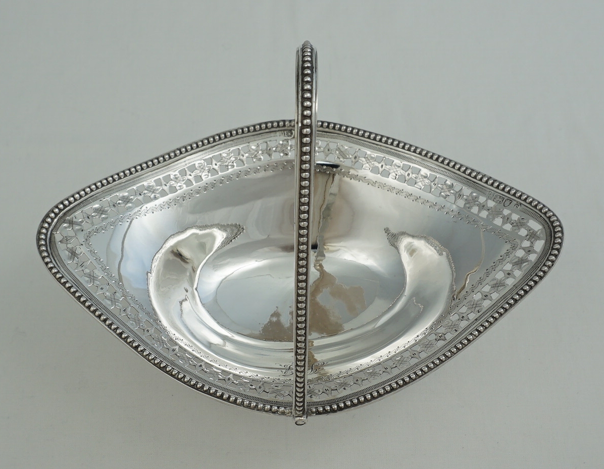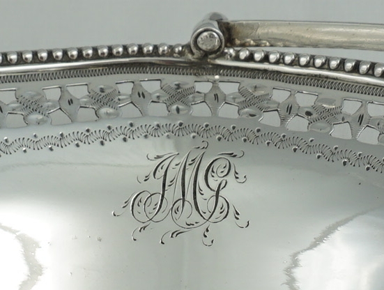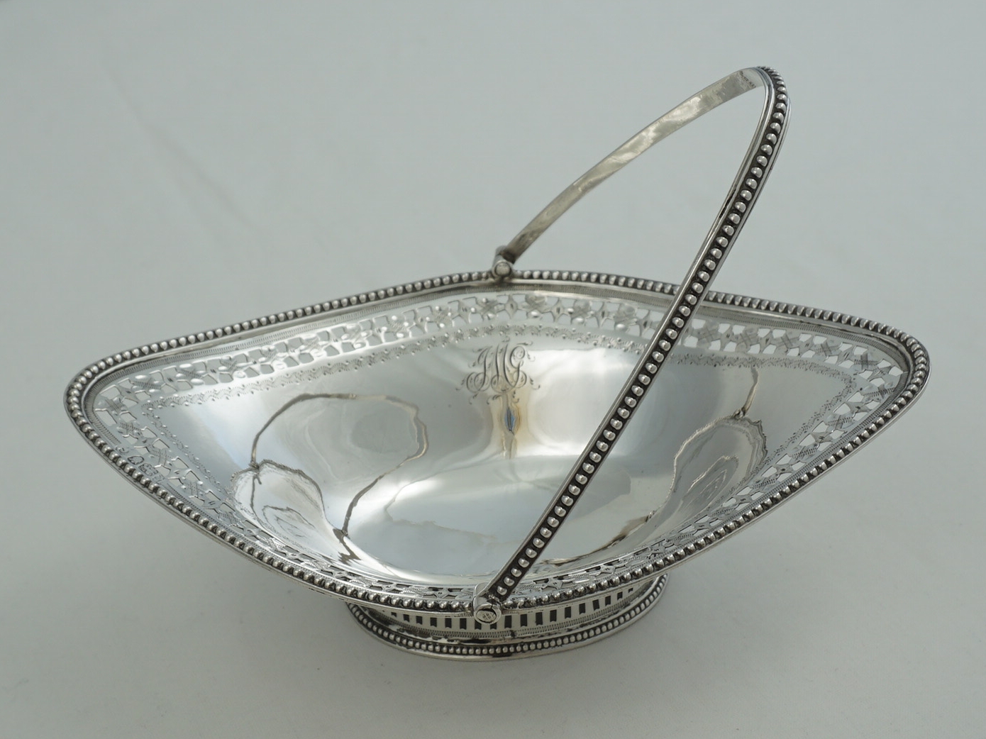 DESCRIPTION | Superb, high quality antique English Georgian pierced solid sterling silver marquise form swing handled basket with a monogram engraving. Possibly once part of an impressive Georgian table centrepiece epergne but works equally well as a fully formed standalone basket. Although styled as the very much larger fruit and bread baskets of the period, this piece was intended for sweetmeats. |