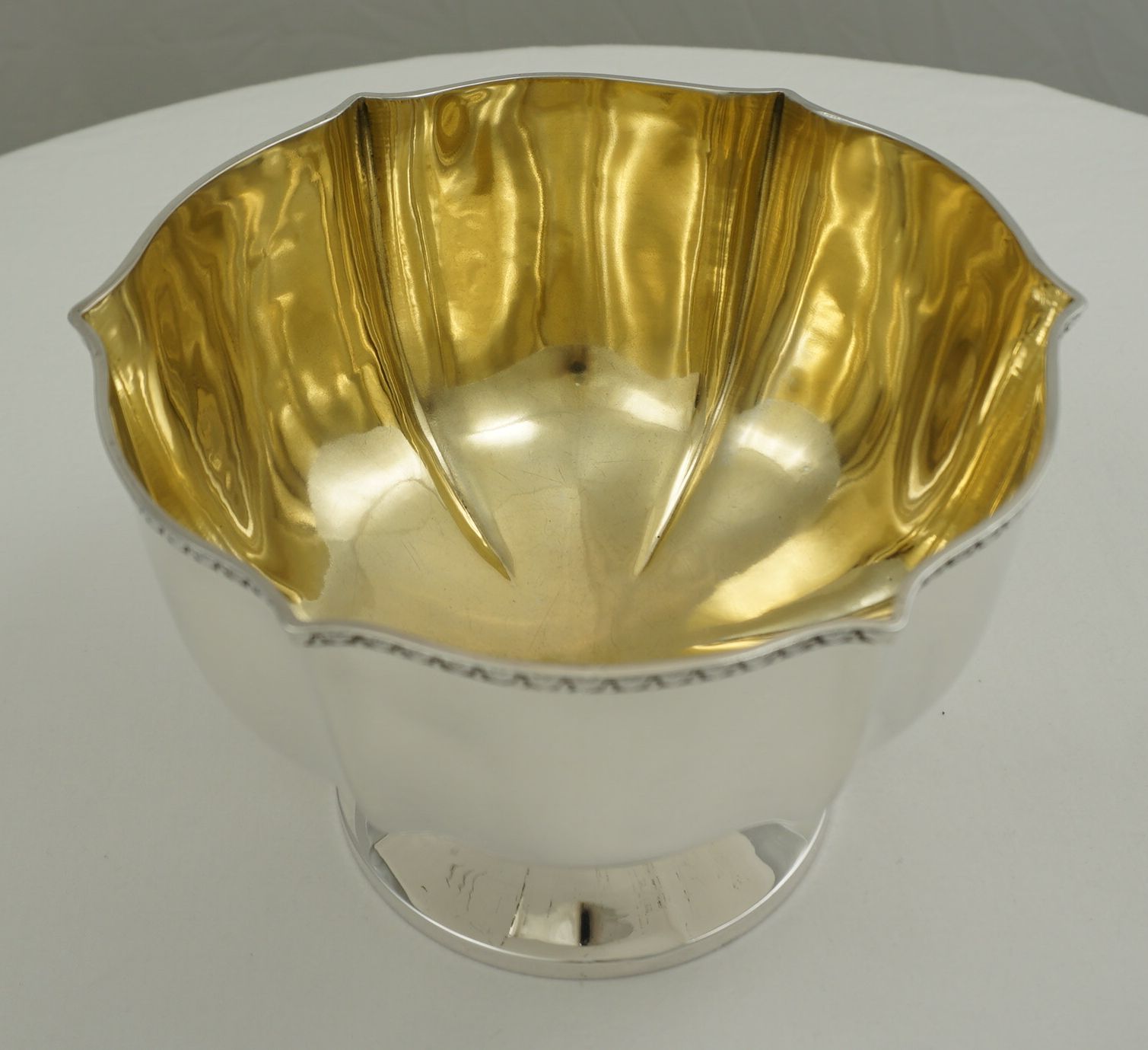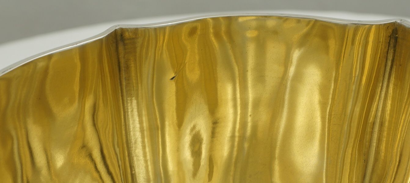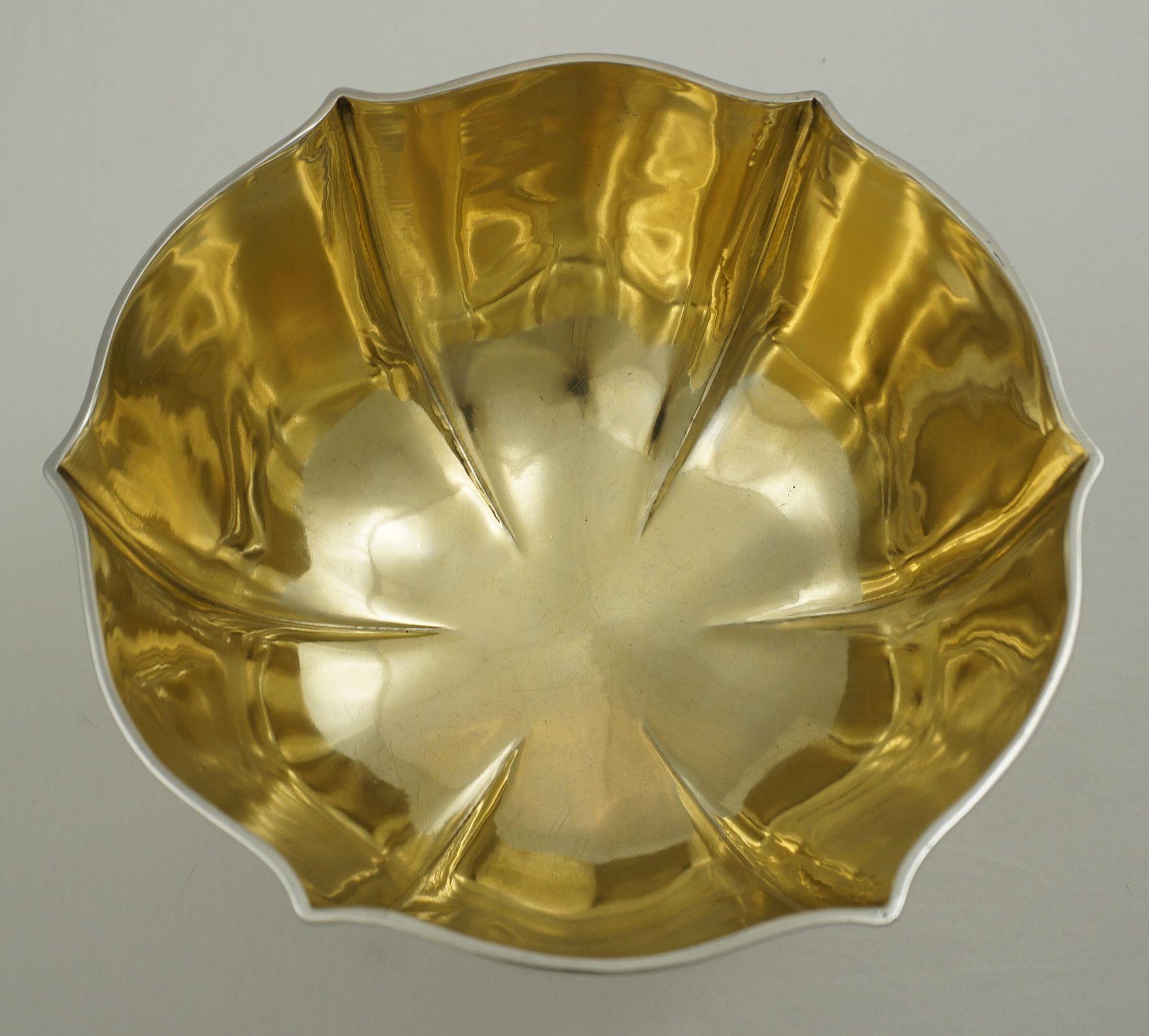 | DESCRIPTION | Antique English solid sterling silver wavy hexaform pedestal bowl with a brightly gilded interior. Not a discreet item, in fact, rather large and blingy with polished silver and gold. |