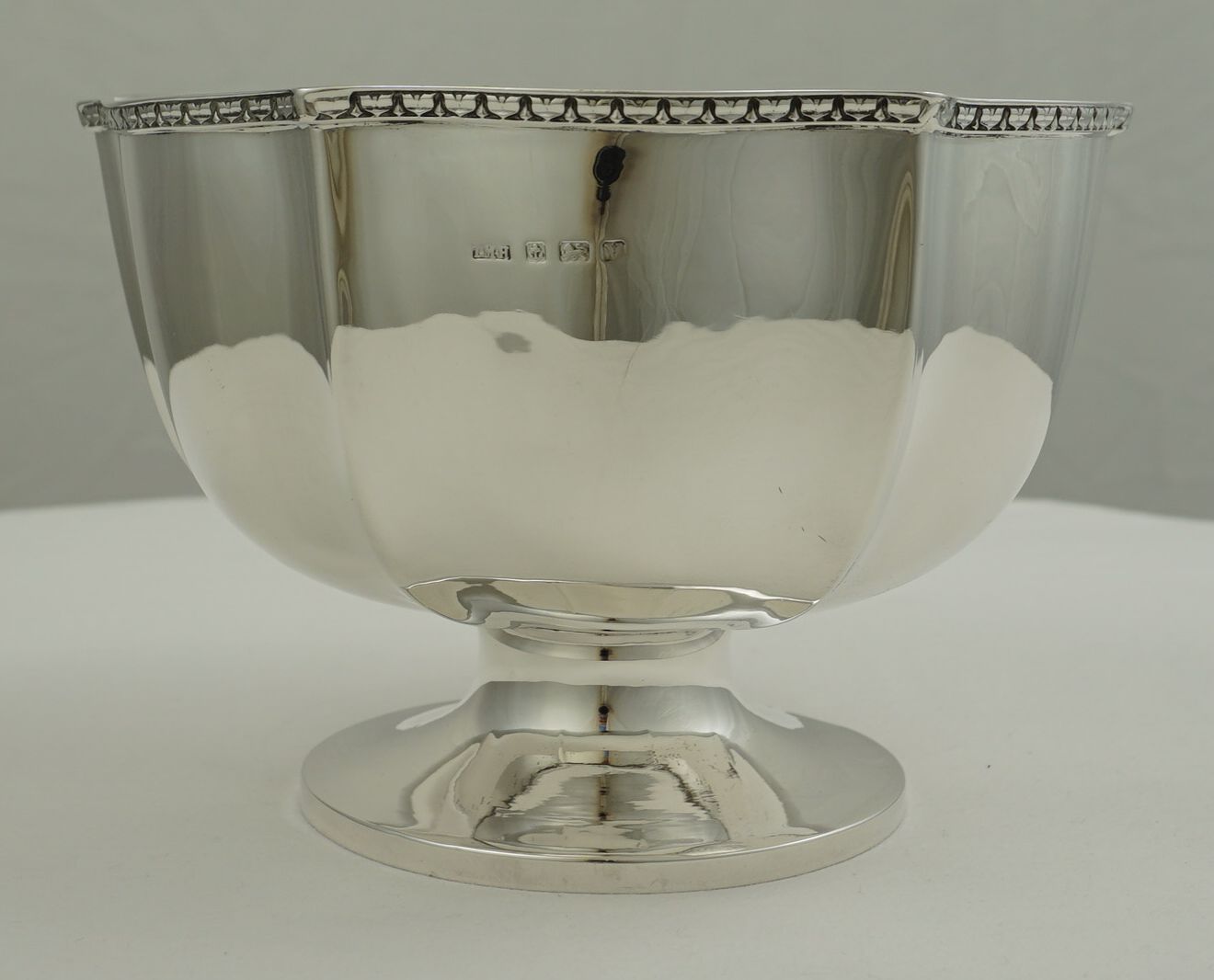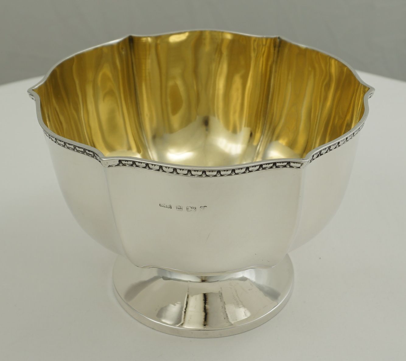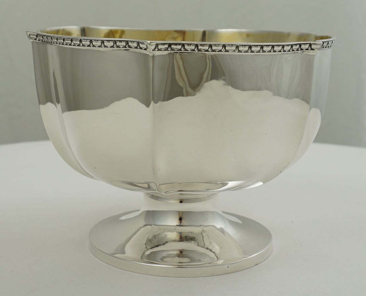 | DESCRIPTION | Antique English solid sterling silver wavy hexaform pedestal bowl with a brightly gilded interior. Not a discreet item, in fact, rather large and blingy with polished silver and gold. |