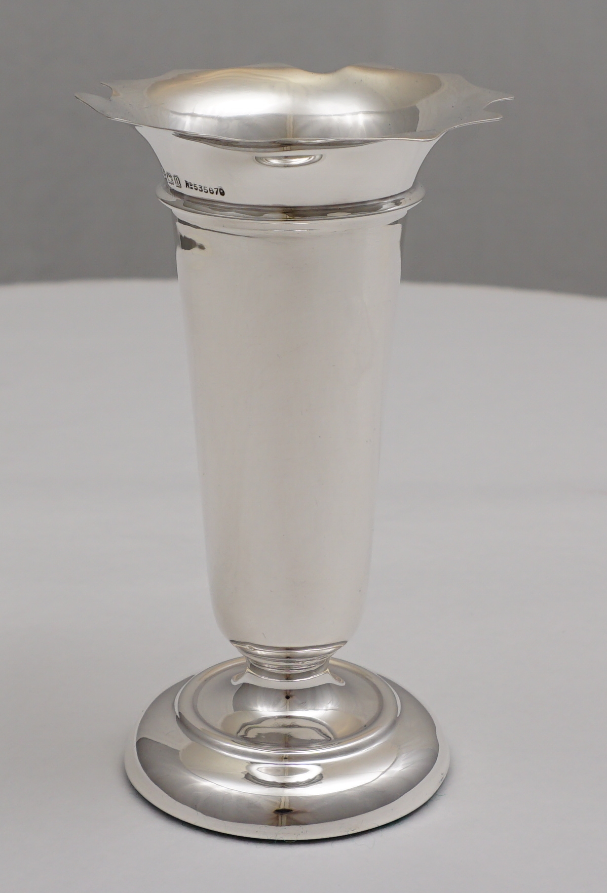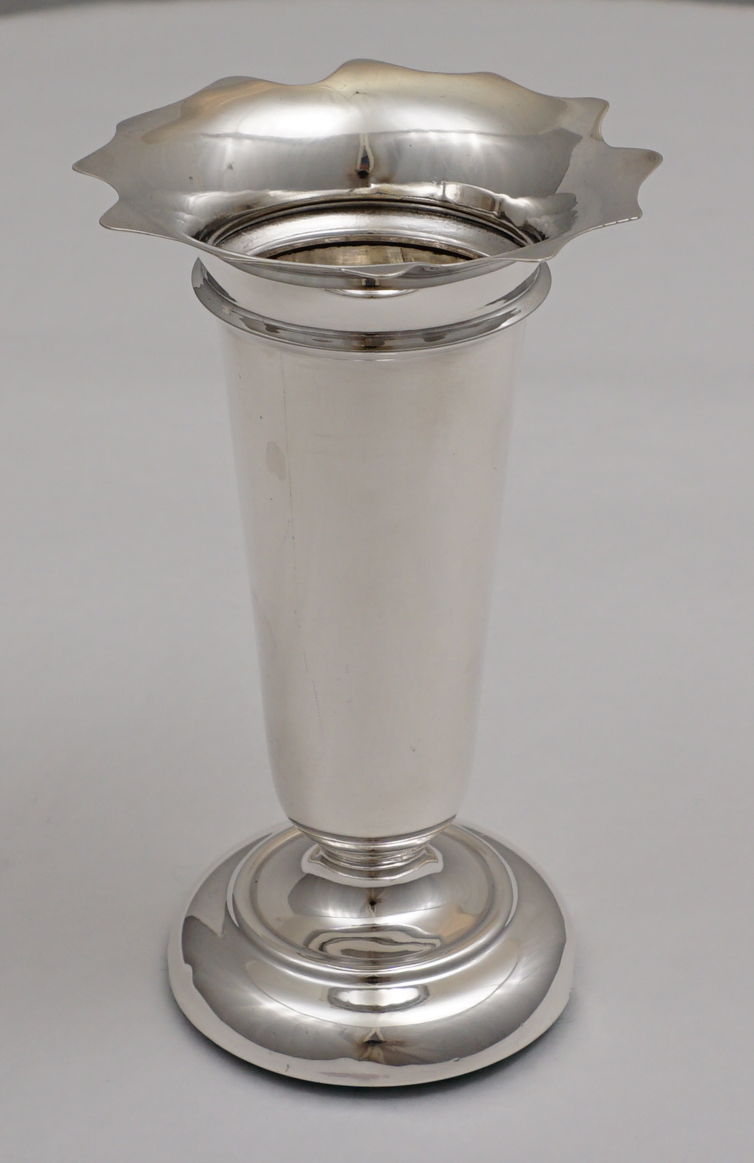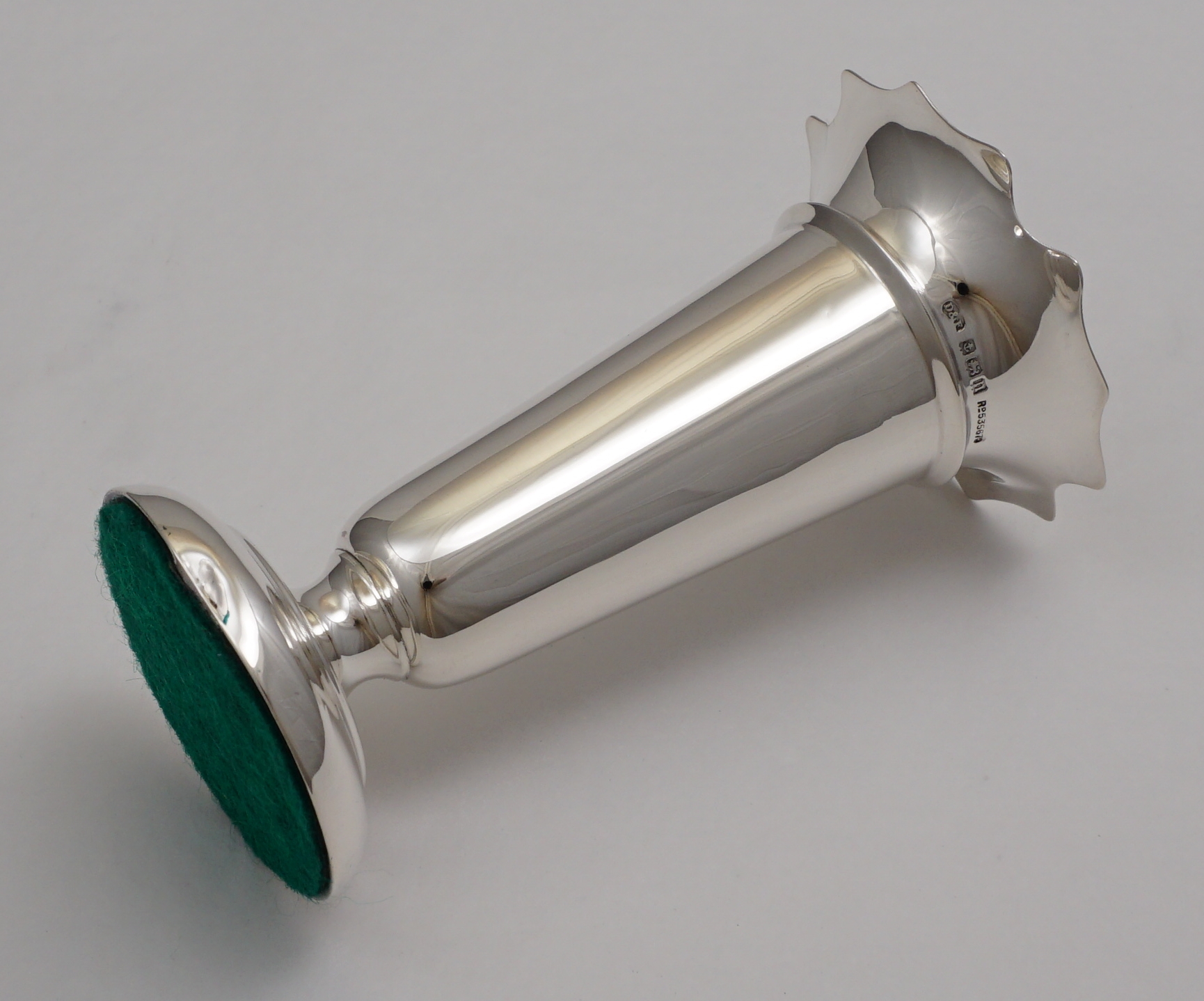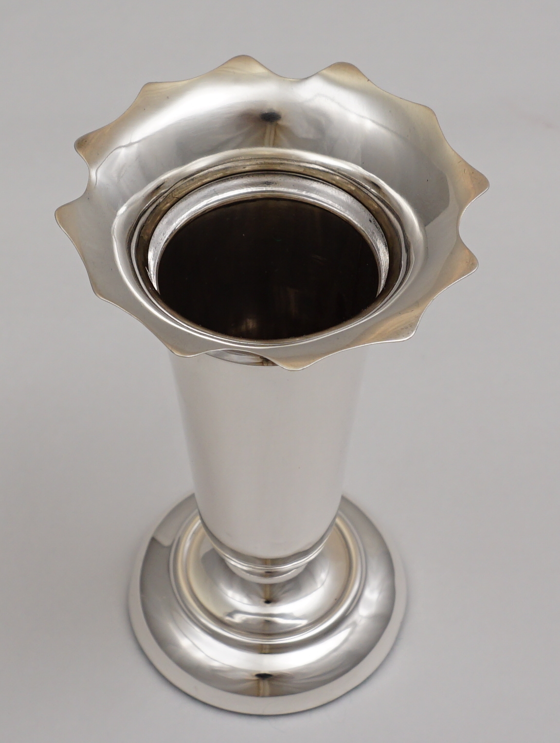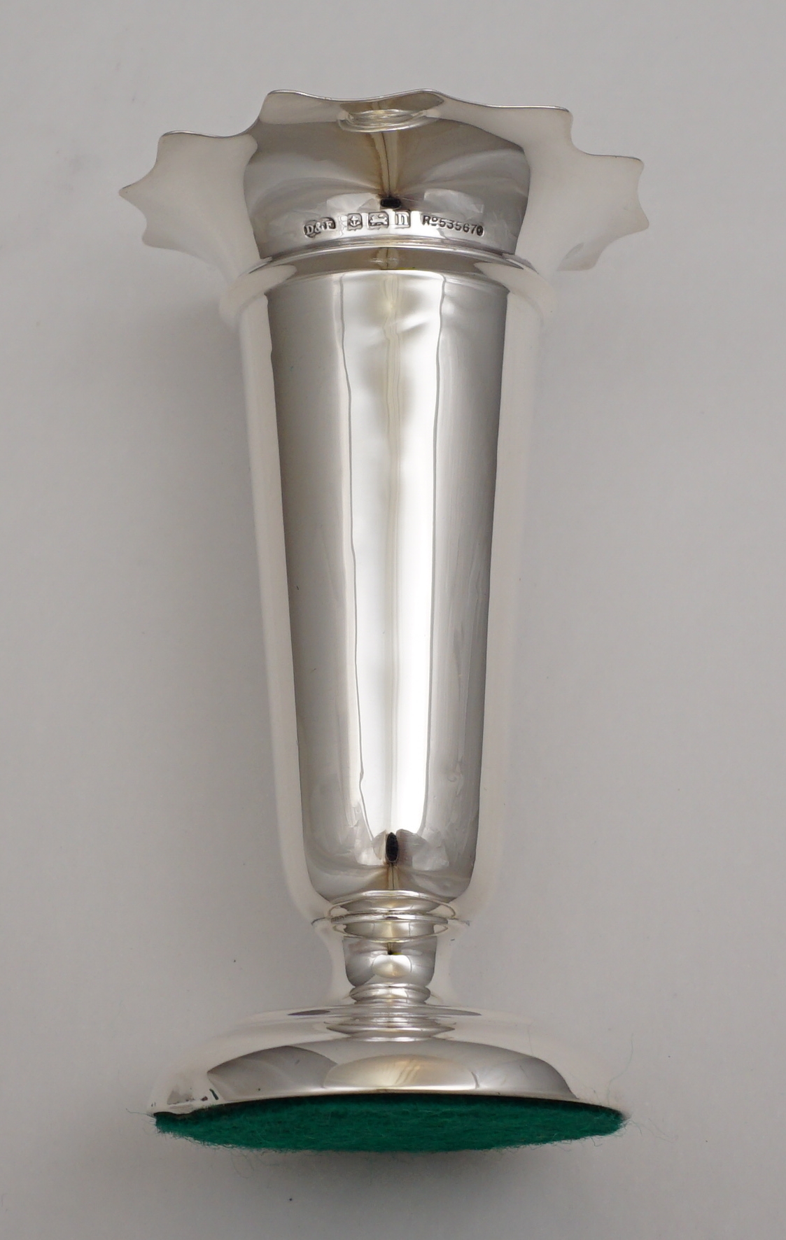 | DESCRIPTION | Pretty and useful base loaded antique English solid sterling silver posy vase with a flared rim and felt bottom. |