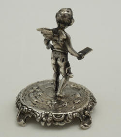 2" Antique Hanau silver miniature figure of a cherub reading aloud from a poetry book, or possibly delivering a love letter, London 1901. |