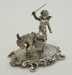 2 ½" Antique Hanau silver miniature figure of a cherub driving a donkey with panniers, both supported by a rococo plinth, William Moering, London 1899. |