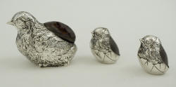 Three pin cushions comprising of the mother hen and two chicks, Sampson Mordan, Chester 1907. |
