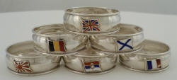 Six 1 ½" each enamelled with a flag. Great Britain, the Rising Sun of Japan, France, Belgium, Serbia, Russian Naval Ensign, Birmingham 1914, 42mm, 27g. |