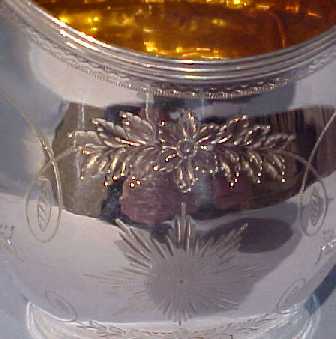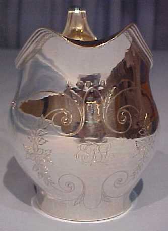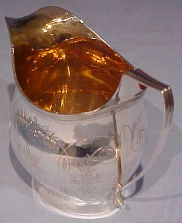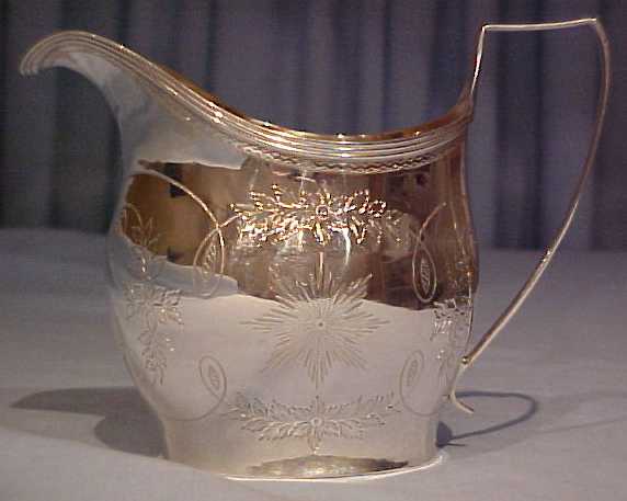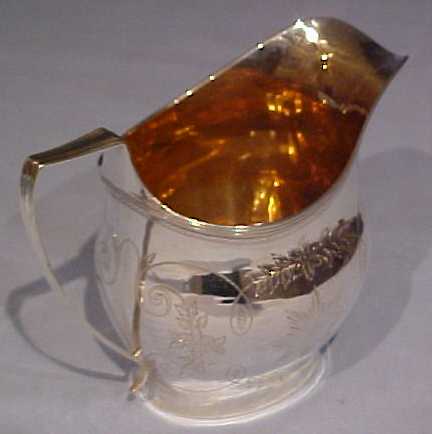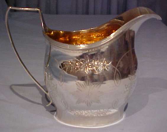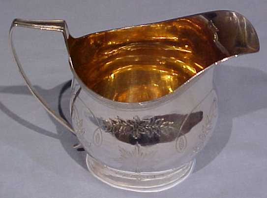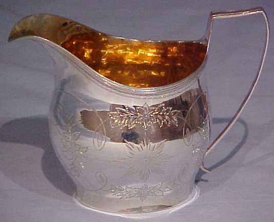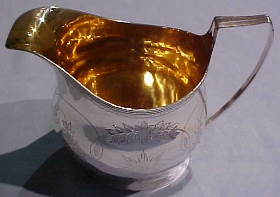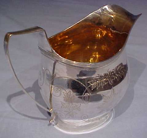 Beautiful Georgian silver milk or cream jug with bright cut and prick engraved decoration and a gilded interior. The front has an engraved monogram 'EBL'. |