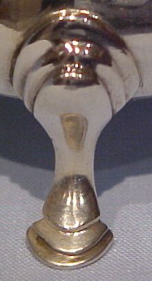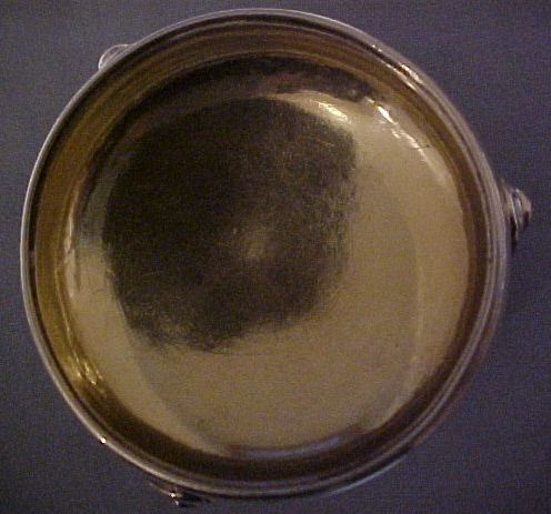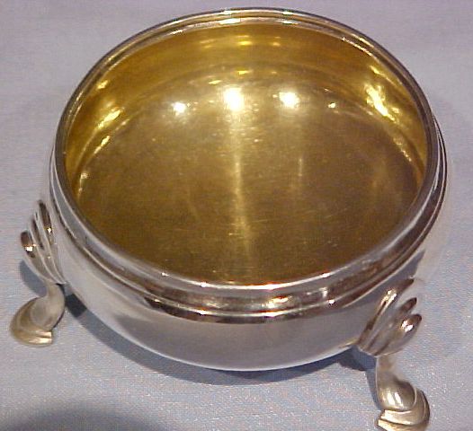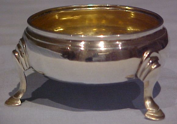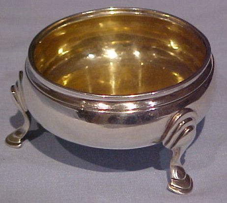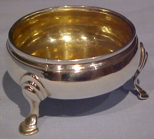 Georgian silver cauldron salt with a gilded interior and three hoof feet. The gilding protects the silver from corrosive action by the salt and negates the need for a glass liner. This item is safe for food use. | ||