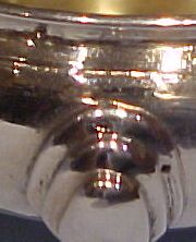 Three original casting flaws showing as two pin like pricks to one thigh and one beneath the rim. All pictured below. |