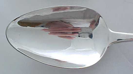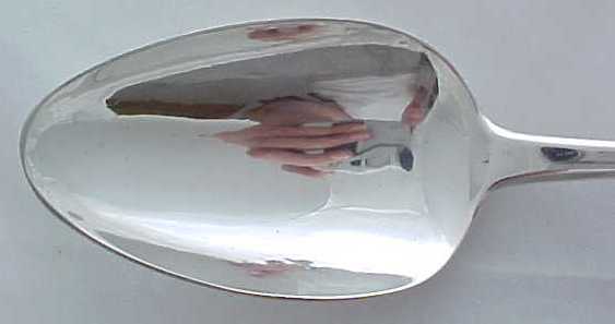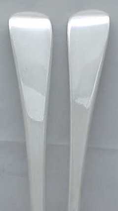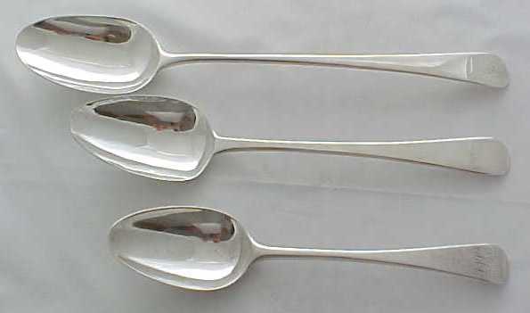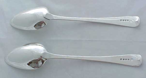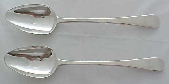 Pair of Georgian silver Old English pattern serving spoons that have not been engraved. These are a bit longer than table spoons and shown in the last image between a table spoon and basting spoon of the period. |