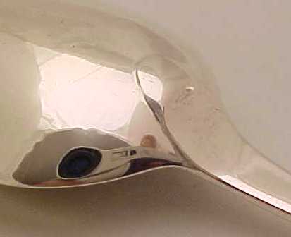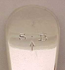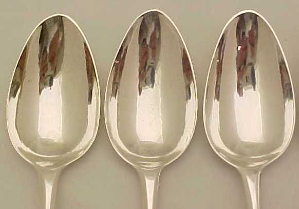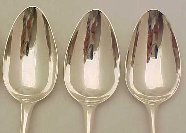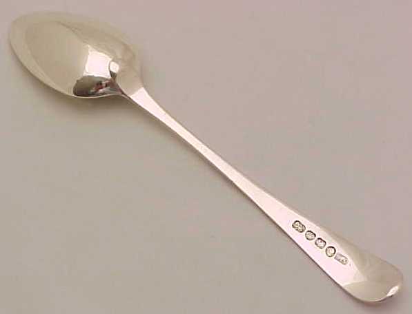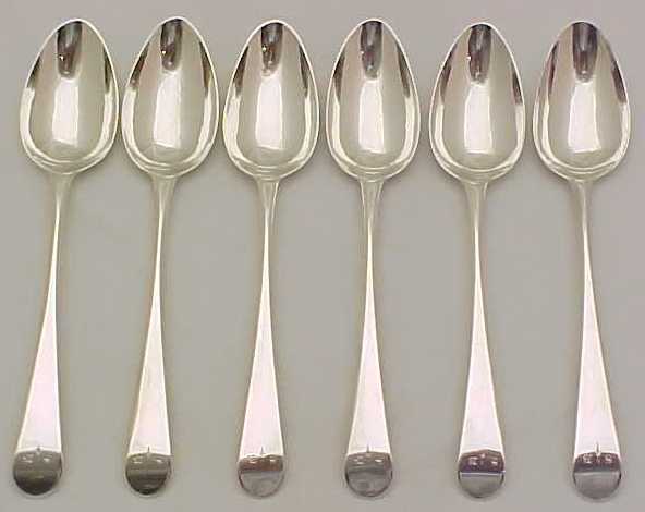 Set of six silver Old English pattern dessert spoons with simple initial engraved terminals. |