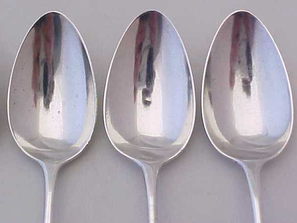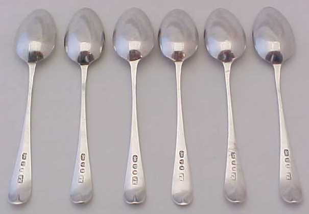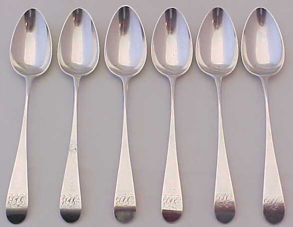 Set of six Georgian silver Old English pattern tea spoons with long drops and contemporary frontal monogram engravings. |