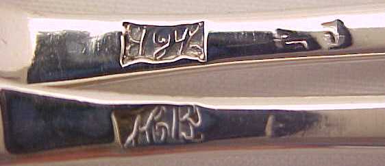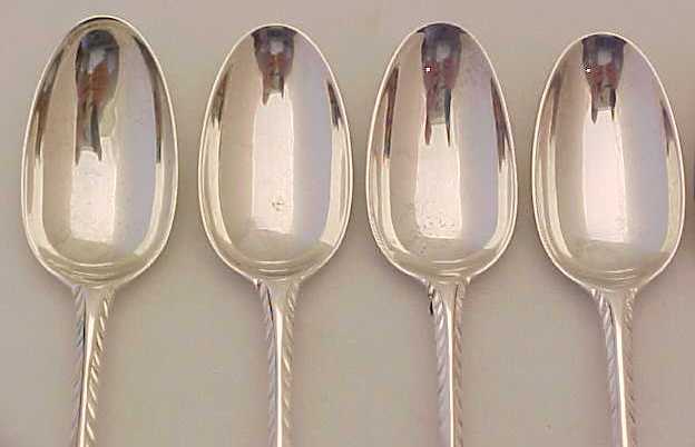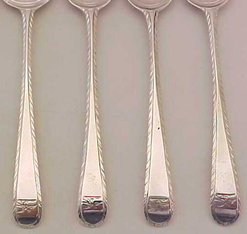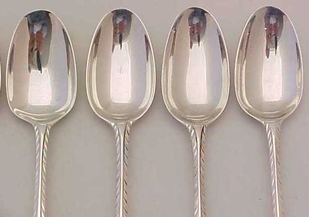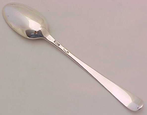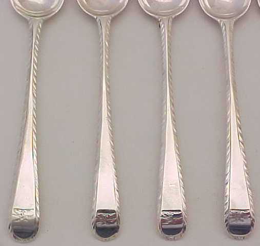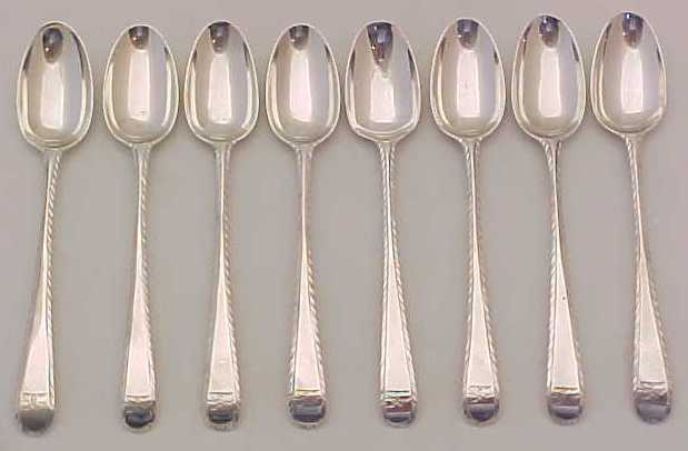 Set of eight bottom hallmarked feather edged crested Georgian silver long Old English pattern small spoons. These are longer and with narrower bowls than usual Hester B. tea spoons. Possibly for chocolate. |