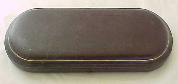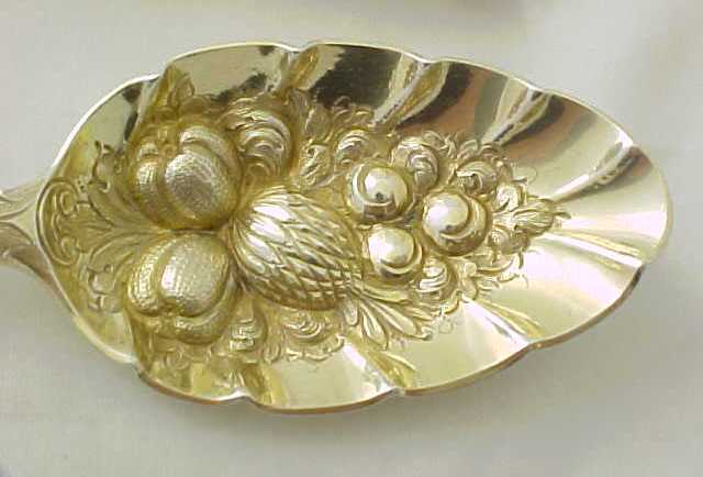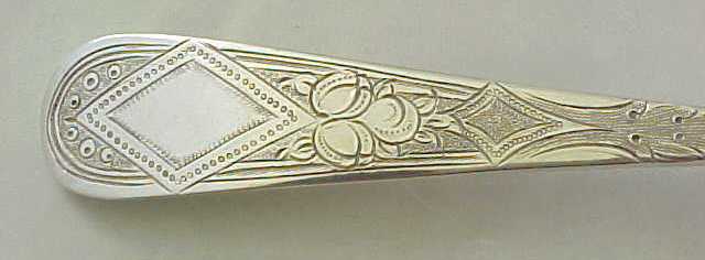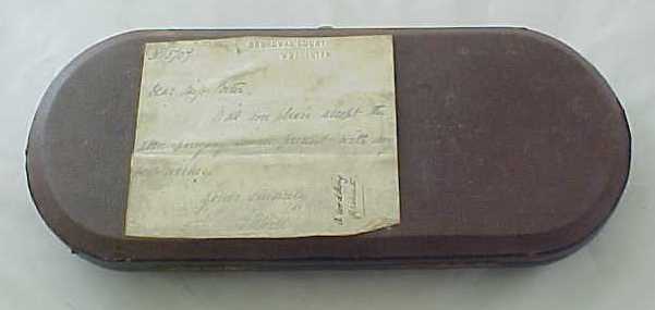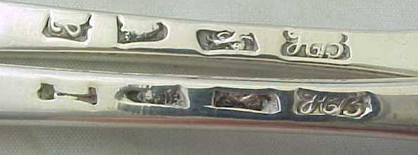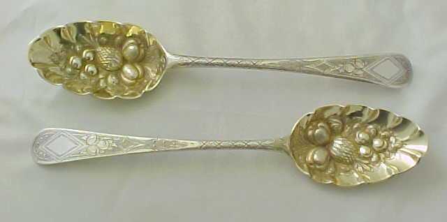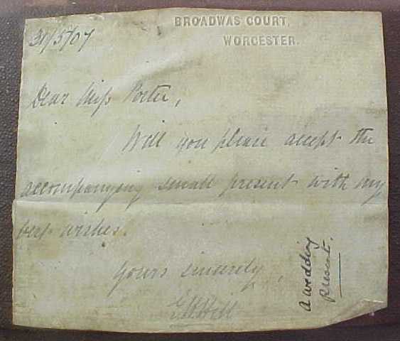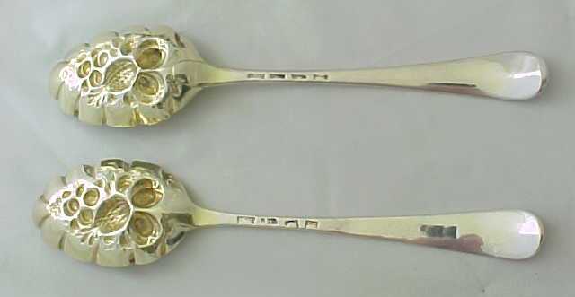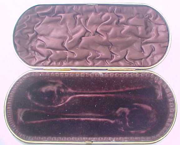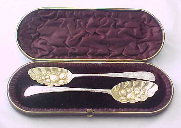 Cased pair of Georgian silver Old English pattern table spoons with later 'berry' decoration. The quality of the later 'berry' decoration of these spoons can vary but in this case it is superb, as befits a pair of blanks by Hester Bateman. The gilded leather case is fitted out with sumptuous burgundy silk and velvet. To the base of the case is a label from George Birley & Company, Silversmiths, next to Old Bank, Worcester. George Birley appears to have been a retailer rather than a silversmith. Over his trade label is an interesting presentation note from Broadwas Court, Worcester dated 31/5/07 (1907). It reads 'Dear Miss Porter, Will you please accept the accompanying small present with my best wishes. Yours sincerely E. H. Hill.' A different hand, probably Miss Porter's has added 'A wedding present'. The E. H. Hill is probably Edward Henry Hill listed as living at Broadwas Court in 1879. |