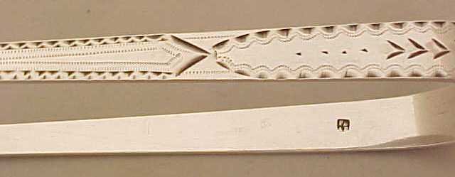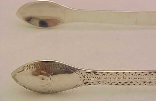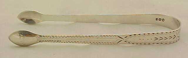 Georgian silver bright cut sugar tongs with acorn grips. |