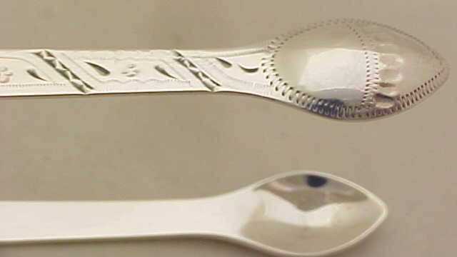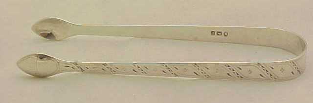 Georgian silver bright cut sugar tongs with acorn grips and the original initial engraving. |