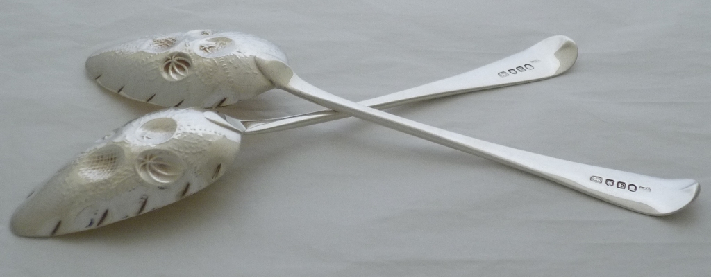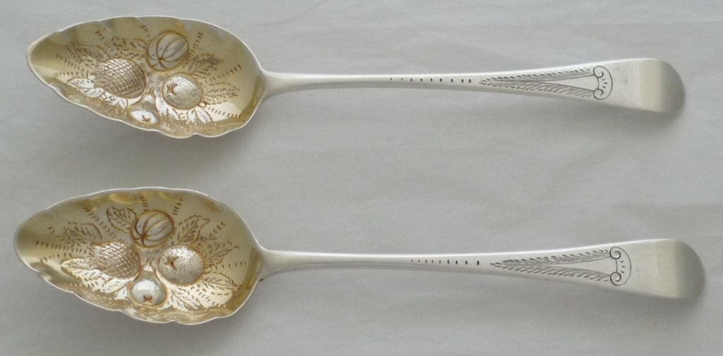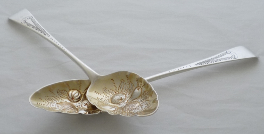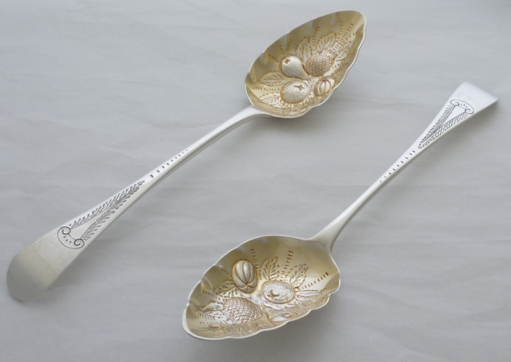 Pair of Georgian solid silver Old English pattern 'Berry' serving spoons with later decoration and gilded bowls. |