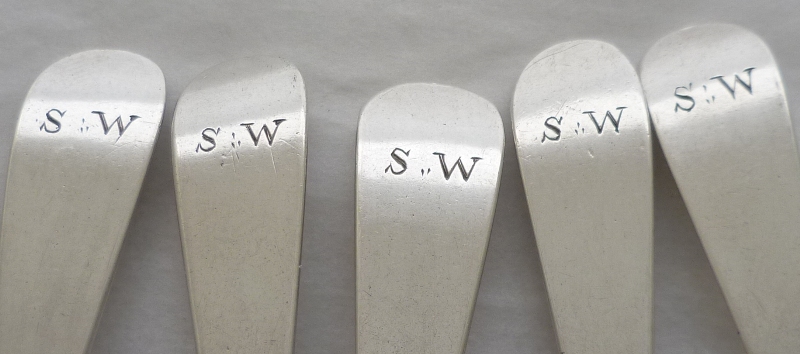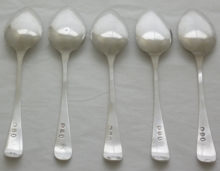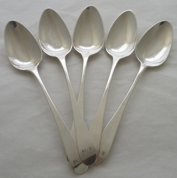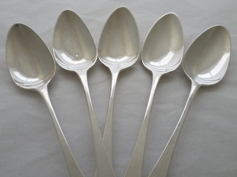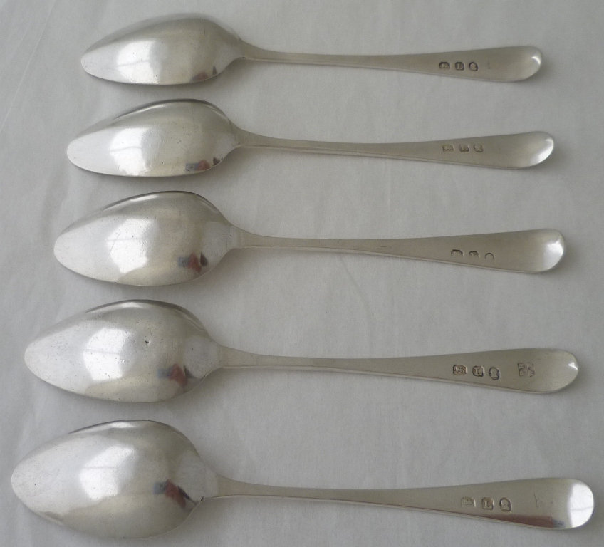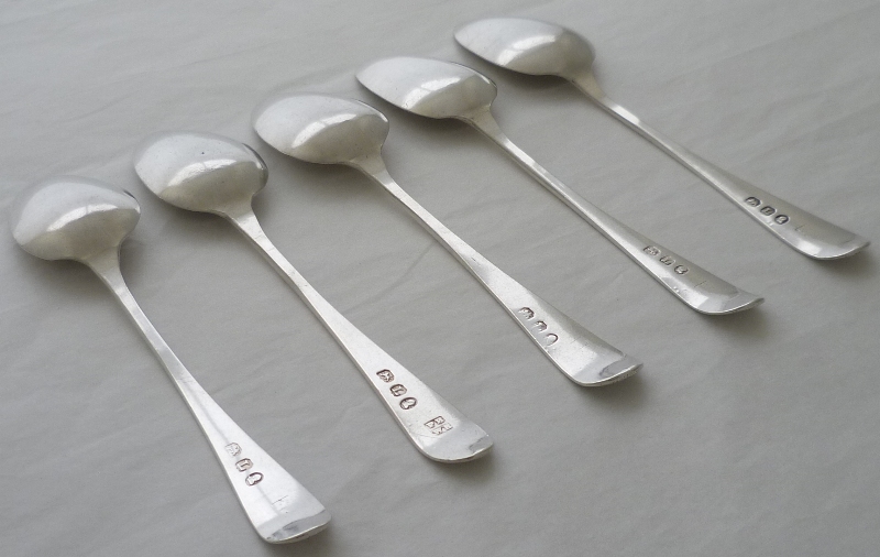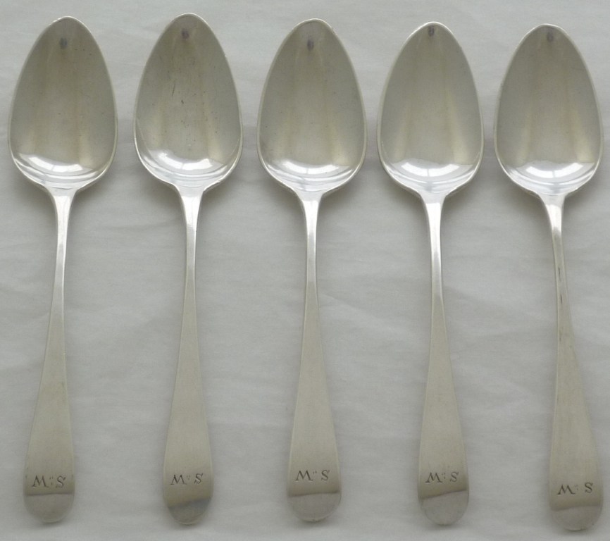 Set of five Georgian solid silver Old English pattern teaspoons with original initial engravings to the terminals. Elongated bowls of surprisingly thick silver with flattened long drops verso. |