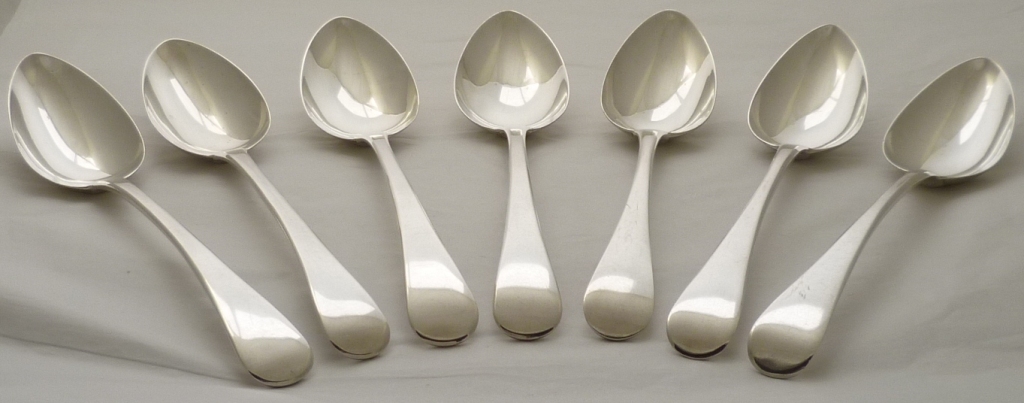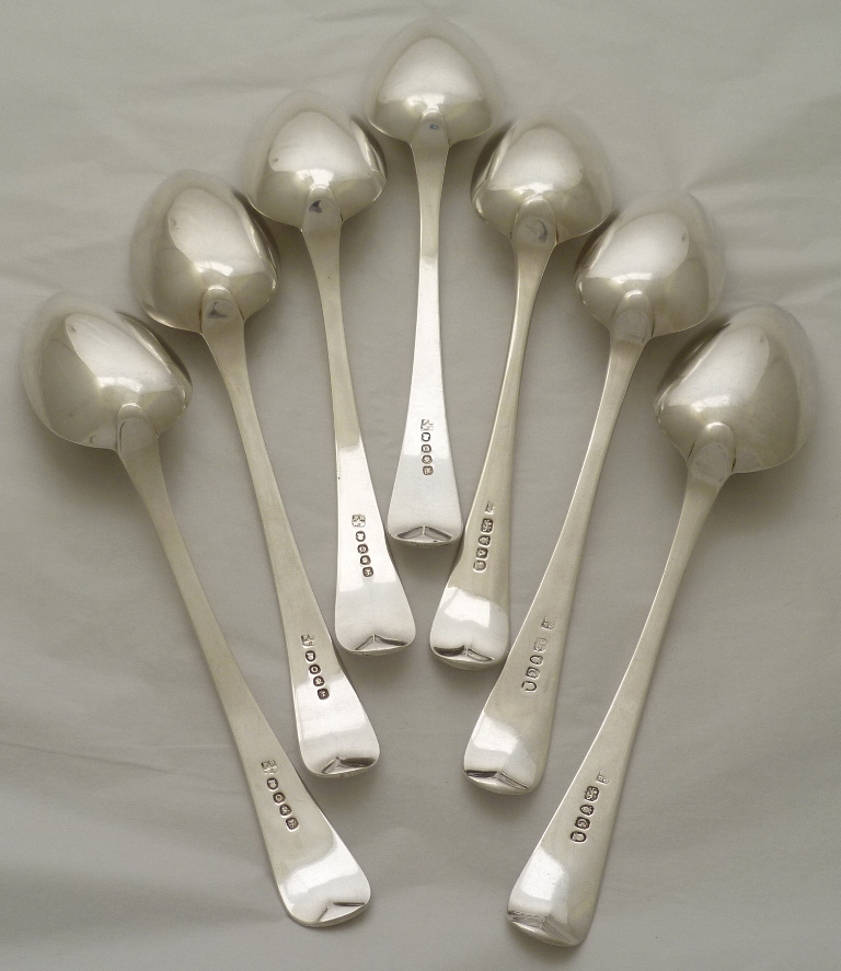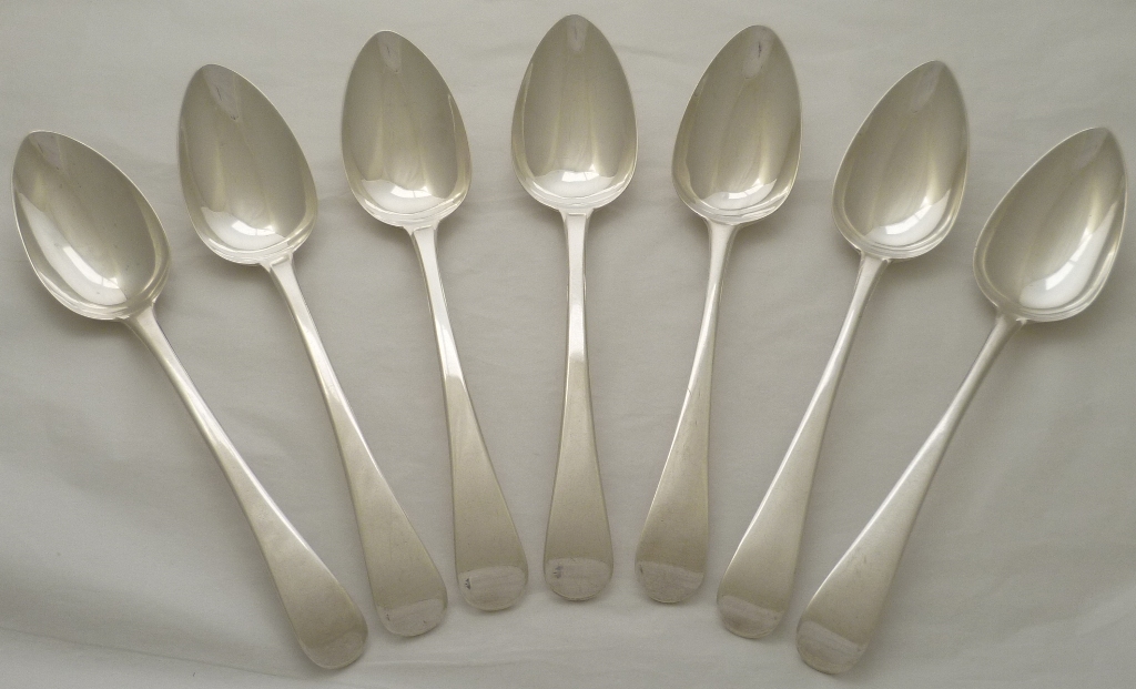 Very good set of seven large Georgian silver Old English pattern table spoons. |