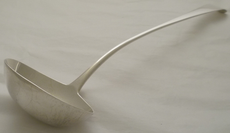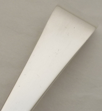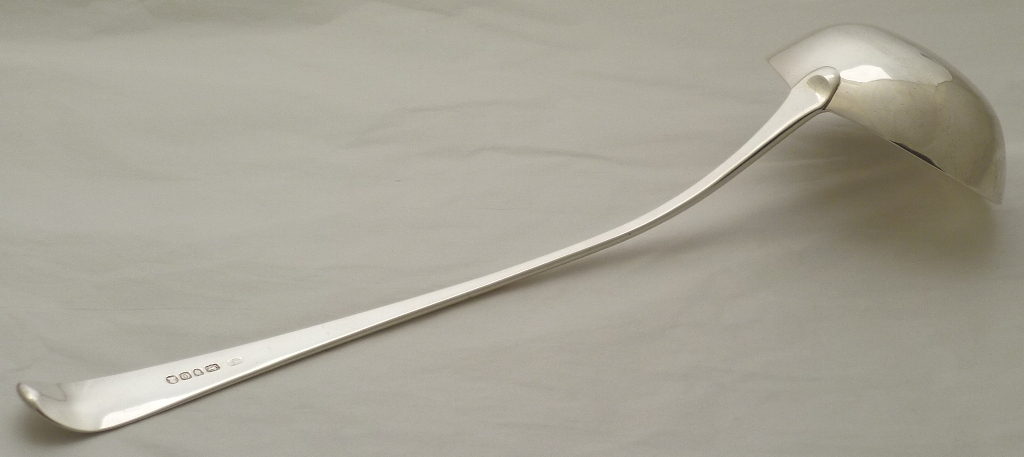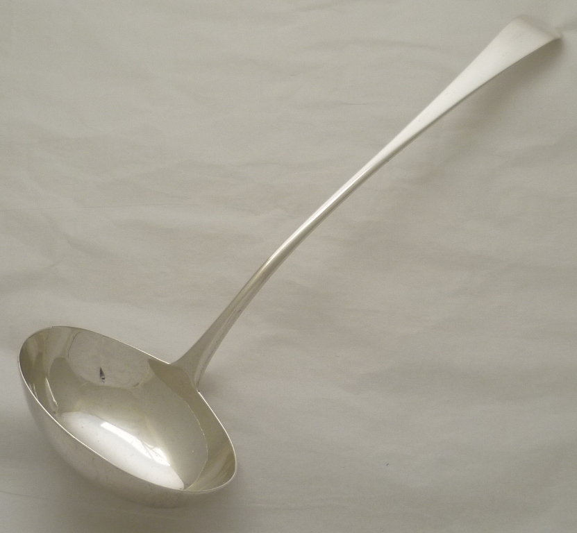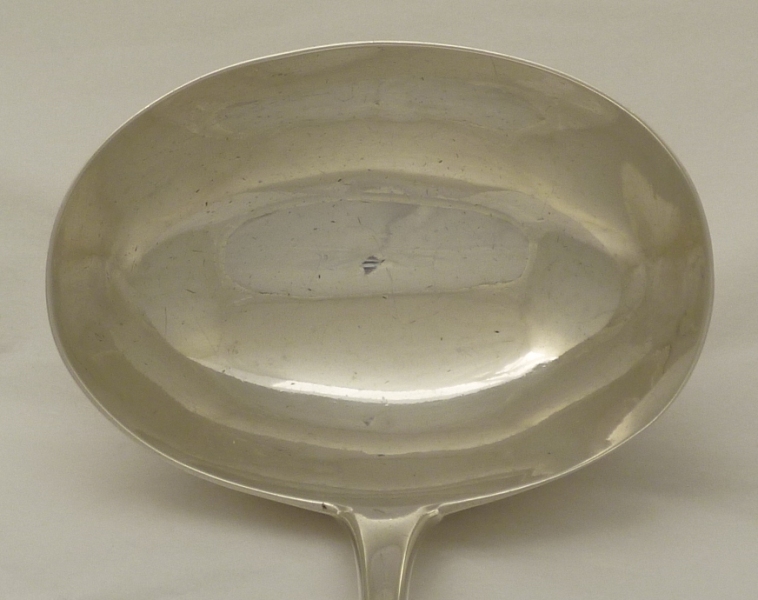 Large Georgian silver Old English pattern soup ladle with an oval bowl and no engraving. Very unusual for flatware of this period not to have been engraved so I suspect a well executed erasure even though I can find no evidence. |