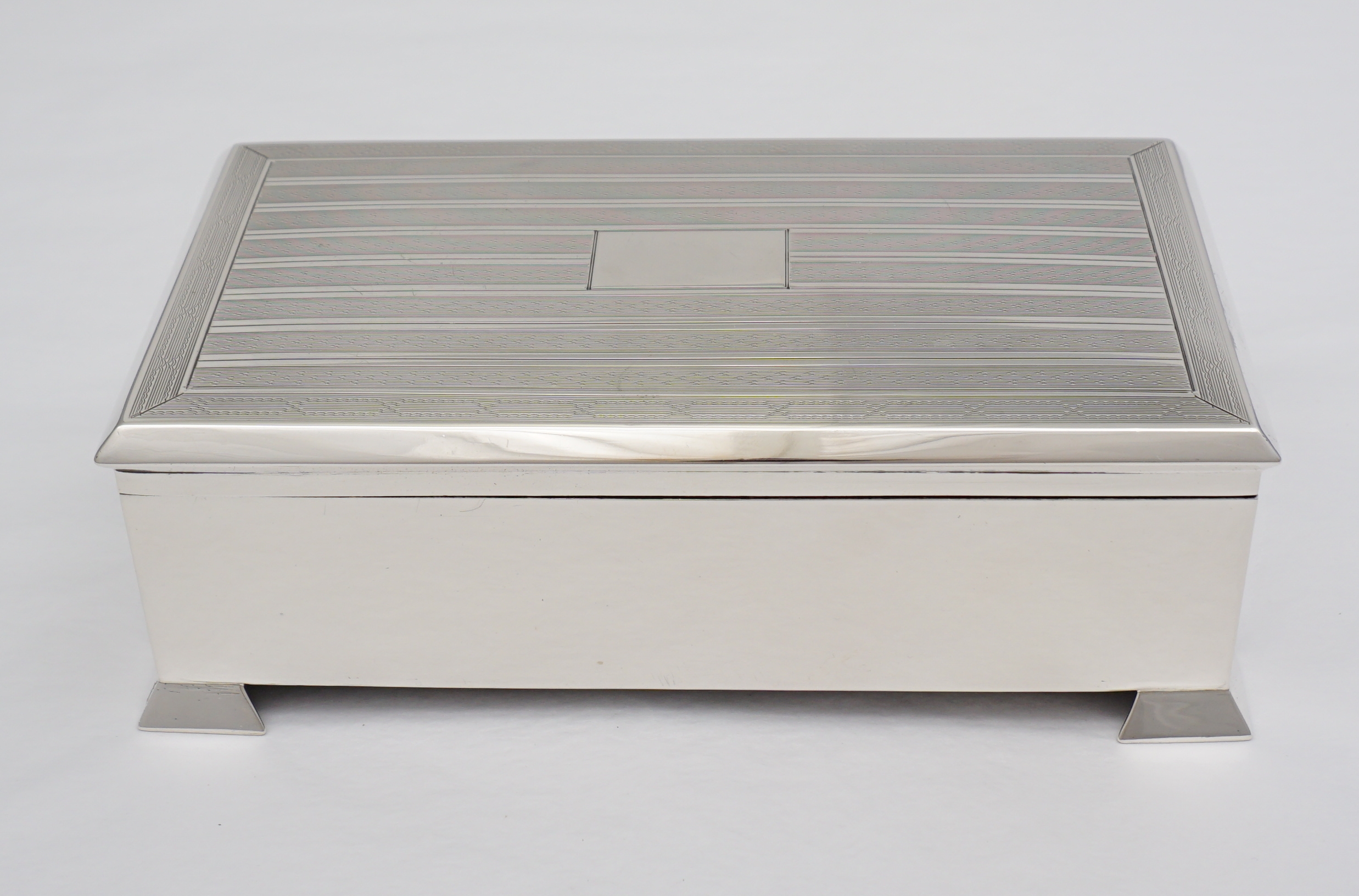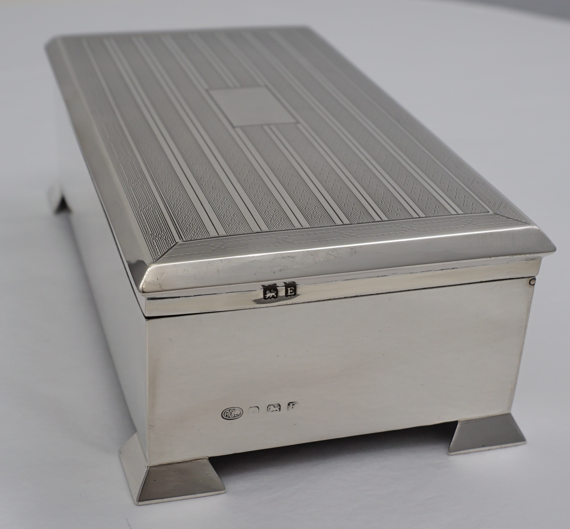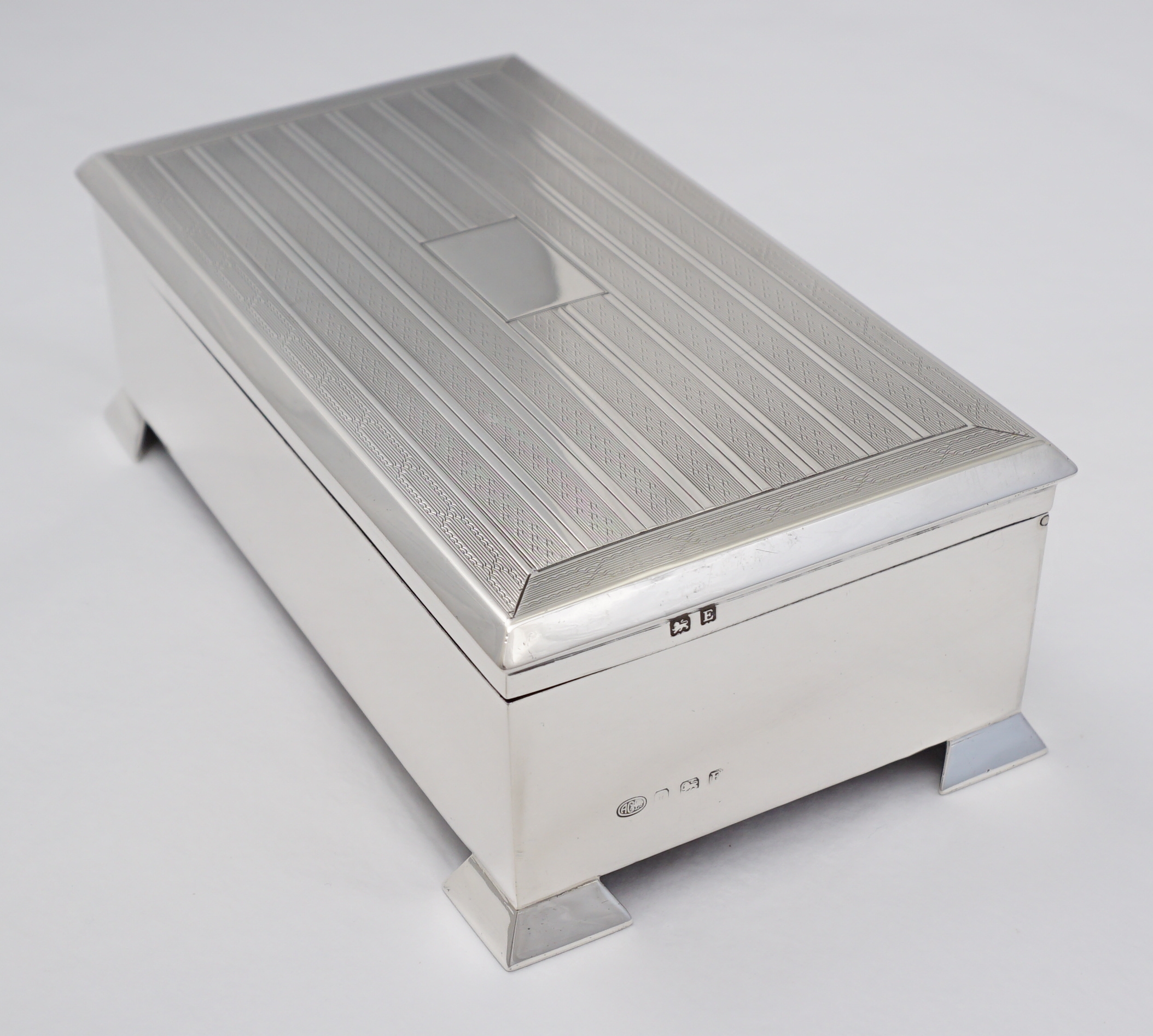 DESCRIPTION | Magnificent, high quality and stylish English sterling silver Art Deco cigarette box with a piano hinged and engine turned engraved lid with a blank cartouche, four bracket feet and a fully fitted and complete cedar interior that still smells good. |