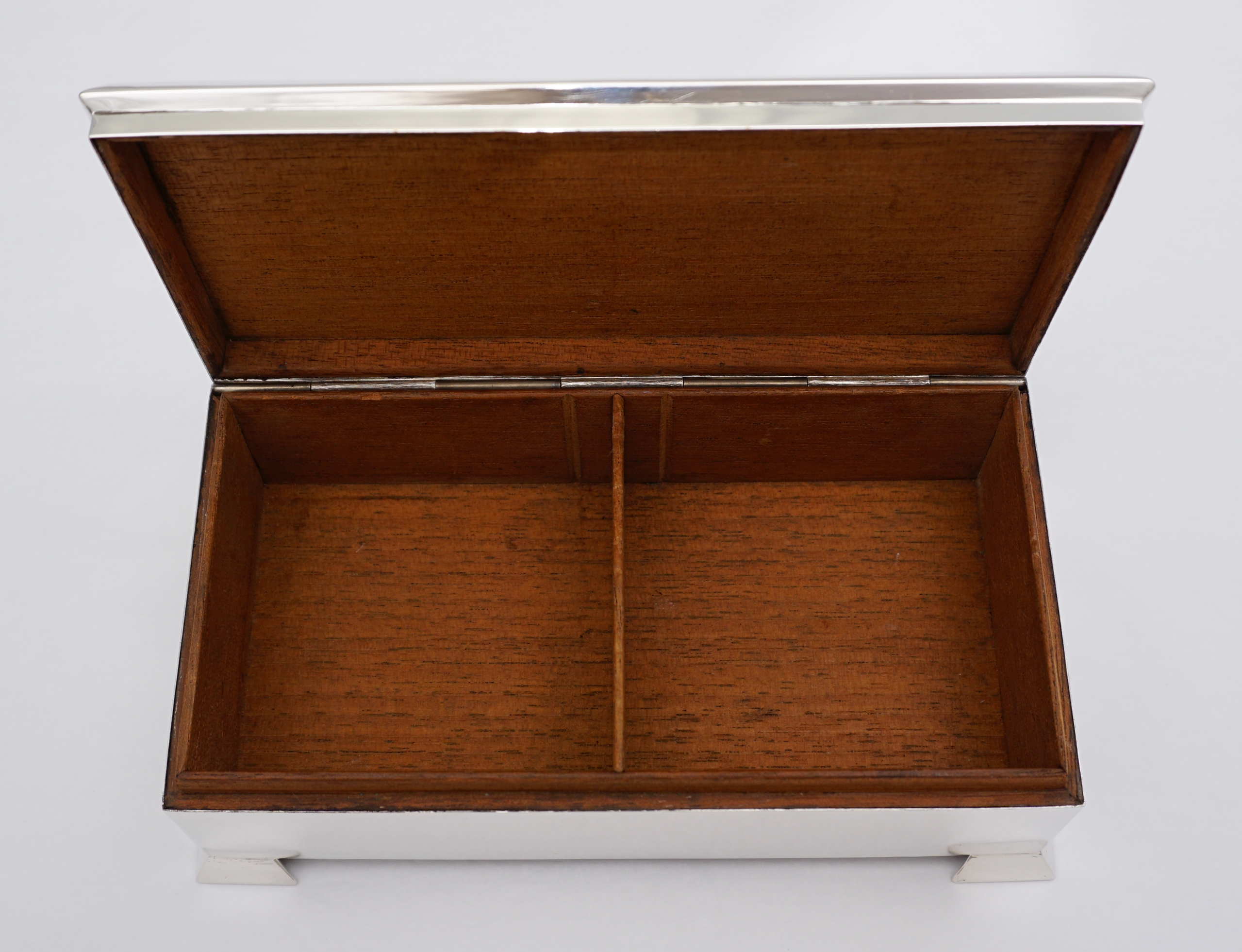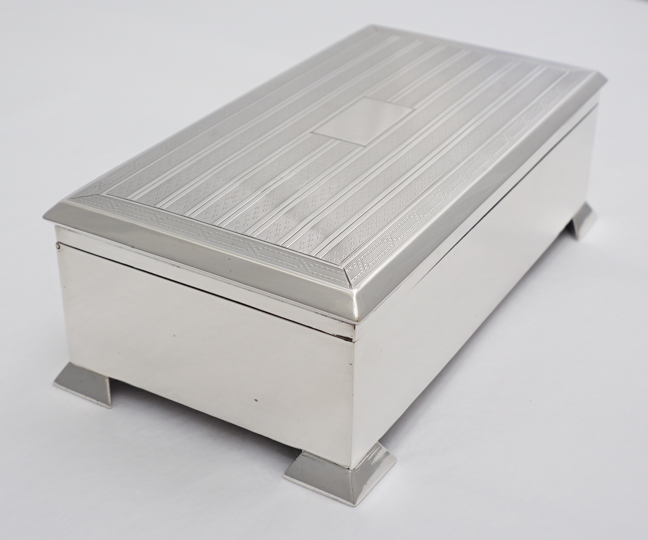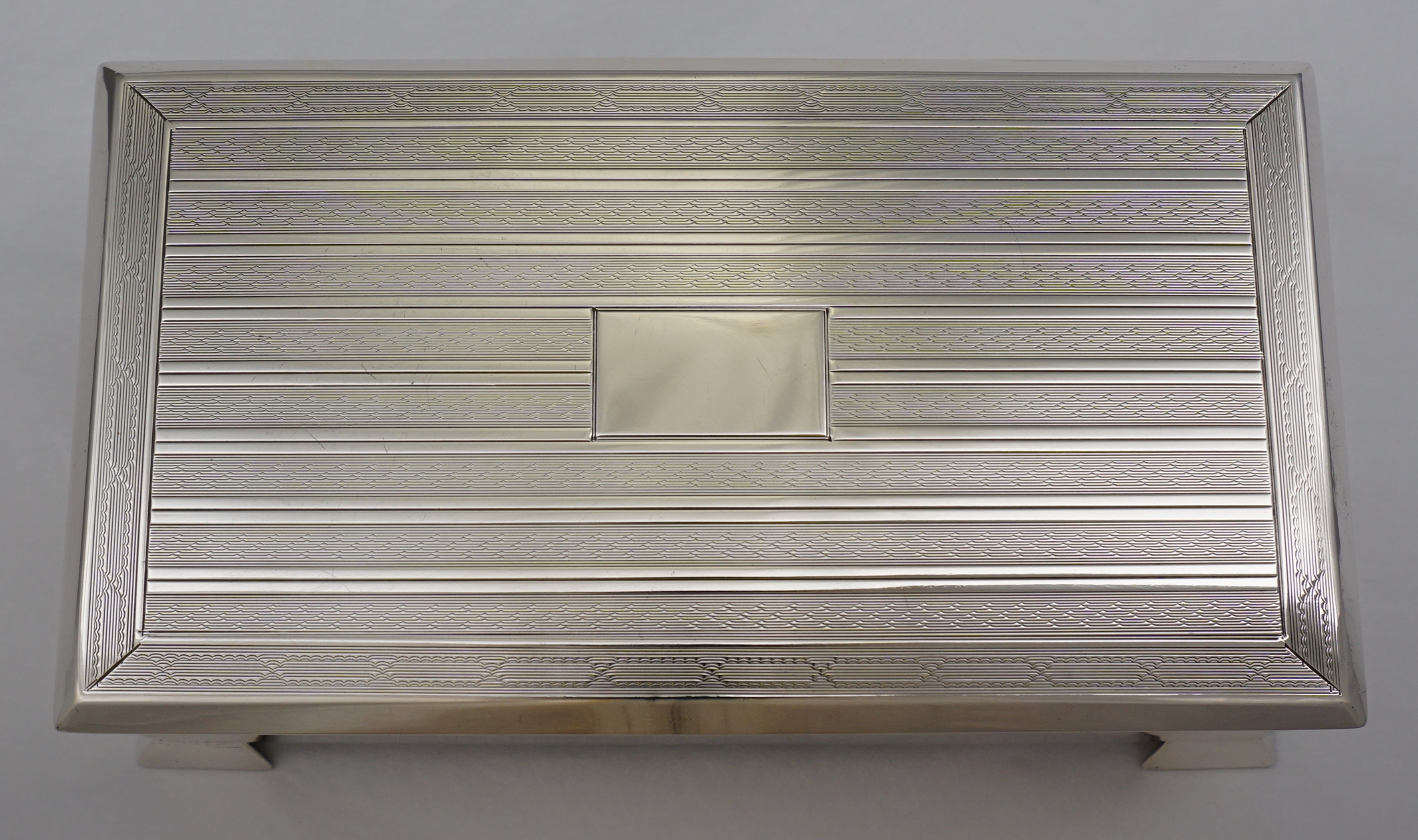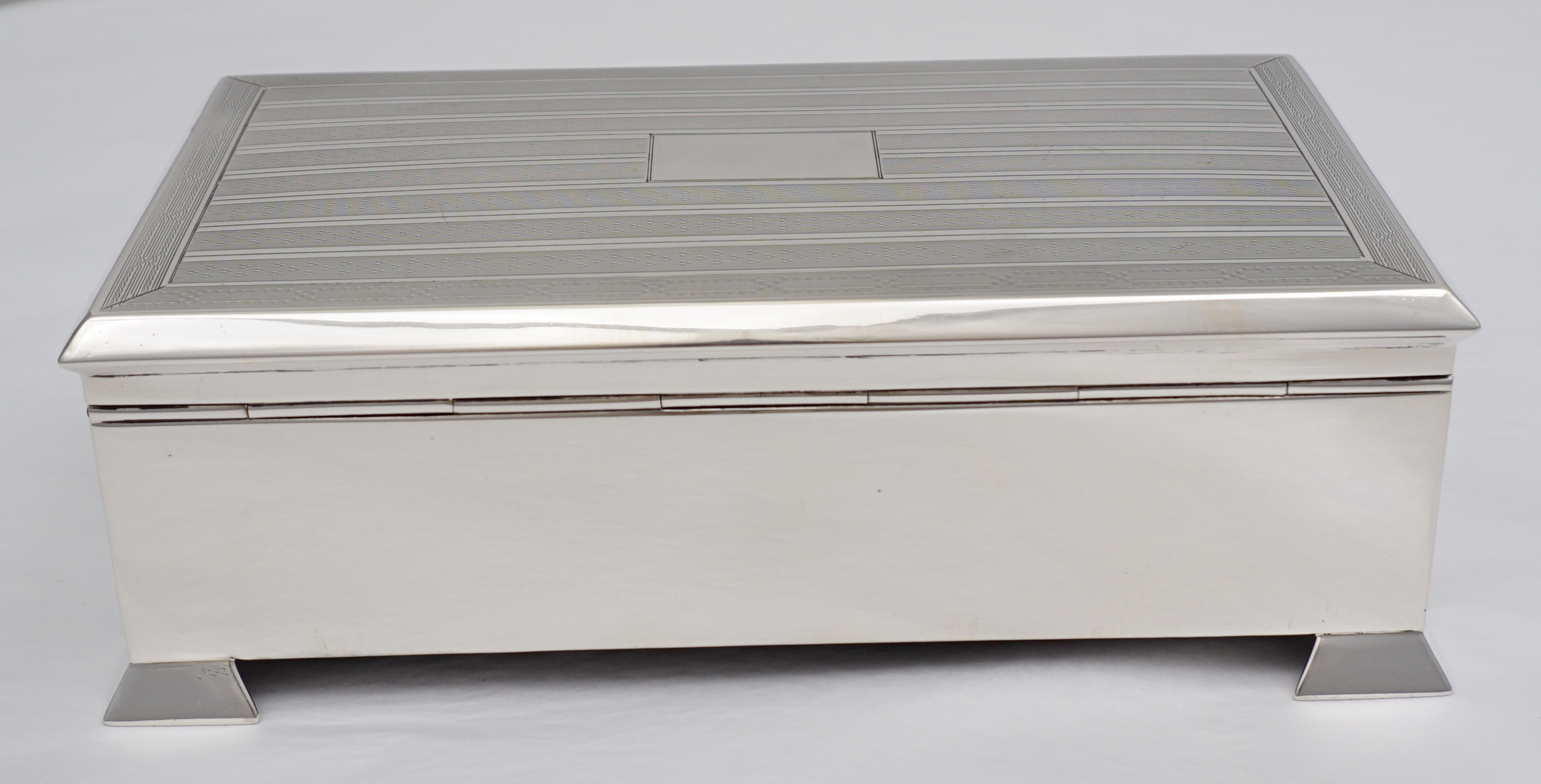 DESCRIPTION | Magnificent, high quality and stylish English sterling silver Art Deco cigarette box with a piano hinged and engine turned engraved lid with a blank cartouche, four bracket feet and a fully fitted and complete cedar interior that still smells good. |