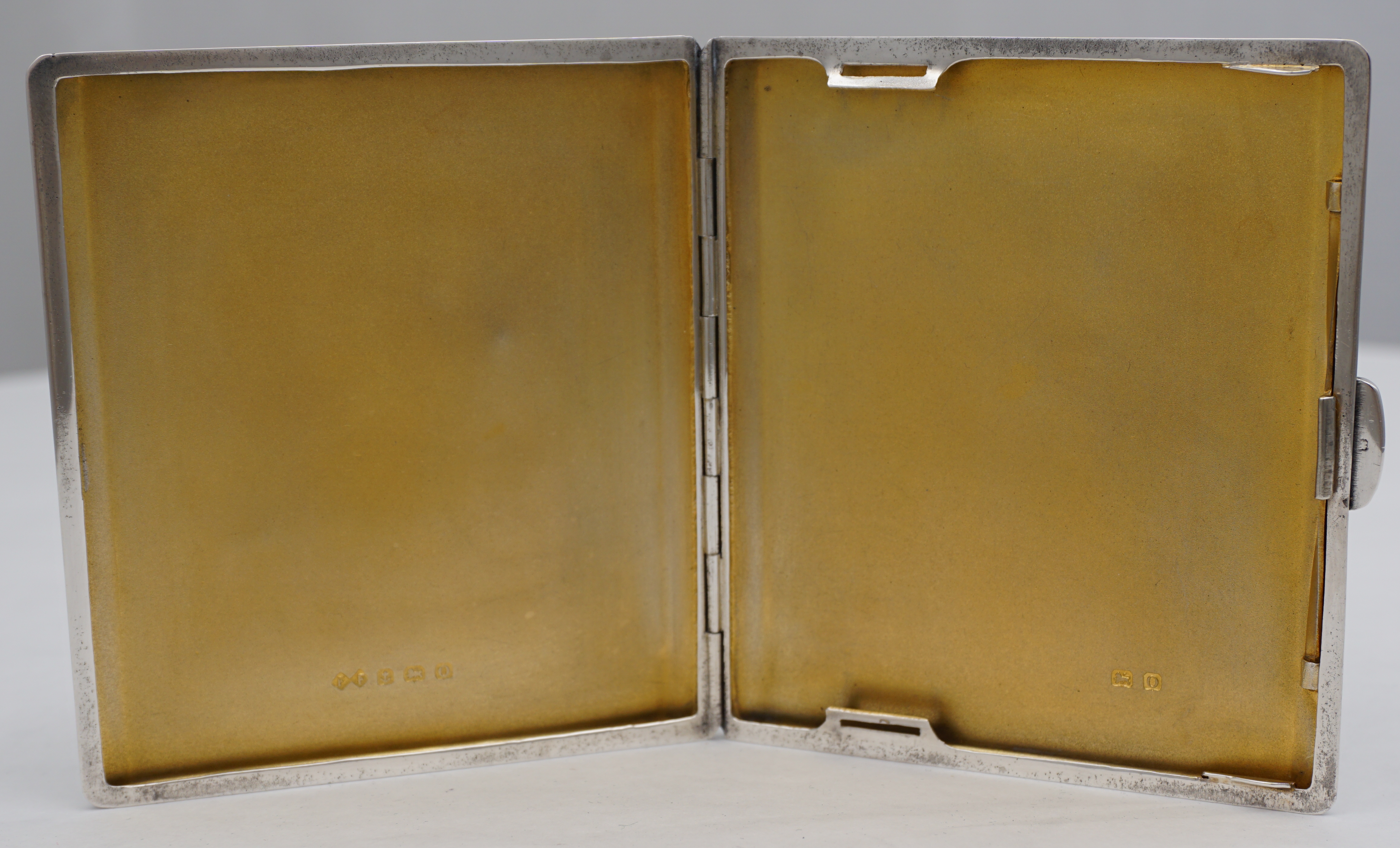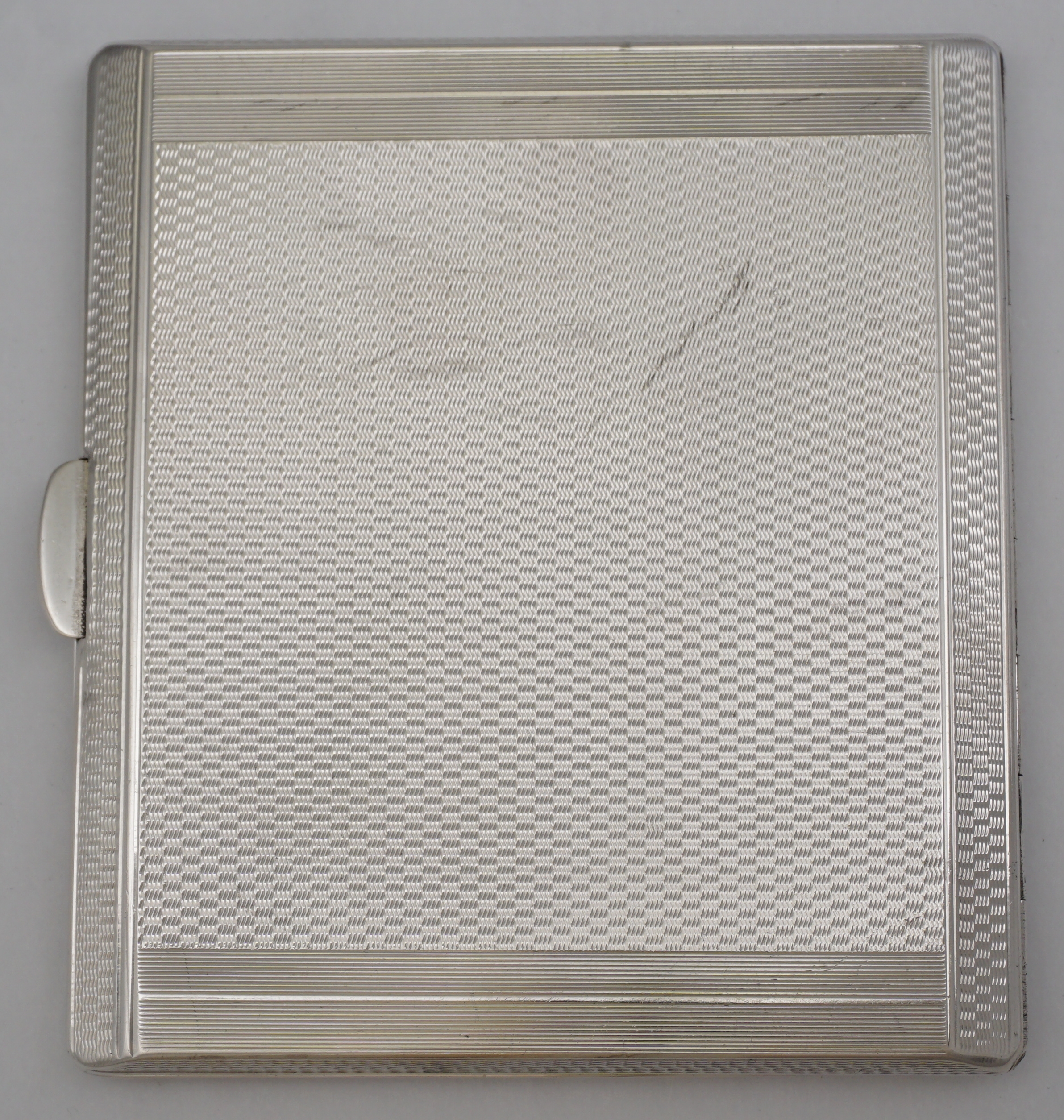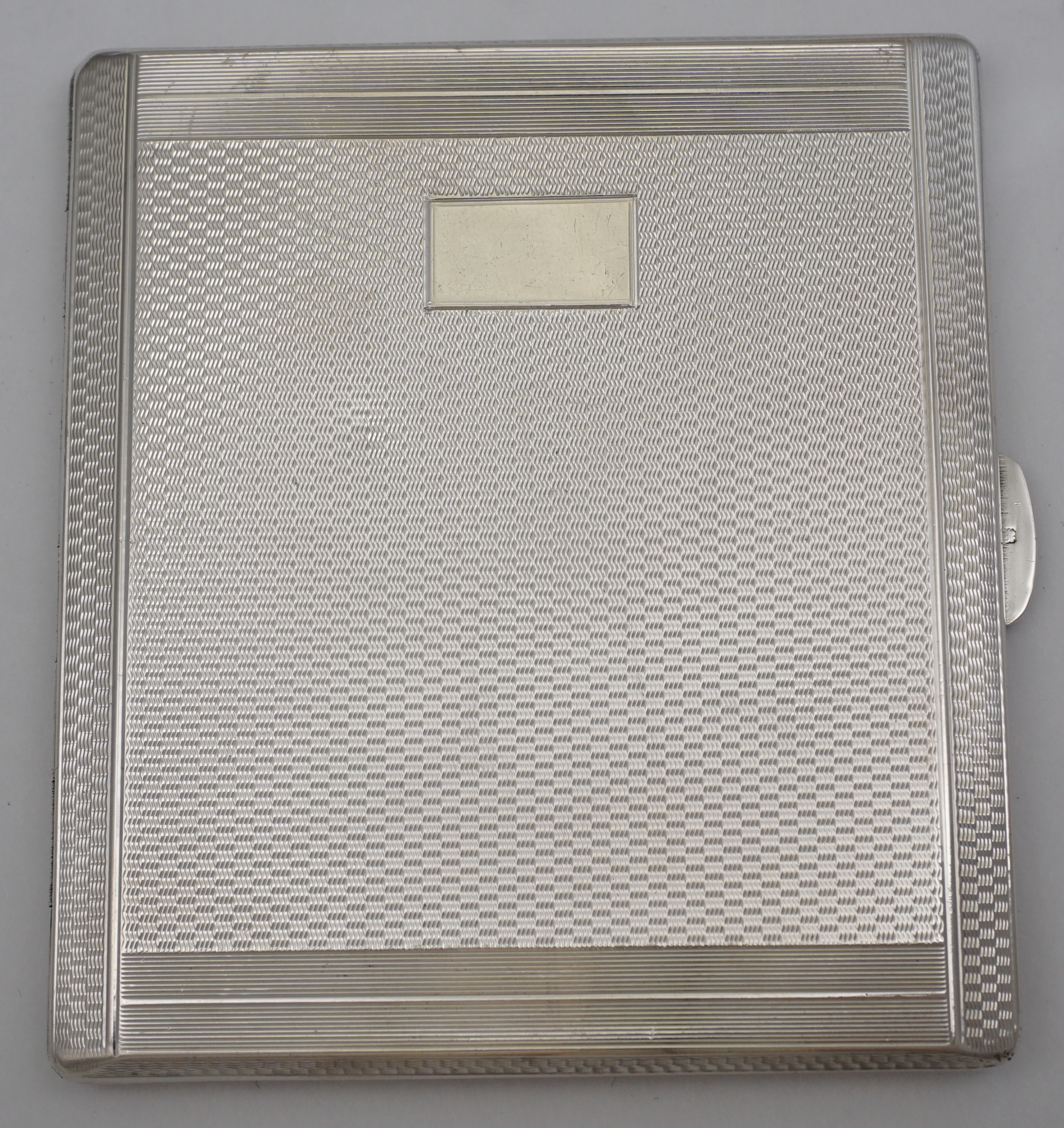 DESCRIPTION | Good and heavy vintage Art Deco English solid sterling silver cigarette case with a matt gilded interior, engine turned engraved decoration, blank cartouche and a spring action hinge. Will take credit cards perfectly lengthwise. |