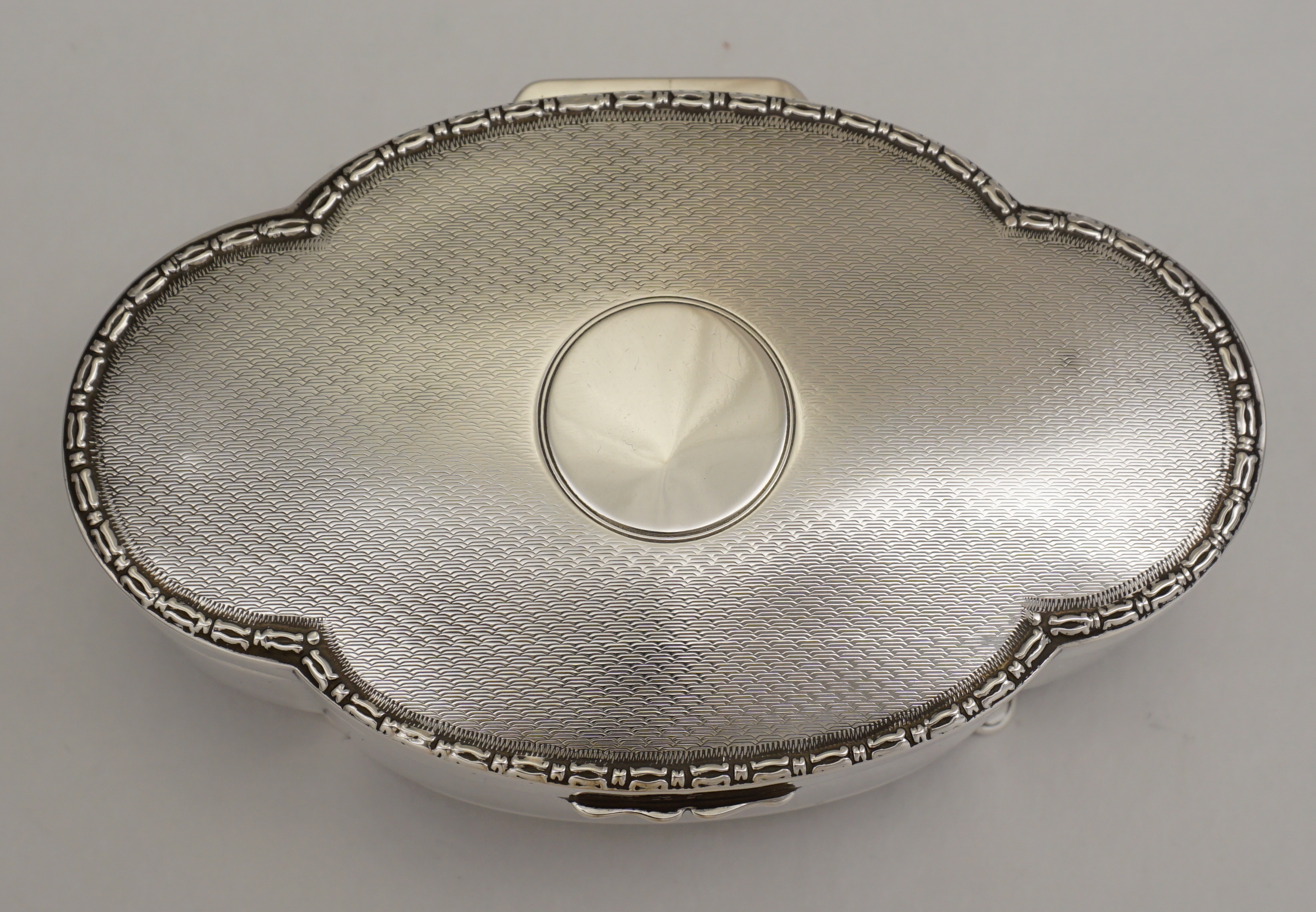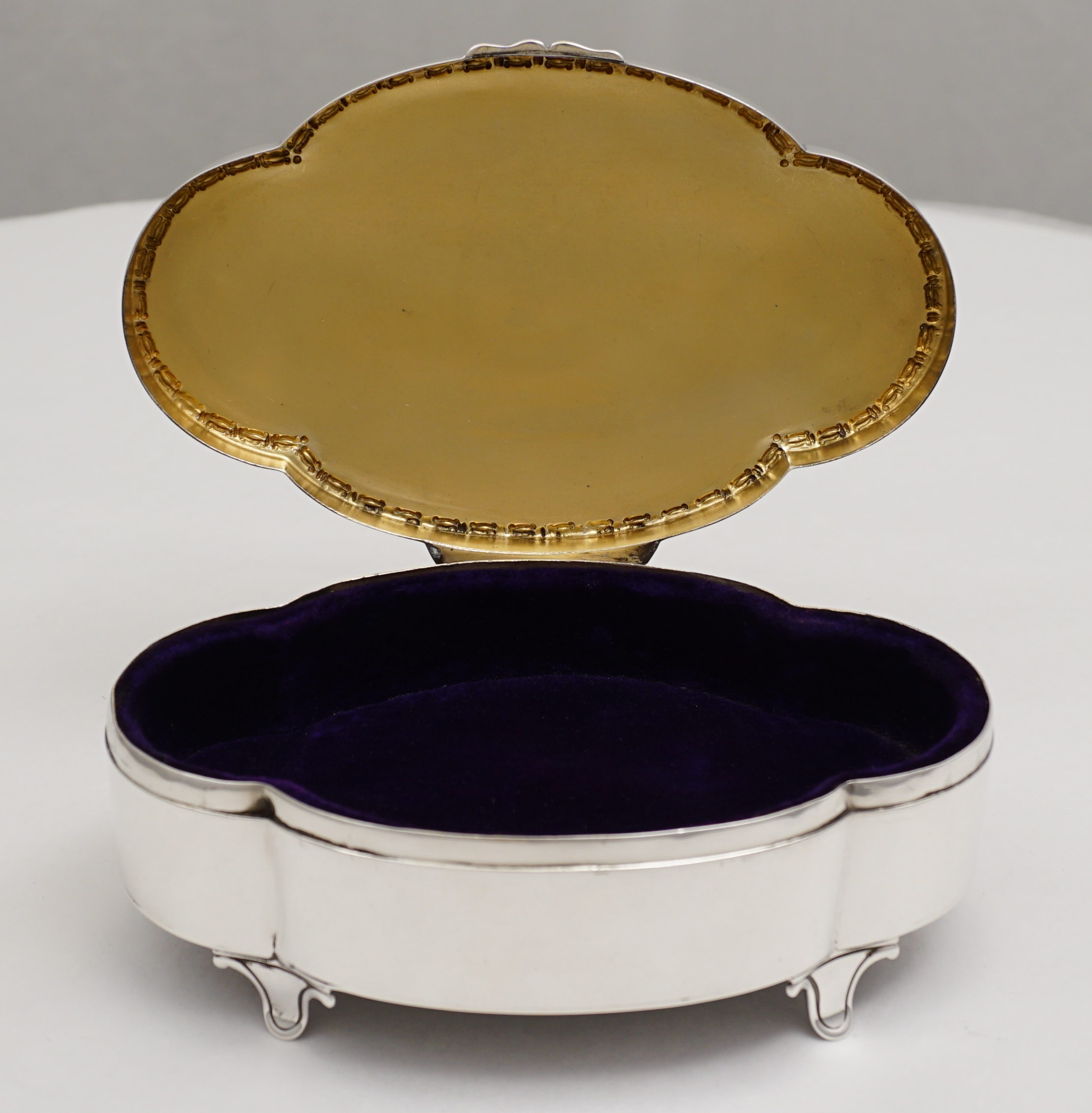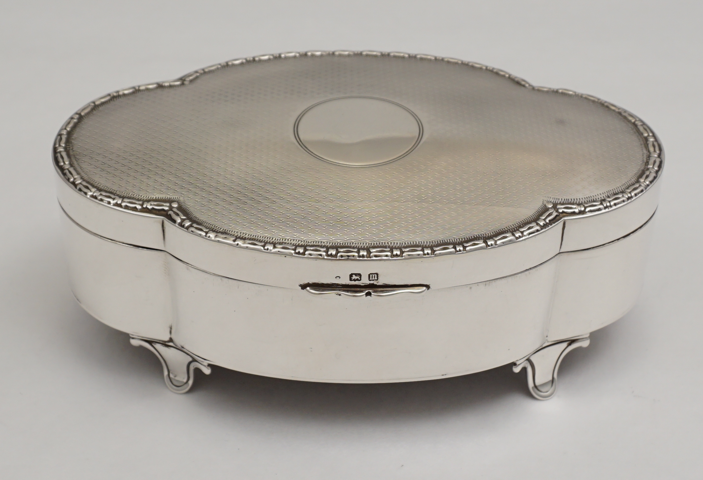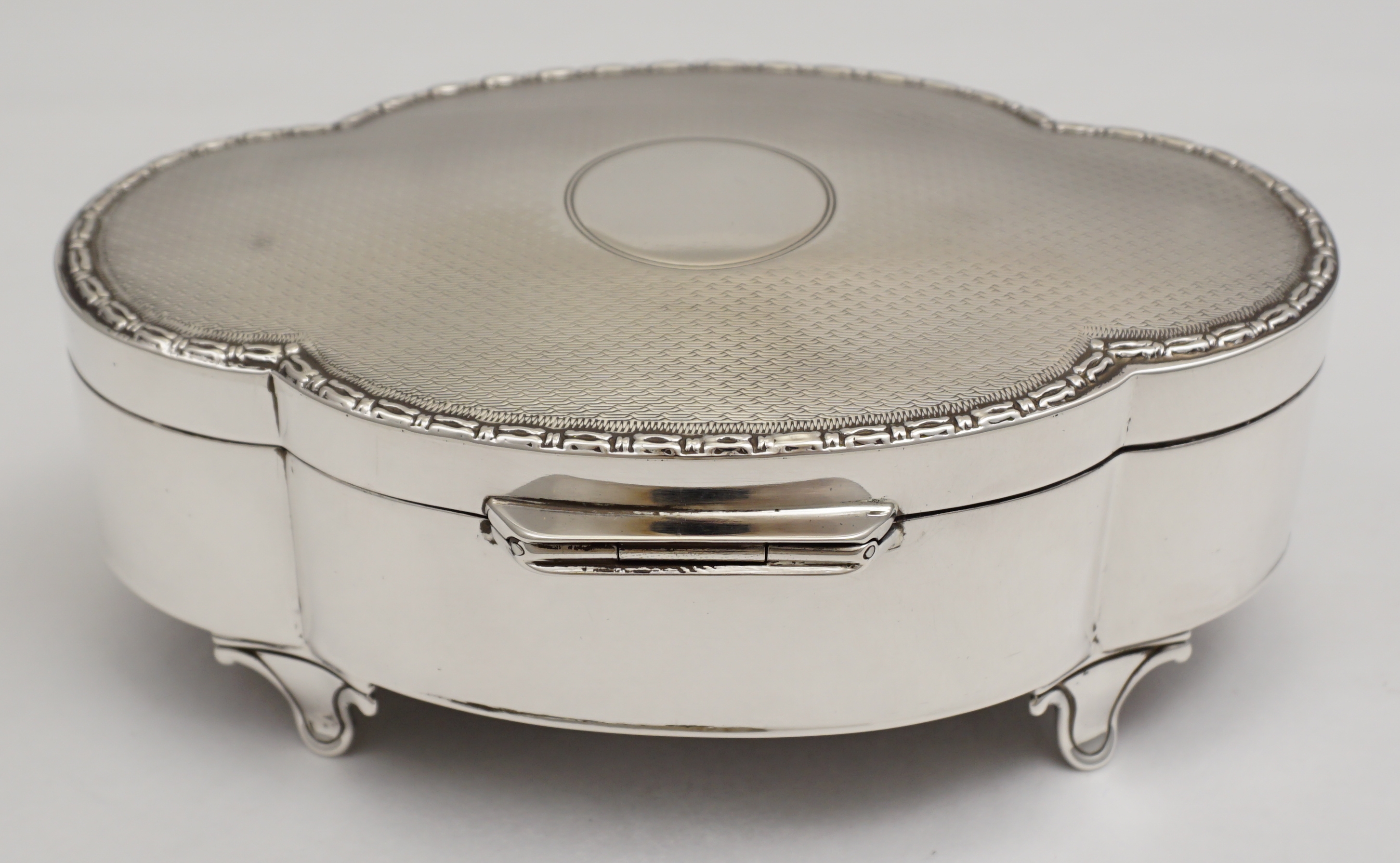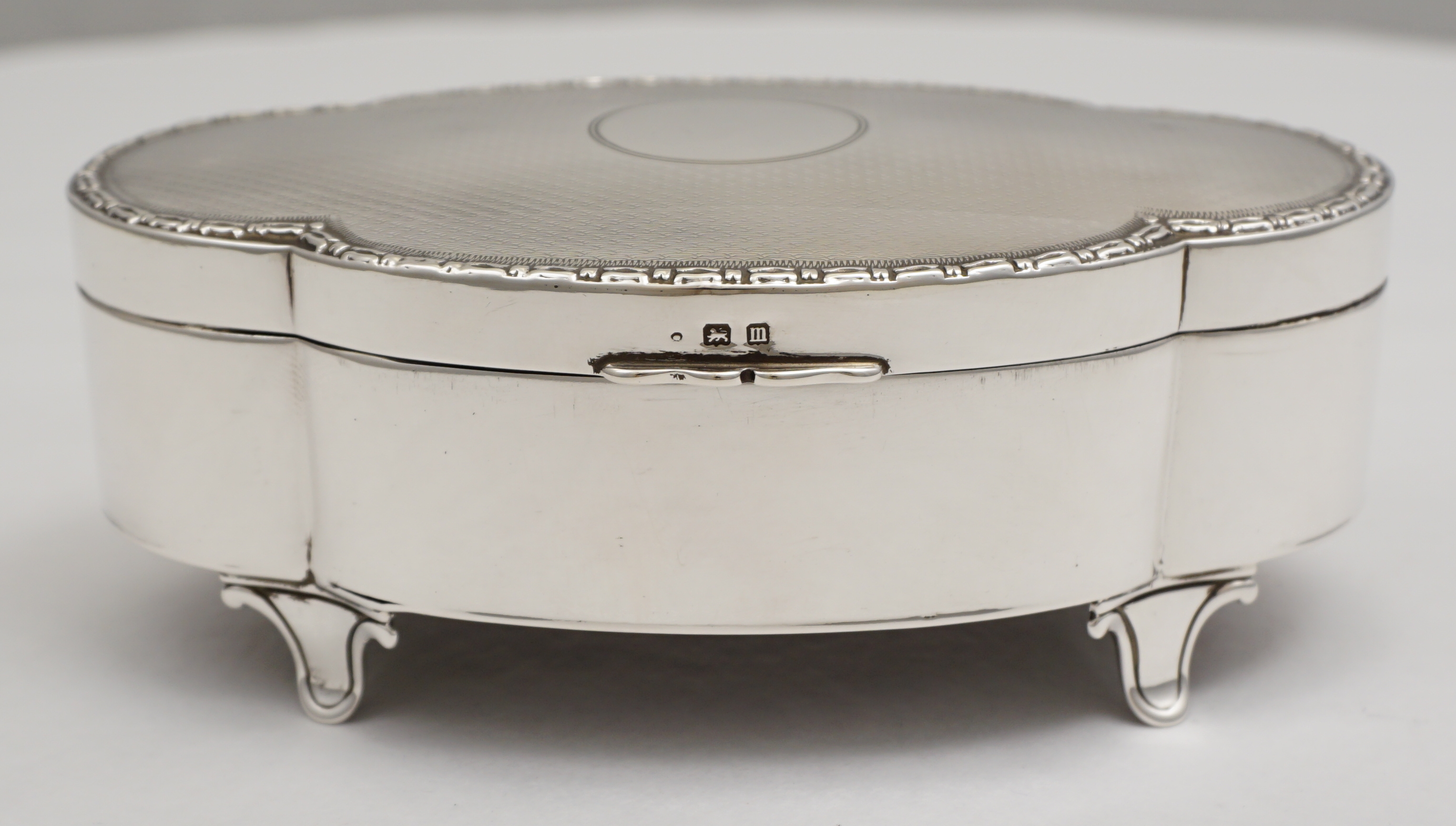 DESCRIPTION | Very good and large vintage English solid sterling silver trinket box on four bracket feet and with engine turned engraved decoration and a blank circular cartouche to the lid. Beautiful purple velvet lined interior with a matt gilded lid that still smells faintly of Edwardian lady. |