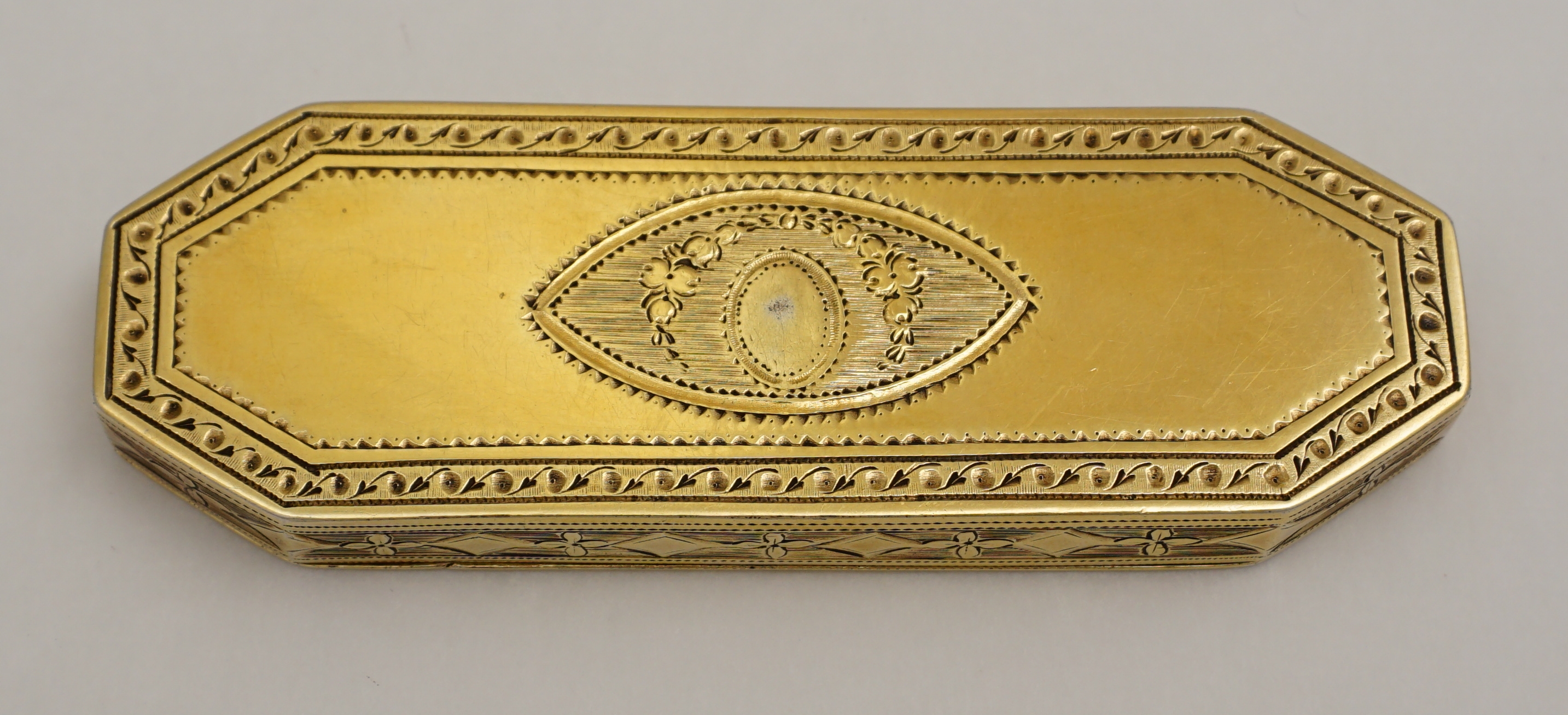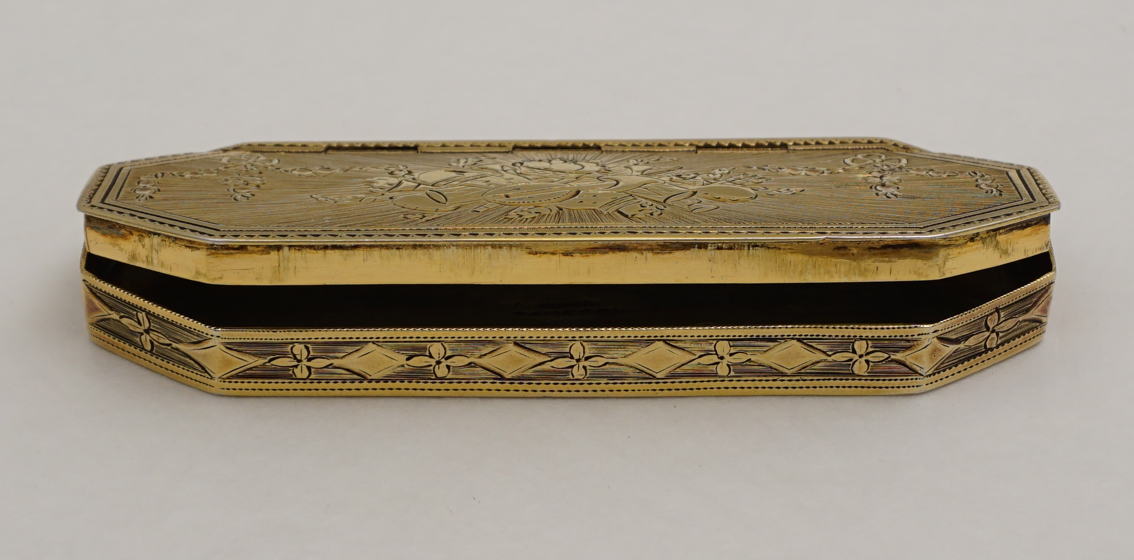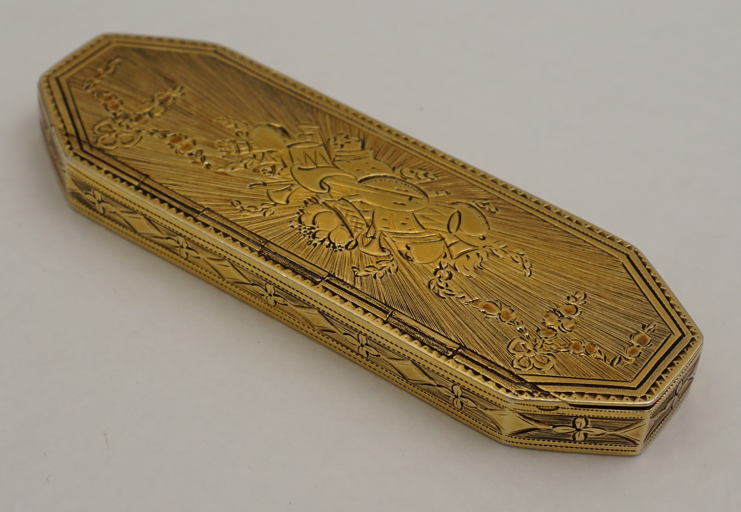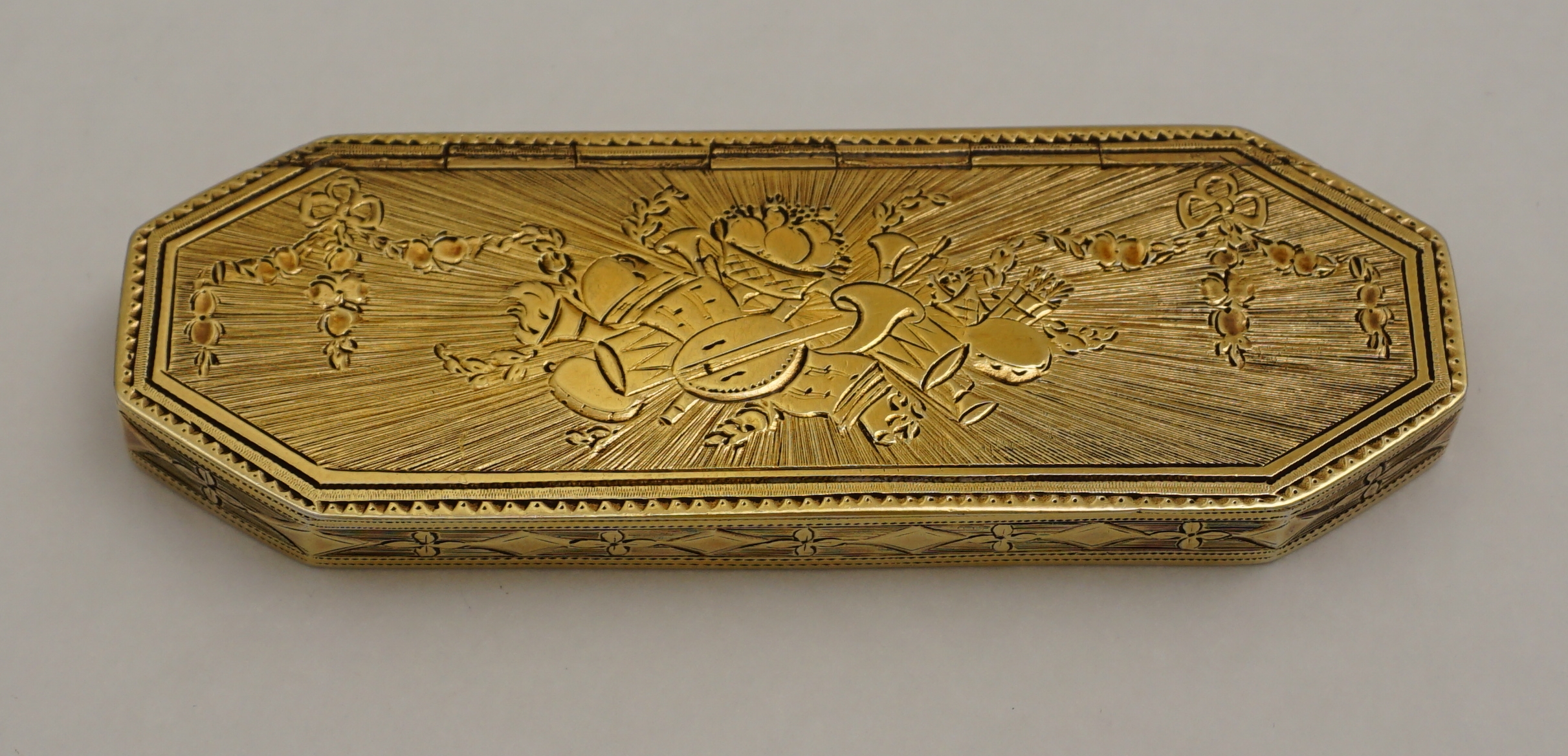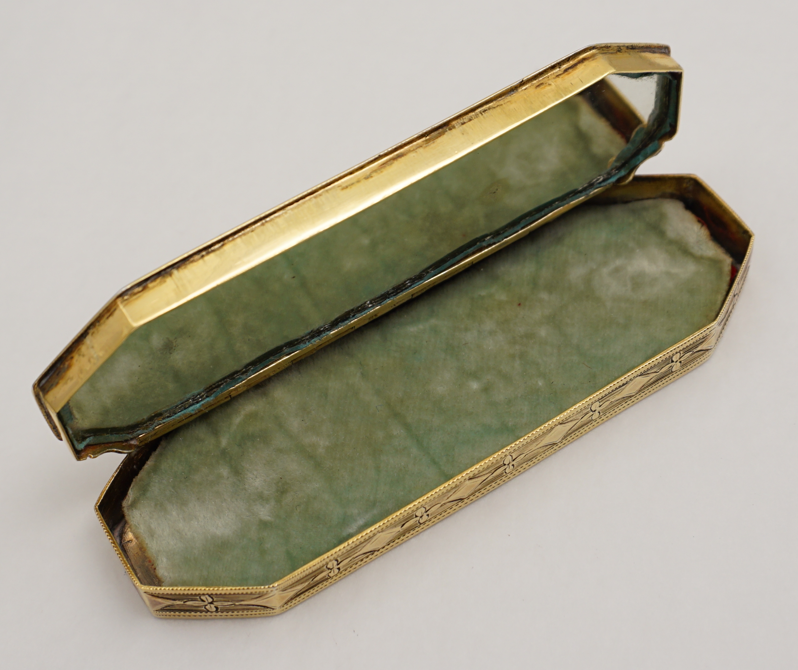 DESCRIPTION | Finest antique English Georgian solid sterling silver gilt toothpick case with Bright-cut engraved decoration featuring fruit, garlands and musical instruments, a concealed hinge, blank cartouche, beautifully struck hallmarks, mirror inset lid and the original mercurial gilding. |
