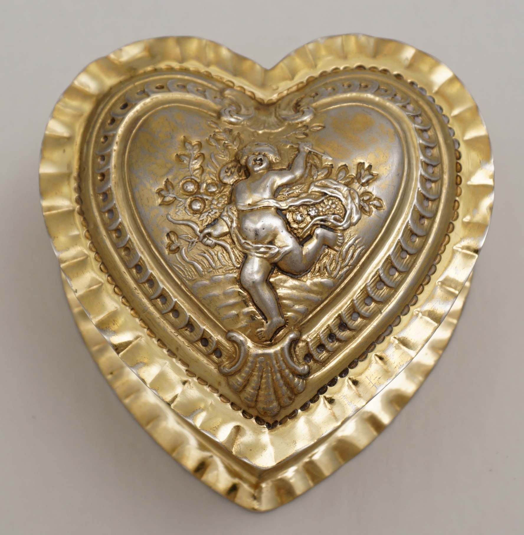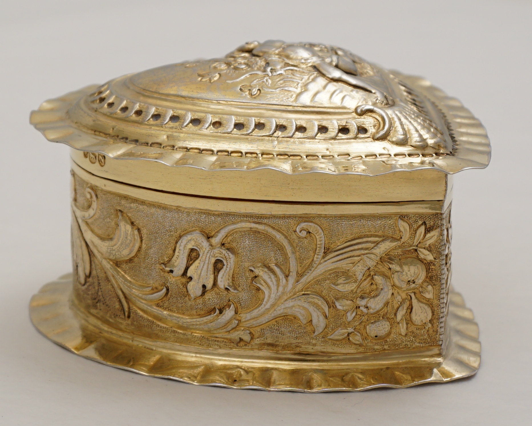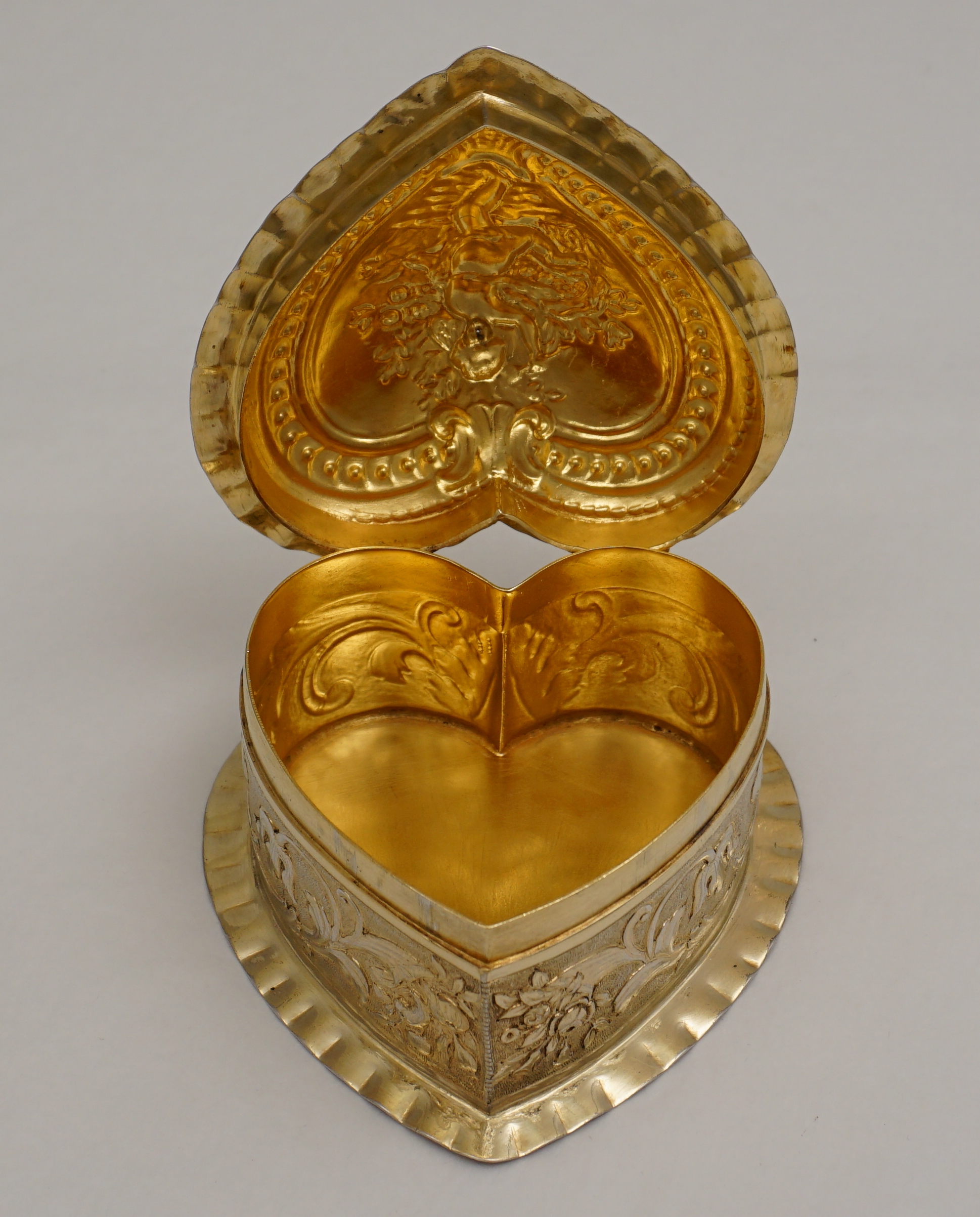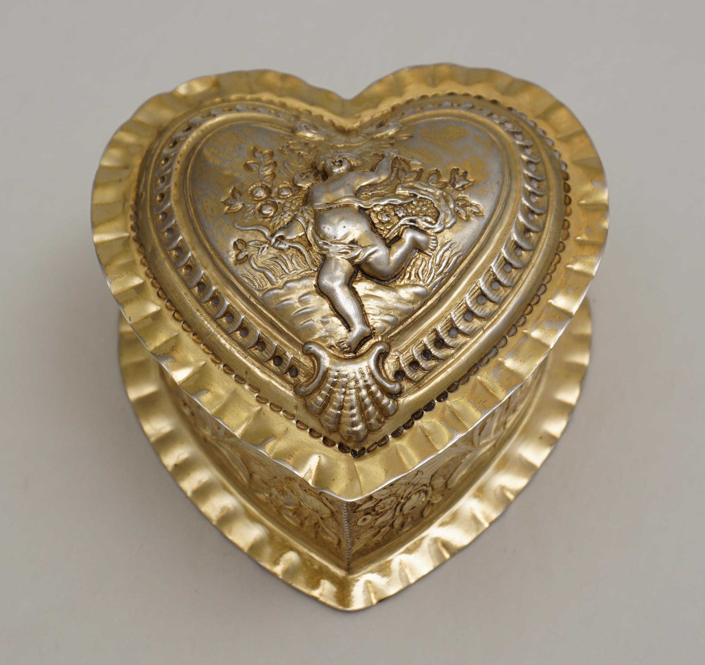 DESCRIPTION | Exceptionally good, high quality, antique solid sterling silver gilt heart shaped box decorated to the lid with Cupid. Imported through London in 1888 from continental Europe and there is a European hallmark and assayer's scrape to the base. Cupid has a tiny central nostril that is not a rubbed hole but most likely a pressure balance for the very well fitting lid. This type of box is often cheaply made of quite thin metal. This is the exception, it is gorgeous. |