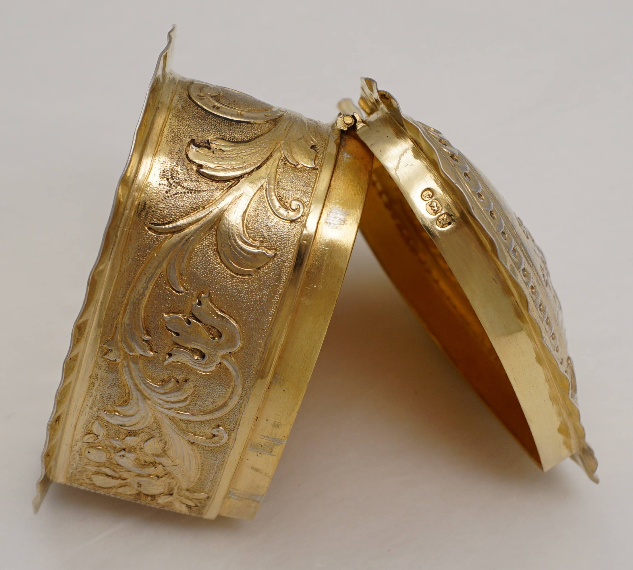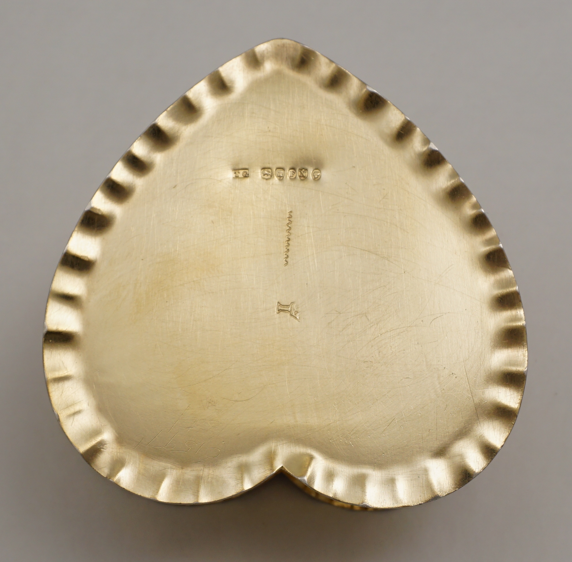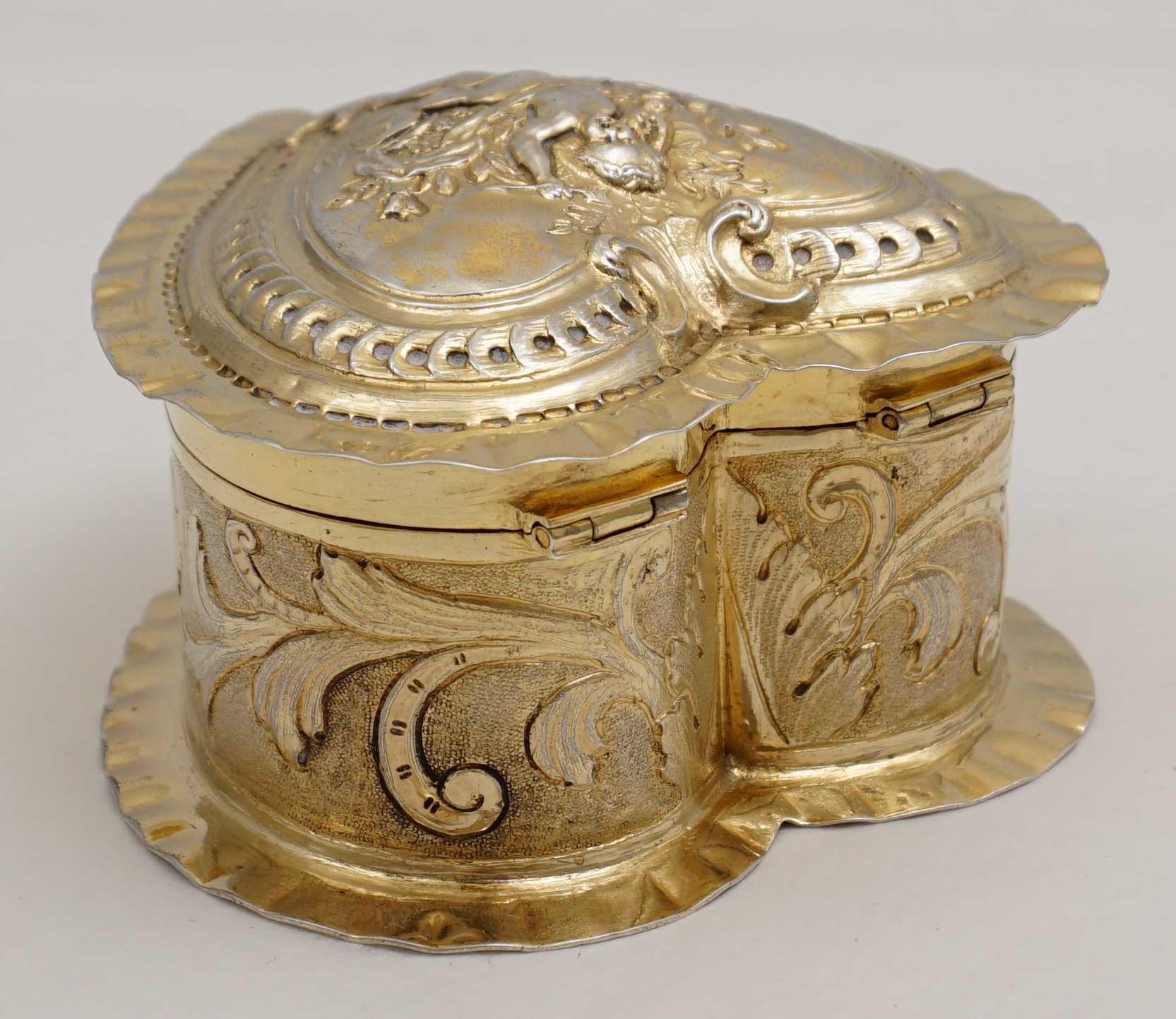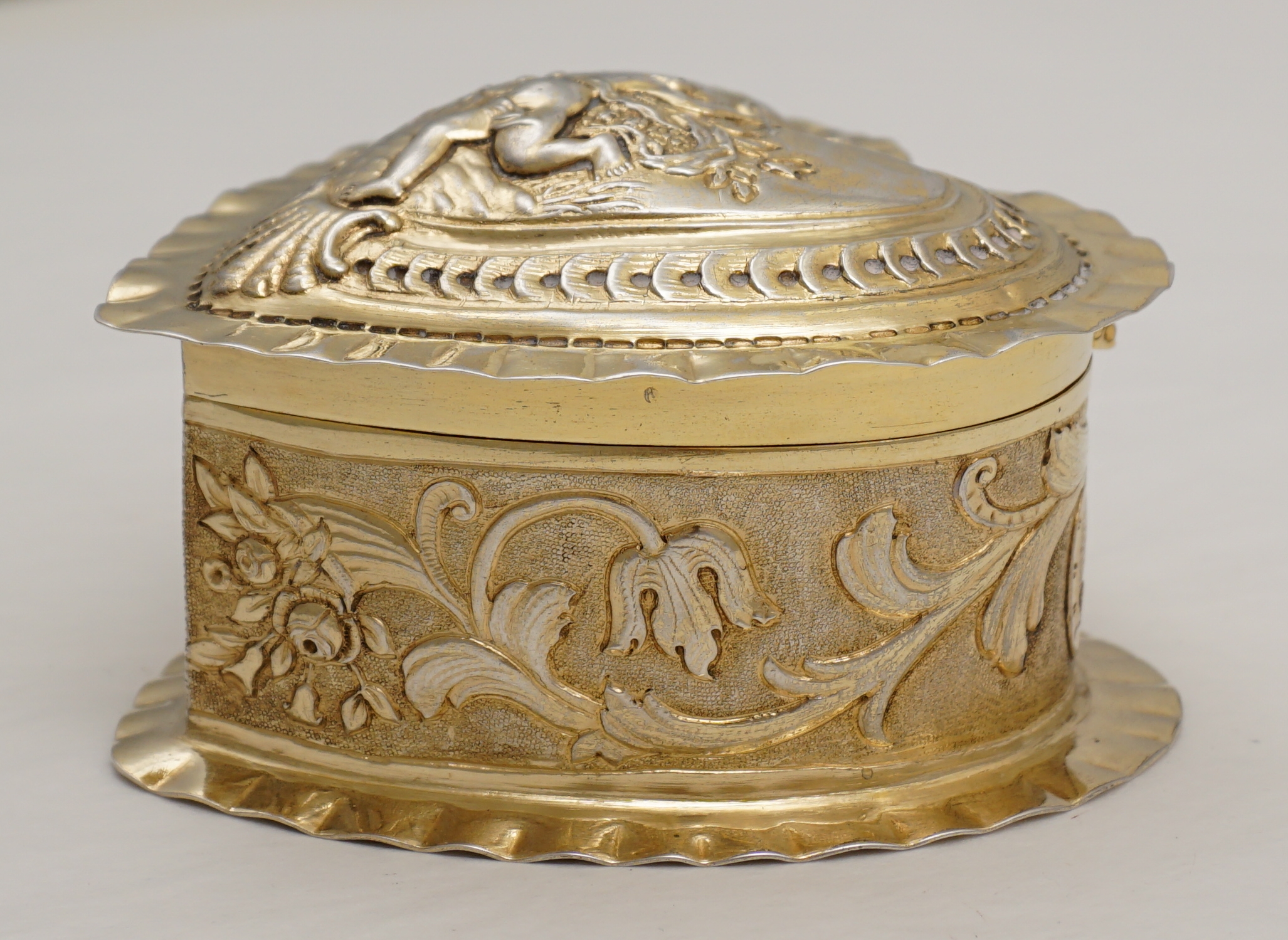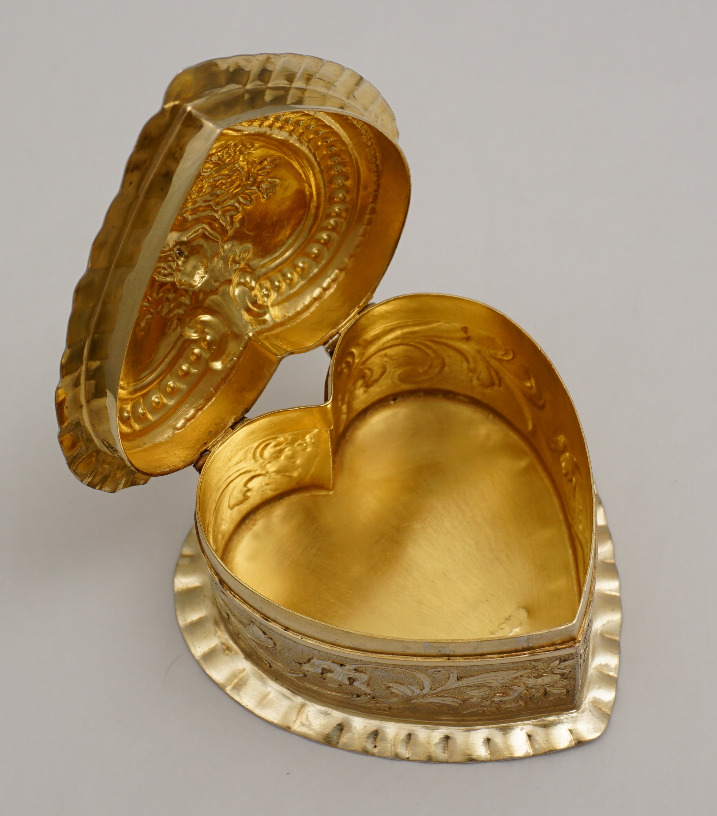 DESCRIPTION | Exceptionally good, high quality, antique solid sterling silver gilt heart shaped box decorated to the lid with Cupid. Imported through London in 1888 from continental Europe and there is a European hallmark and assayer's scrape to the base. Cupid has a tiny central nostril that is not a rubbed hole but most likely a pressure balance for the very well fitting lid. This type of box is often cheaply made of quite thin metal. This is the exception, it is gorgeous. |