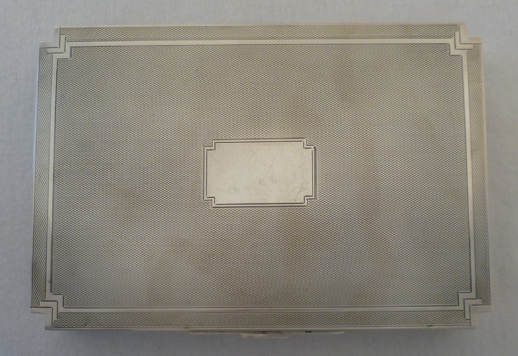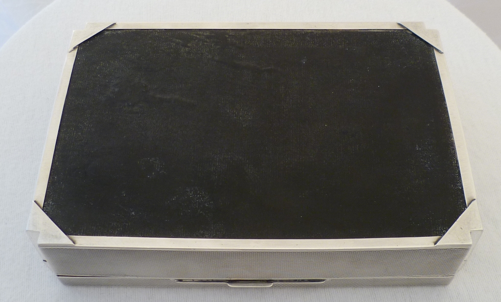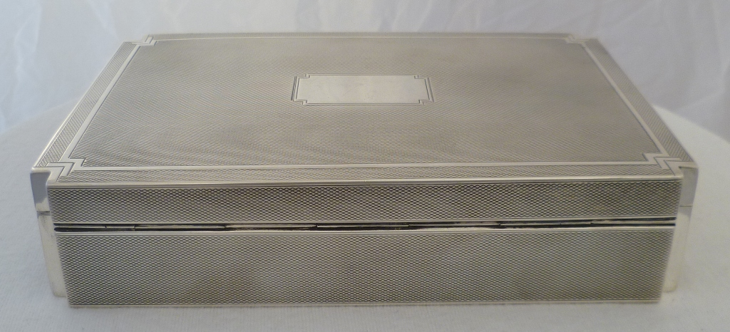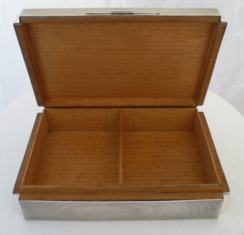 DESCRIPTION | Heavy silver cigarette box with a cedar wood lining, moveable partition and blank silver cartouche to the lid that has not been engraved. |