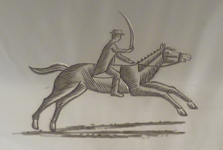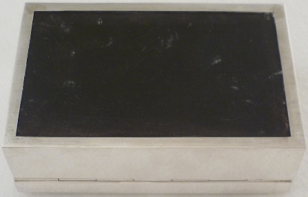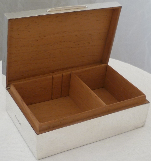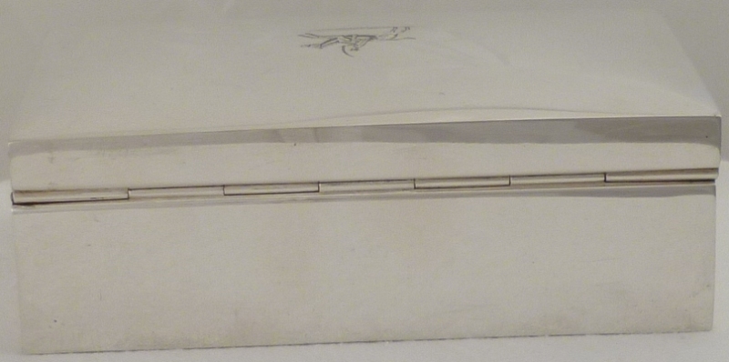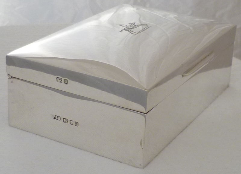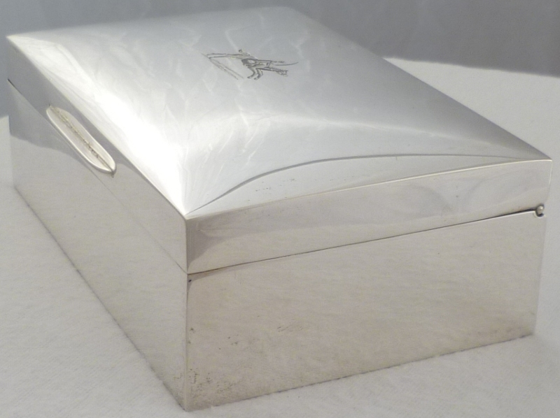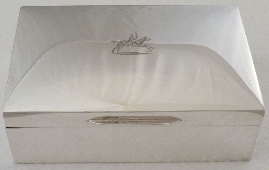 DESCRIPTION | Finest quality and perfect silver cigarette box with a cedar wood lining and lid engraved with a 19th century horse and jockey. |