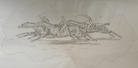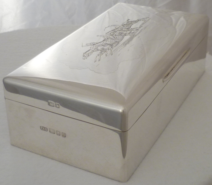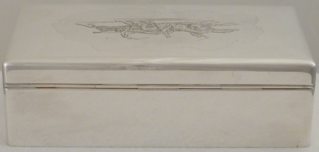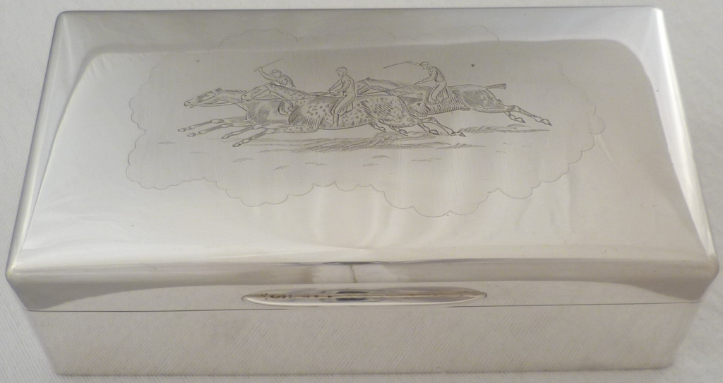 DESCRIPTION | Finest quality and perfect silver cigarette box with a cedar wood lining and lid engraved with a Georgian horse racing scene. |