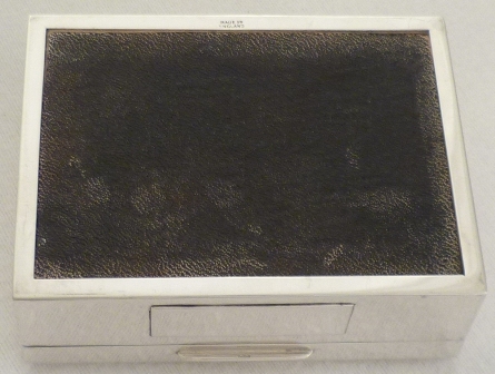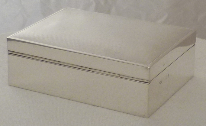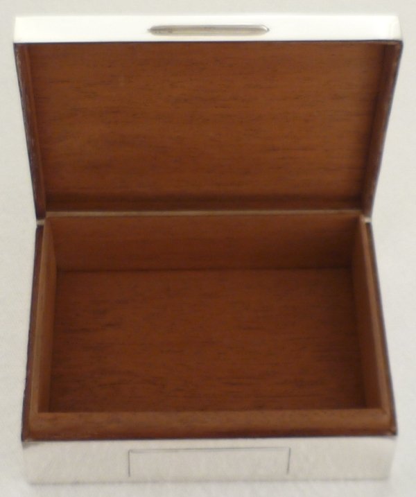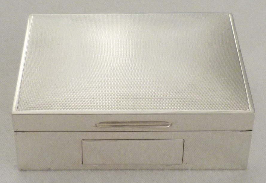 DESCRIPTION | Good quality silver cigarette box with engine turned decoration to the lid, blank presentation plaque to the front, cedar wood lining and a piano hinge. |