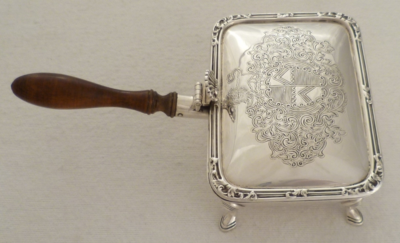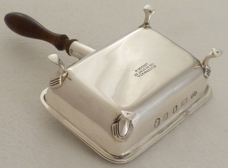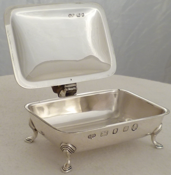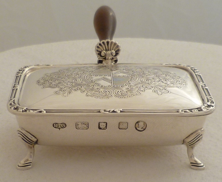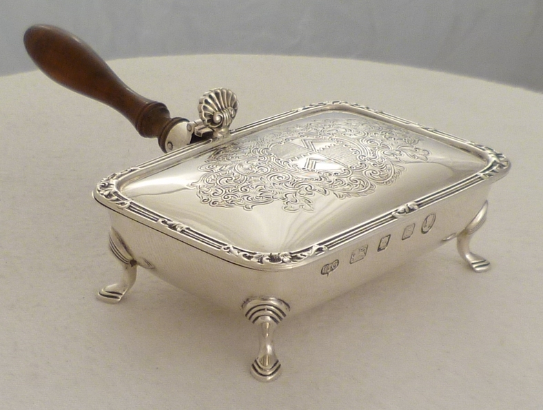 DESCRIPTION | Fine quality silver box with a turned wood handle. The hinged lid with a shell thumb piece and fancy crest engraving. These boxes are sometimes described as ash trays but they really only work as such if your valet will hold it for you. Being the exact length of a standard (not king size) mid 20th century cigarette they work much better as a cigarette box from which to pass out cigarettes in a social situation. Today it has a multitude of uses. |