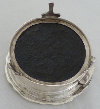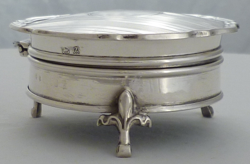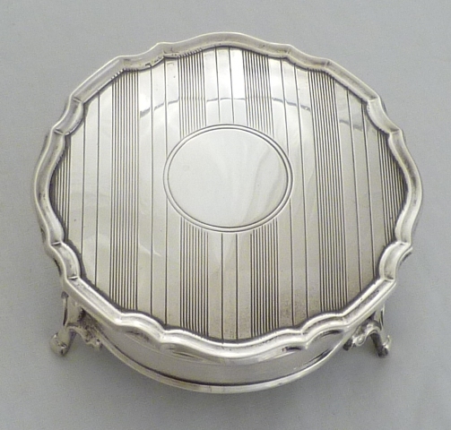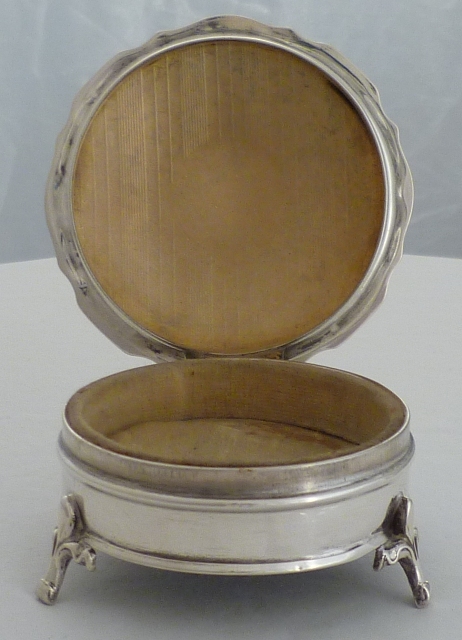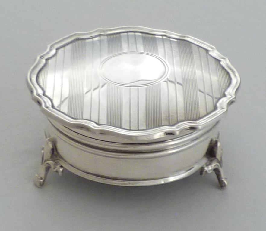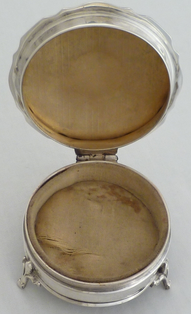DESCRIPTION | Pretty circular silver trinket box with engine turned decoration, gilding to the the lid interior and original velvet and silk fitted interior. The circular cartouche to the lid has never been engraved or erased. |